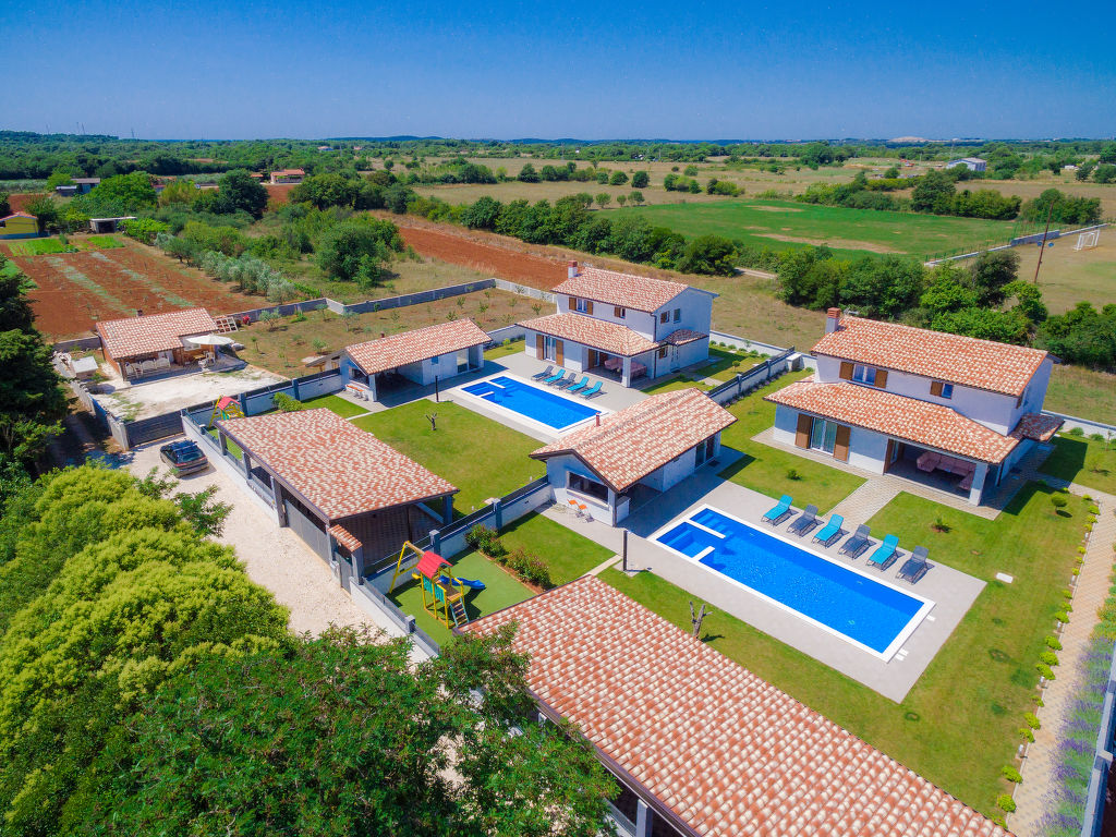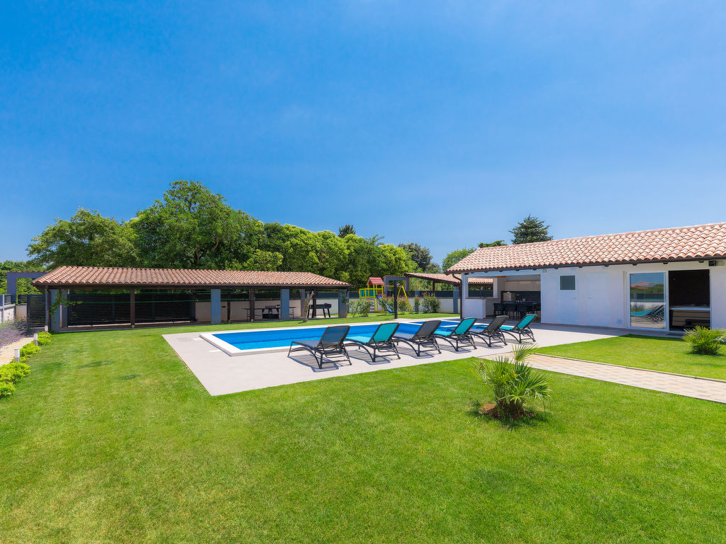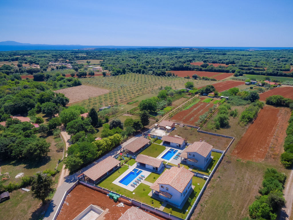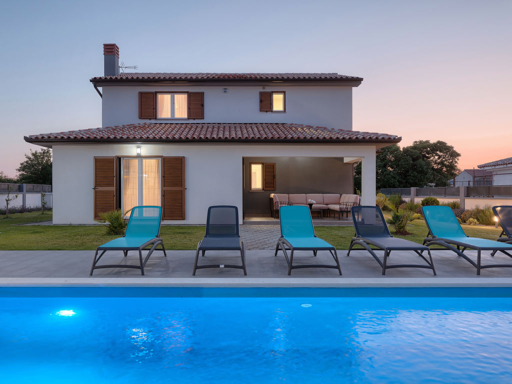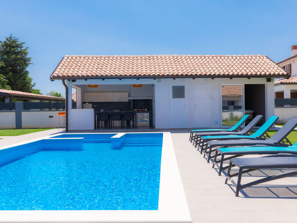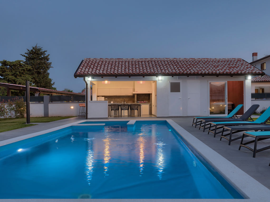 Šišan 5 km von Medulin: Schöne Villa "Alba Rossa", auf 2 Stockwerken, Baujahr 2019. 900 m vom Zentrum von Šišan, 8 km vom Zentrum von Pula, ruhige, sonnige Lage, 2 km vom Meer, 2 km vom Strand. Zur Alleinbenutzung: Grundstück 1'000 m2 (eingezäunt), schöner Garten mit Rasen und Pflanzen, Schwimmbad eckig (10 x 5 m, 140 cm tief, 04.04.-24.10.) mit Innentreppe. WC im Poolbereich, Aussendusche, Poolhaus mit Dusche, Tischtennis, Gartenmöbel, Grill, Kinderspielplatz (Rutschbahn, Schaukel). Im Hause: Internetzugang, Sprudelbad, Infrarotwärmekabine, Tischfussball, Trampolin, Waschmaschine. Zufahrt bis zum Haus (300 m Naturweg). Parkplatz (für 2 Autos, überdacht) beim Haus auf dem Grundstück. Einkaufsgeschäft 800 m, Supermarkt 6 km, Restaurant 650 m, Kieselstrand 2 km, Felsstrand 2 km. Surfschule 4 km, Segelschule 4 km, Tennis 6 km, Reitstall 1 km, Wanderwege ab Haus 100 m, Radweg 150 m. Schwimmbad mit Hydromassage. Privat: Aussenküche (2 Kochplatten aus Keramikglas, Backofen, Geschirrspüler, Gefrierschrank, elektrische Kaffeemaschine).