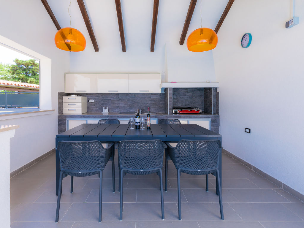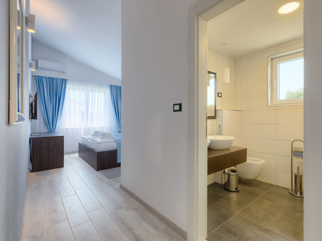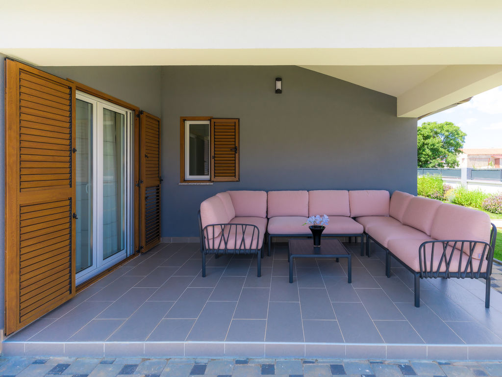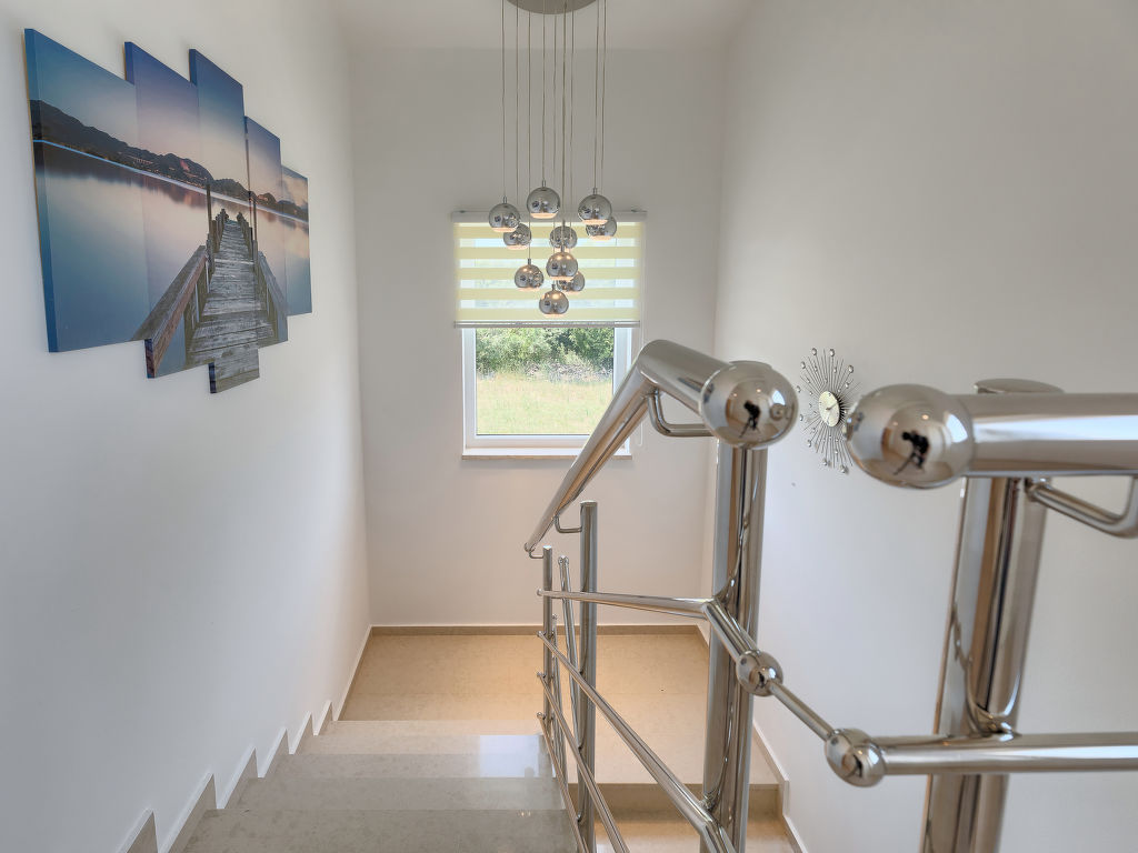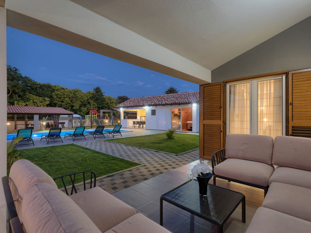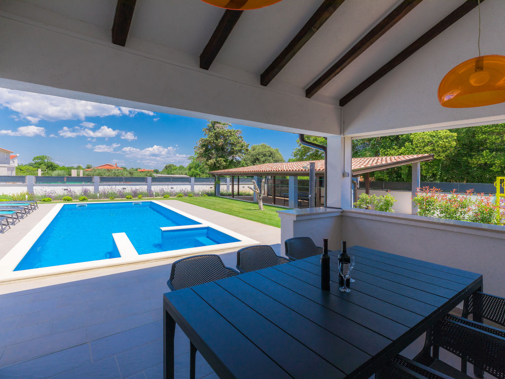 Šišan 5 km von Medulin: Schöne Villa "Alba Rossa", auf 2 Stockwerken, Baujahr 2019. 900 m vom Zentrum von Šišan, 8 km vom Zentrum von Pula, ruhige, sonnige Lage, 2 km vom Meer, 2 km vom Strand. Zur Alleinbenutzung: Grundstück 1'000 m2 (eingezäunt), schöner Garten mit Rasen und Pflanzen, Schwimmbad eckig (10 x 5 m, 140 cm tief, 04.04.-24.10.) mit Innentreppe. WC im Poolbereich, Aussendusche, Poolhaus mit Dusche, Tischtennis, Gartenmöbel, Grill, Kinderspielplatz (Rutschbahn, Schaukel). Im Hause: Internetzugang, Sprudelbad, Infrarotwärmekabine, Tischfussball, Trampolin, Waschmaschine. Zufahrt bis zum Haus (300 m Naturweg). Parkplatz (für 2 Autos, überdacht) beim Haus auf dem Grundstück. Einkaufsgeschäft 800 m, Supermarkt 6 km, Restaurant 650 m, Kieselstrand 2 km, Felsstrand 2 km. Surfschule 4 km, Segelschule 4 km, Tennis 6 km, Reitstall 1 km, Wanderwege ab Haus 100 m, Radweg 150 m. Schwimmbad mit Hydromassage. Privat: Aussenküche (2 Kochplatten aus Keramikglas, Backofen, Geschirrspüler, Gefrierschrank, elektrische Kaffeemaschine).
