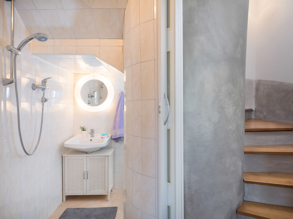 Doppelhaus "Villa Domenica", auf 2 Stockwerken, aus dem 18. Jahrhundert, renoviert. 1.1 km vom Zentrum von Trget, ausserhalb des Ortes, ruhige, sonnige, erhöhte Lage, 900 m vom Meer, 900 m vom Strand, in einer Sackgasse. Zur Alleinbenutzung: Grundstück 700 m2, Garten mit Pflanzen, Schwimmbad eckig (8 x 3 m, 140 cm tief, 11.04.-24.10.) mit Innentreppe. Aussendusche, Terrasse (10 m2), Gartenmöbel, Grill, Kinderspielplatz (Schaukel). Im Hause: Internetzugang, Waschmaschine. Parkplatz (für 3 Autos) beim Haus auf dem Grundstück. Einkaufsgeschäft 1.1 km, Restaurant 600 m, Kieselstrand 900 m. Verfügbar: Hundebox (im Preis inbegriffen).