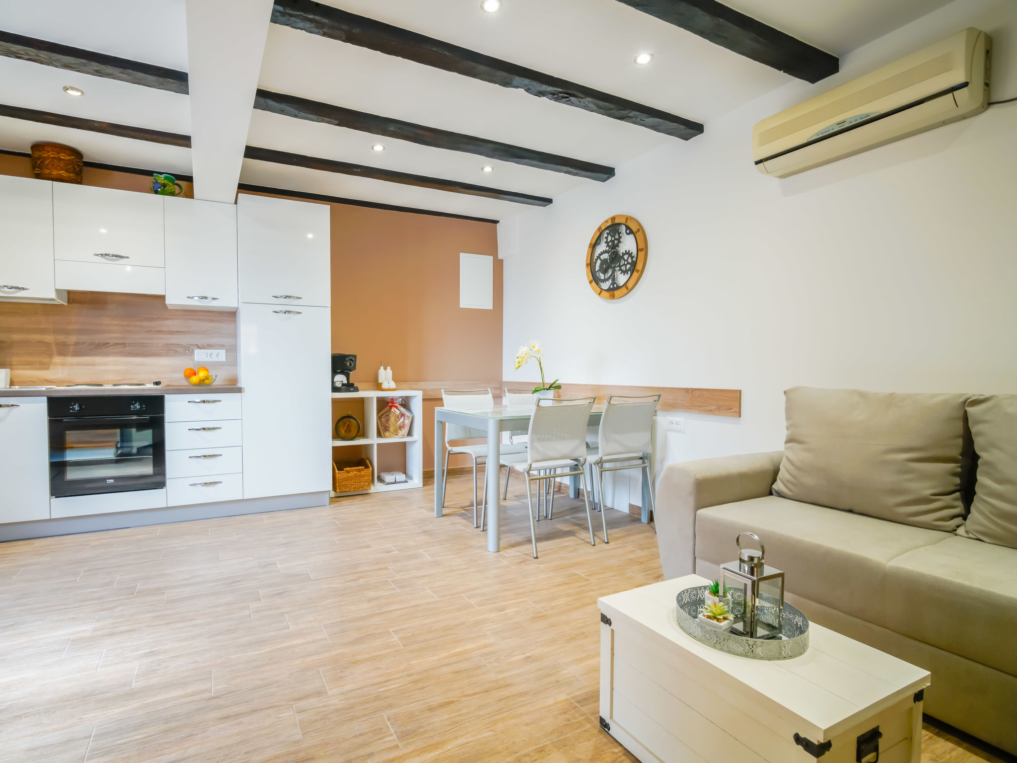 2-Zimmer-Wohnung 48 m2 auf 2 Stockwerken. Wohn-/Esszimmer 24 m2 mit 1 Diwanbett (100 cm, Länge 200 cm), Sat-TV (Flachbildschirm), Klimaanlage. Offene Küche (4 Kochplatten, Backofen, Tiefkühler, elektrische Kaffeemaschine). Obergeschoss: 1 offenes Zimmer mit 1 Bett (90 cm, Länge 200 cm), 1 franz. Bett (160 cm, Länge 200 cm), Dusche/WC und Klimaanlage. Ausgang zum Balkon. Klimaanlage (extra). Balkon 6 m2, Terrasse 25 m2 teilweise überdacht. Terrassenmöbel, Gartengrill. Herrliche Panoramasicht auf das Meer und die Landschaft. Zur Verfügung: Waschmaschine. Internet (Wireless LAN, gratis). Bitte beachten: Nichtraucher-Unterkunft. 1 Haustier/Hund erlaubt. Eigener Eingang.