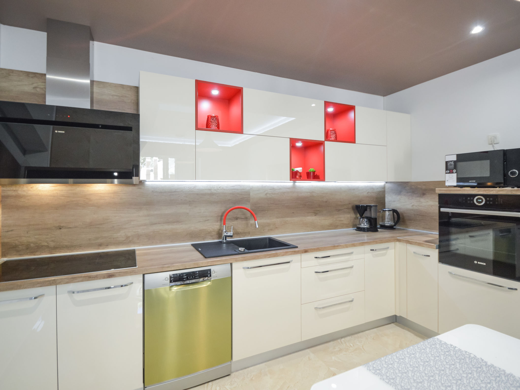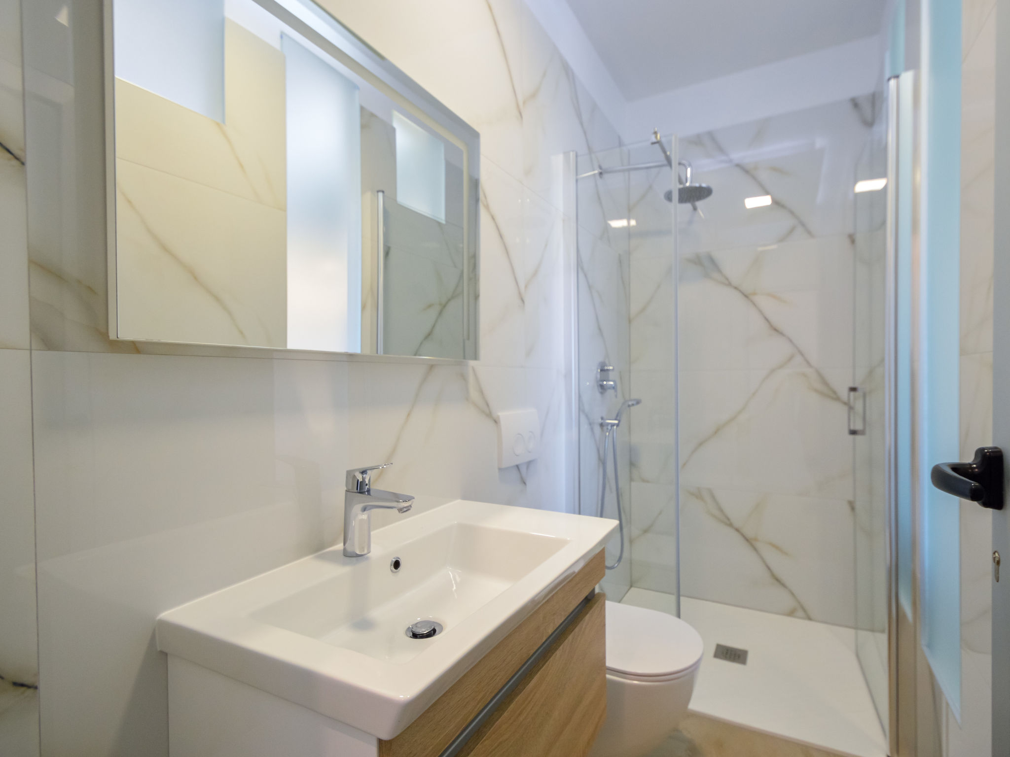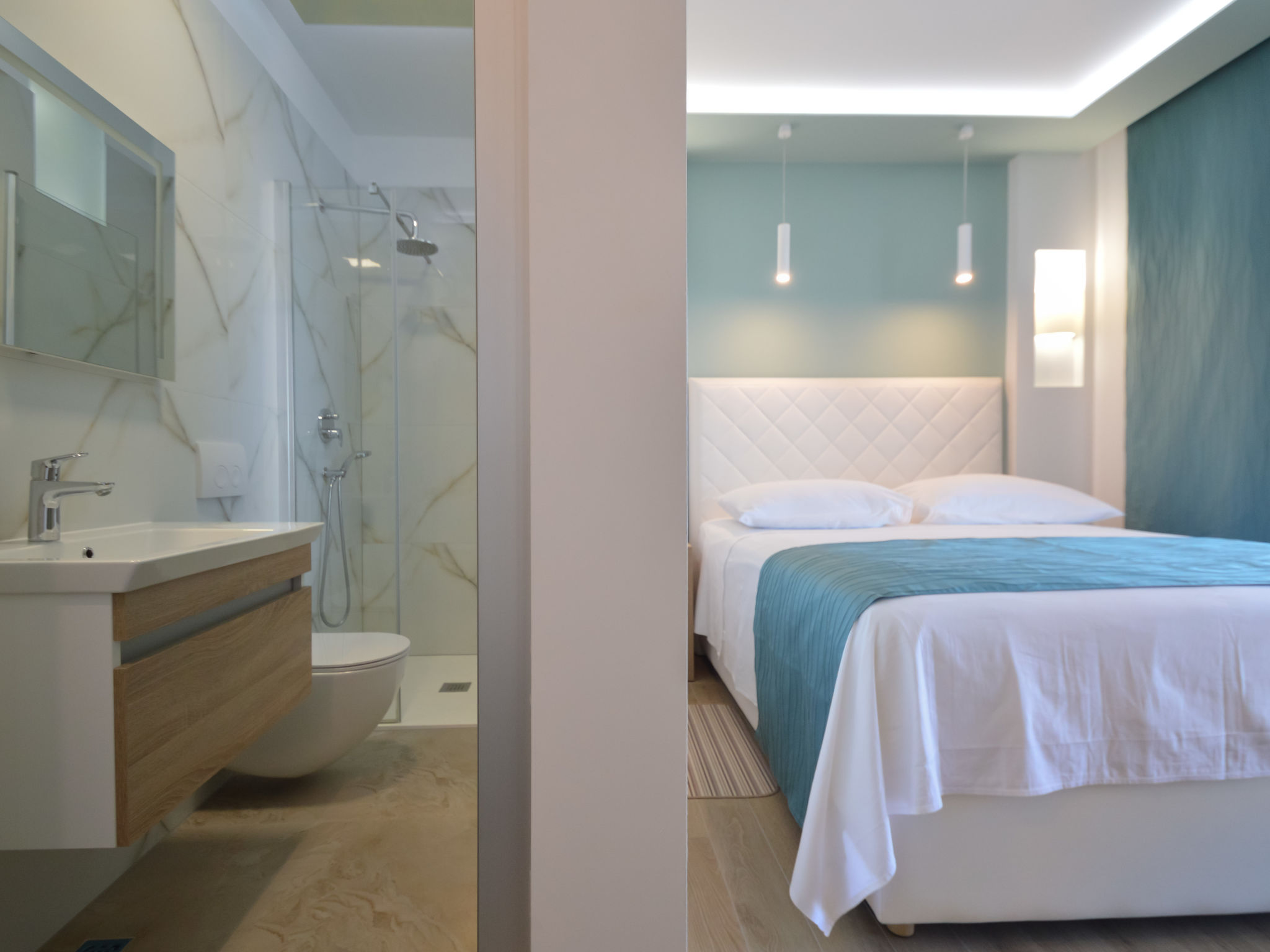 4-Zimmer-Wohnung 90 m2, im erhöhten Erdgeschoss, Nordwestlage. Wohn-/Esszimmer 24 m2 mit Sat-TV (Flachbildschirm), Klimaanlage. 3 Zimmer, jedes Zimmer mit 1 franz. Bett (160 cm, Länge 200 cm), Dusche/WC und Sat-TV (Flachbildschirm), Klimaanlage. Ausgang zur Terrasse. Offene Küche (Backofen, Geschirrspüler, 4 Glaskeramikherd Platten, Mikrowelle, Tiefkühler, elektrische Kaffeemaschine). Whirlbadewanne. Klimaanlage (extra). Terrasse 90 m2. Terrassenmöbel. Sicht auf das Meer. Zur Verfügung: Waschmaschine. Internet (Wireless LAN, gratis). Privat: Sprudelbad auf der Terrasse 90 m2.