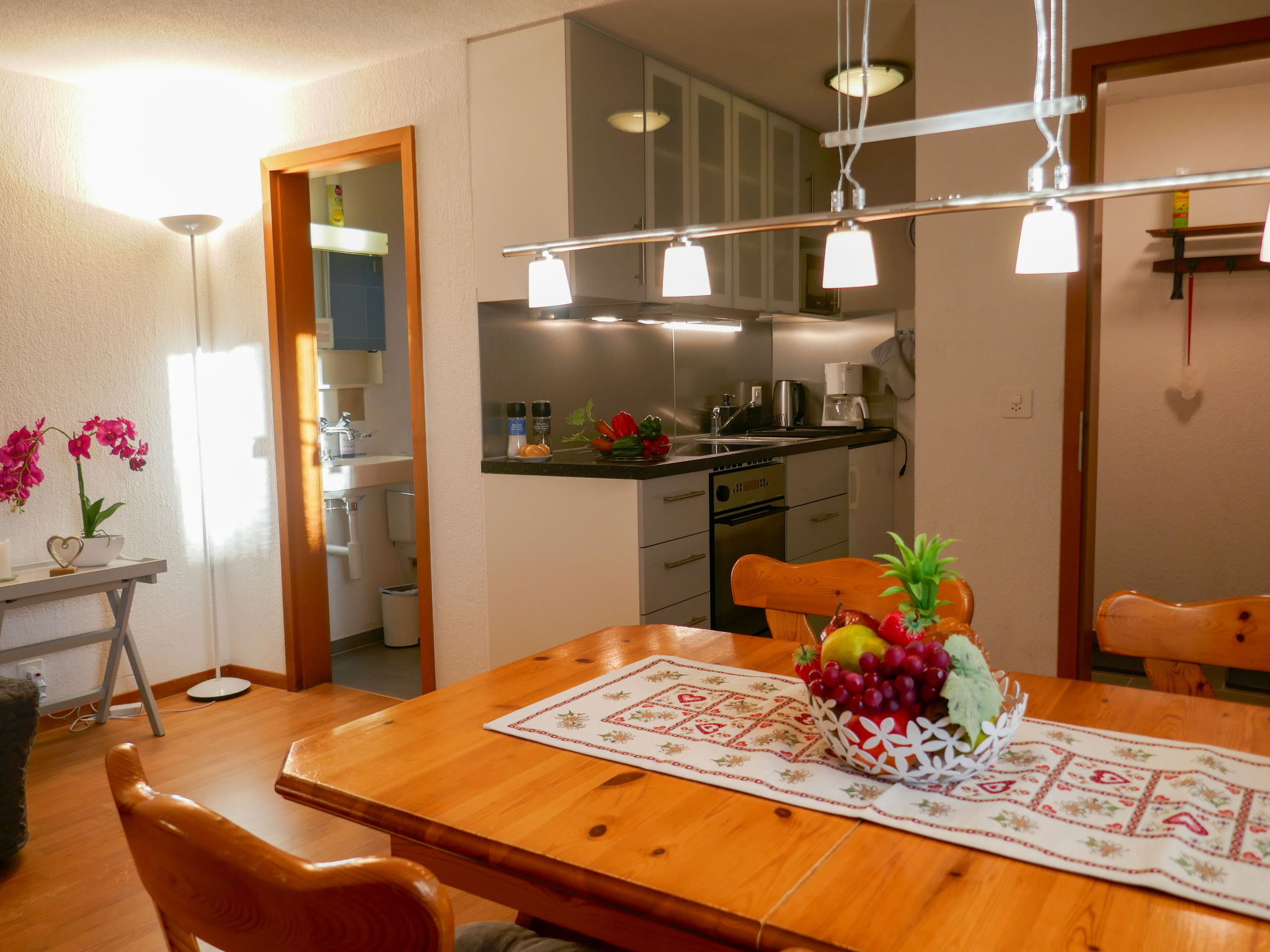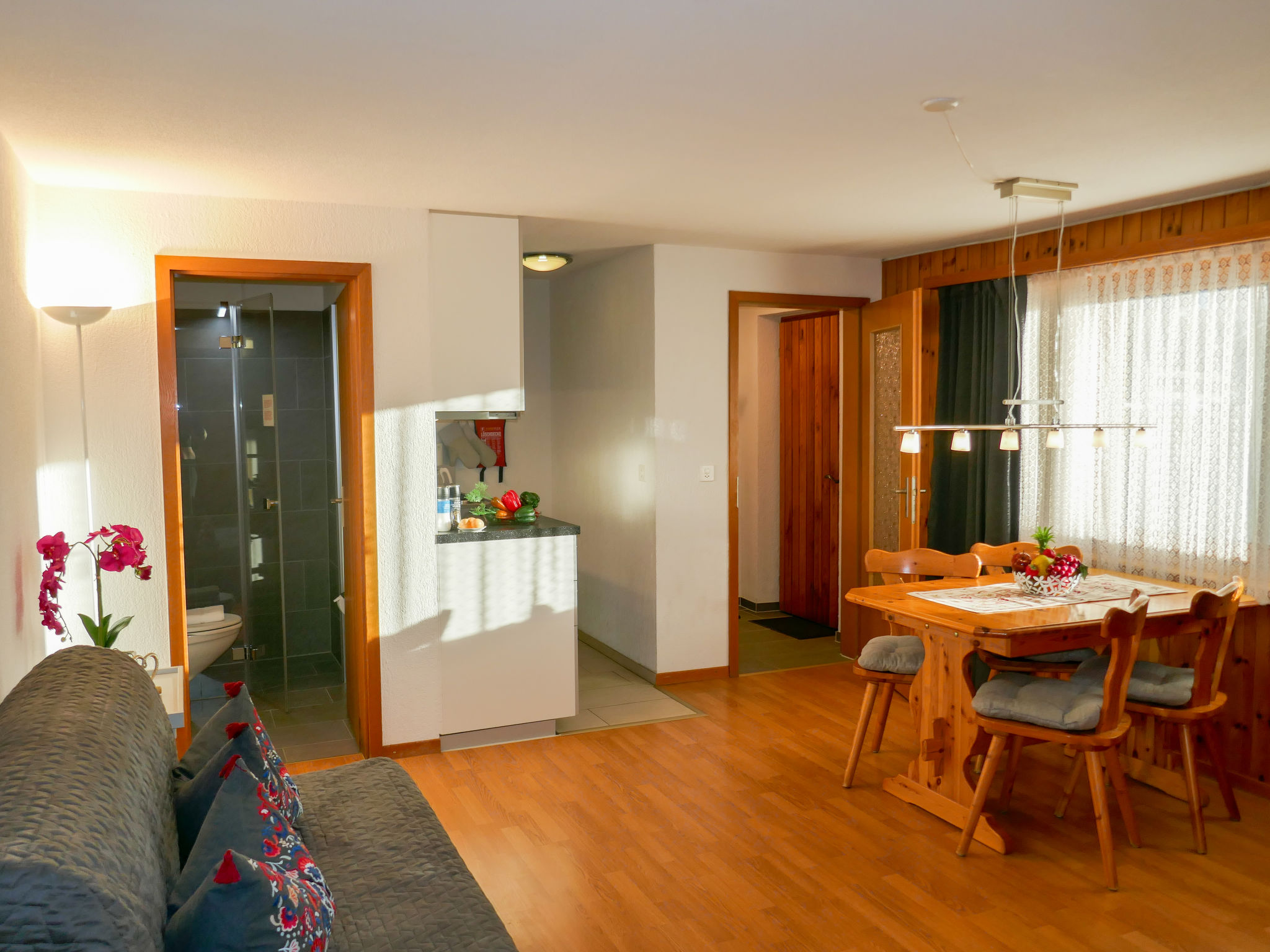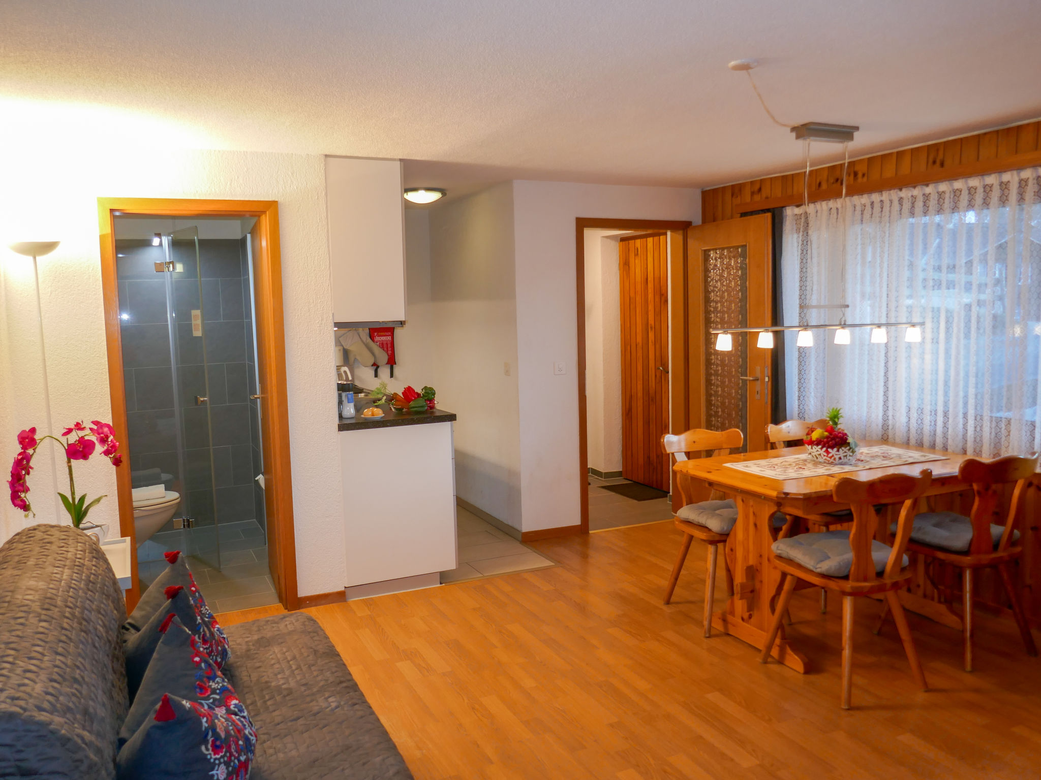 2-Zimmer-Wohnung 45 m2, im Erdgeschoss, Südlage. Gemütlich eingerichtet: Wohn-/Schlafzimmer mit 1 Diwanbett (140 cm, Länge 190 cm), Kabel-TV (Flachbildschirm), Radio. Ausgang zum Gartensitzplatz, Richtung Süden. 1 Zimmer mit 2 Betten (90 cm, Länge 200 cm). Kleine Kochnische (2 Kochplatten, Backofen, elektrische Kaffeemaschine, Racletteofen, Fondue Set (Käse)). Dusche/WC. Fussbodenheizung. Kleiner Gartensitzplatz 70 m2, Südlage und Westlage. Terrassenmöbel, Liegestühle (2), Abstellkammer. Herrliche Sicht auf die Berge und Eigernordwand. Zur Verfügung: Haartrockner. Internet (Wireless LAN, gratis). Garage beim Haus. Bitte beachten: Nichtraucher-Unterkunft. Feuerlöscher.