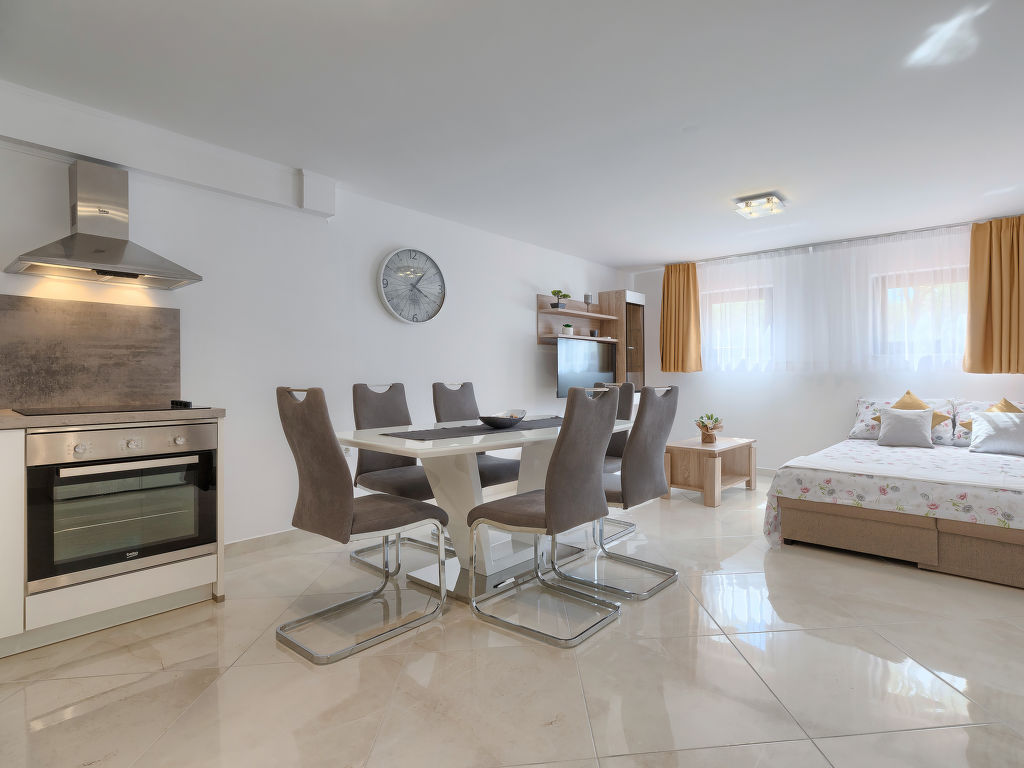 2-Zimmer-Wohnung 60 m2, im Erdgeschoss. Wohn-/Esszimmer 27 m2 mit 1 Doppeldiwanbett (160 cm, Länge 200 cm), Sat-TV (Flachbildschirm), Klimaanlage. 1 Zimmer mit 1 franz. Bett (160 cm, Länge 200 cm). Offene Küche (Backofen, Geschirrspüler, 4 Glaskeramikherd Platten, Mikrowelle, Tiefkühler, elektrische Kaffeemaschine). Dusche/Bidet/WC. Zur Verfügung: Waschmaschine, Safe, Babybett (extra), Haartrockner. Internet (Wireless LAN, gratis). Bitte beachten: eigener Eingang.