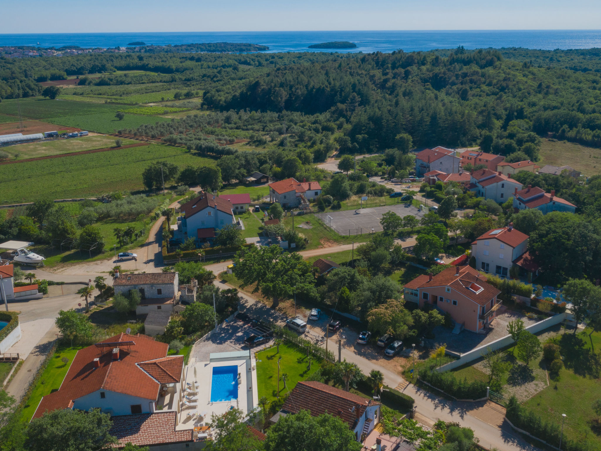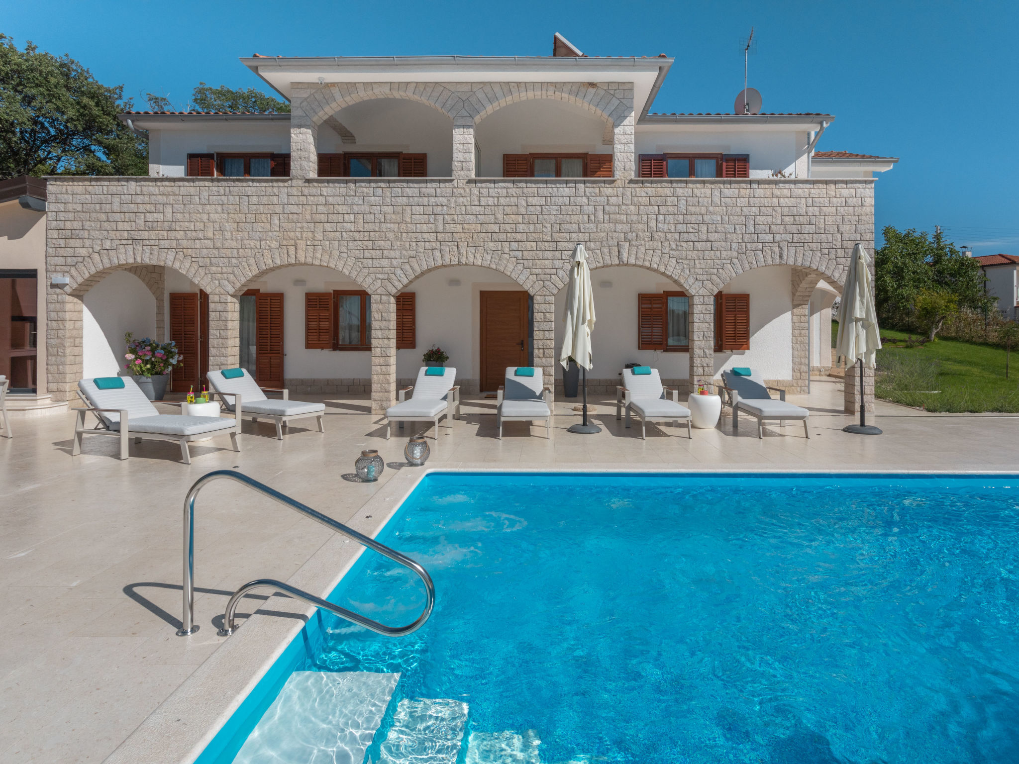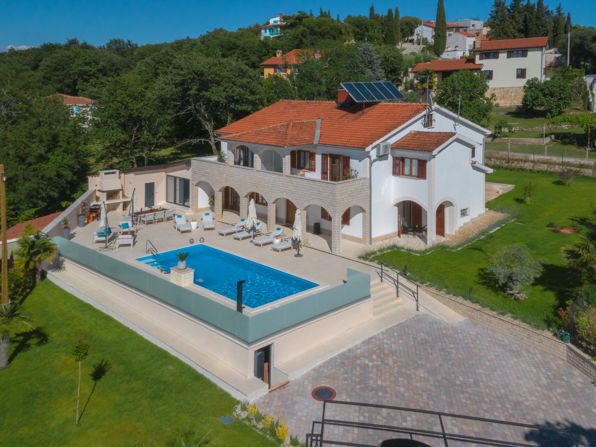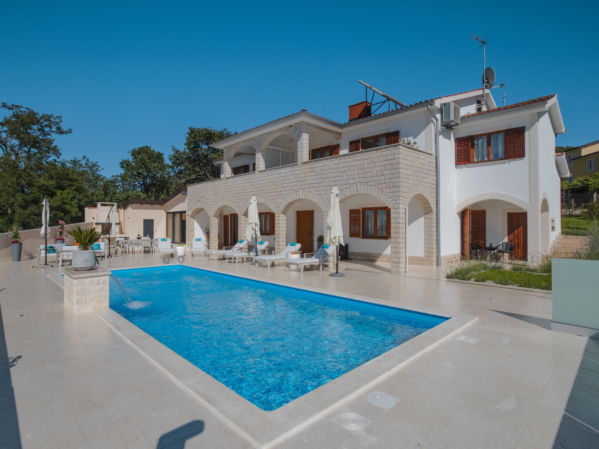 10-Zimmer-Haus 320 m2 auf 2 Stockwerken. Schön und geschmackvoll eingerichtet: Wohn-/Esszimmer 30 m2 mit Küchenblock und Sat-TV (Flachbildschirm), Klimaanlage. Ausgang zur Terrasse. 1 Zimmer mit 1 franz. Bett (160 cm, Länge 200 cm), Sat-TV (Flachbildschirm), Klimaanlage. Wohn-/Esszimmer 30 m2 mit Sat-TV (Flachbildschirm), Klimaanlage. Ausgang zum Schwimmbad. 1 Zimmer mit 2 Betten (90 cm, Länge 200 cm), Sat-TV (Flachbildschirm), Klimaanlage. Offene Küche (Backofen, Geschirrspüler, 4 Glaskeramikherd Platten, Mikrowelle, Tiefkühler, elektrische Kaffeemaschine). Dusche/WC, Dusche/Bidet/WC. Obergeschoss: 3 Zimmer, jedes Zimmer mit 1 franz. Bett (160 cm, Länge 200 cm), Sat-TV (Flachbildschirm), Klimaanlage. 2 Zimmer, jedes Zimmer mit 1 franz. Bett (160 cm, Länge 200 cm), Dusche/WC und Sat-TV (Flachbildschirm), Klimaanlage. Ausgang zur Terrasse. 1 Zimmer mit 1 Bett (90 cm, Länge 200 cm), Sat-TV (Flachbildschirm), Klimaanlage. Ausgang zur Terrasse. 2 Duschen/WC. Terrasse 9 m2, überdacht, 2 Terrassen 14 m2. Terrassenmöbel, Liegestühle. Fernsicht auf das Meer. Zur Verfügung: Safe, Bügeleisen, Kinderhochstuhl, Babybett, Haartrockner. Internet (Wireless LAN, gratis).