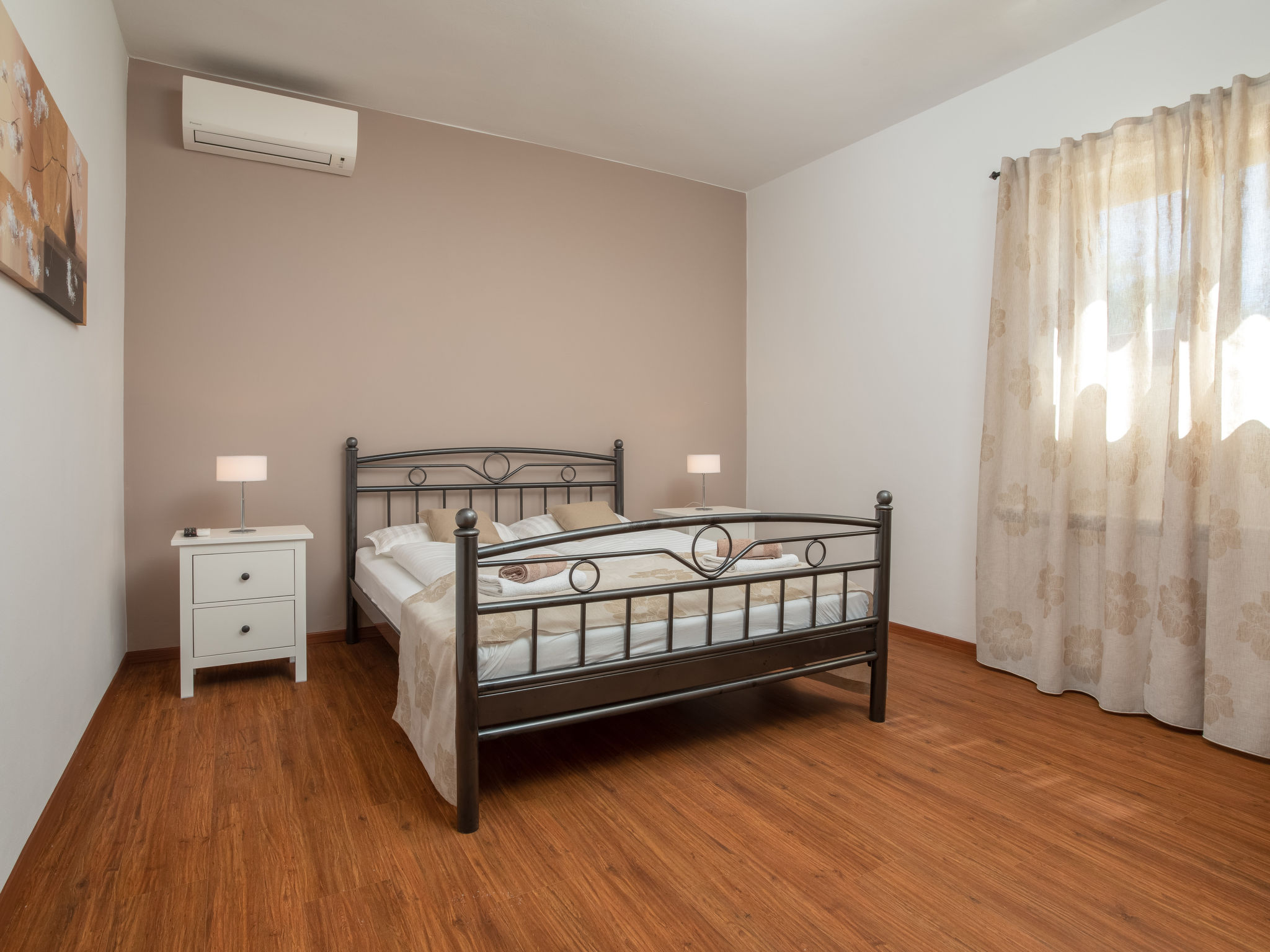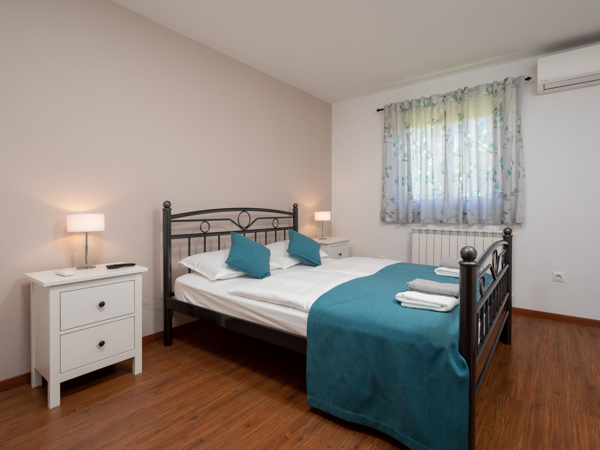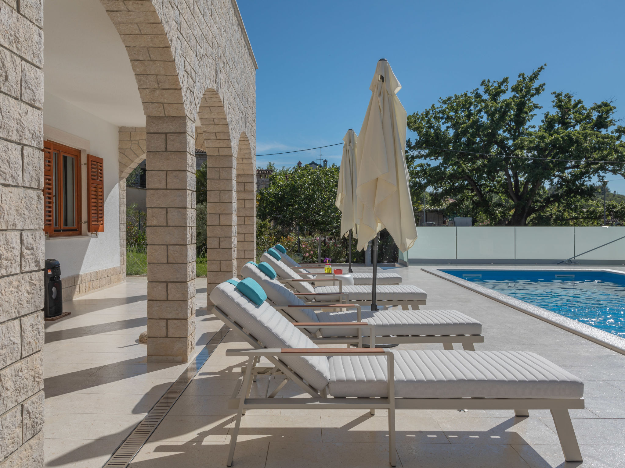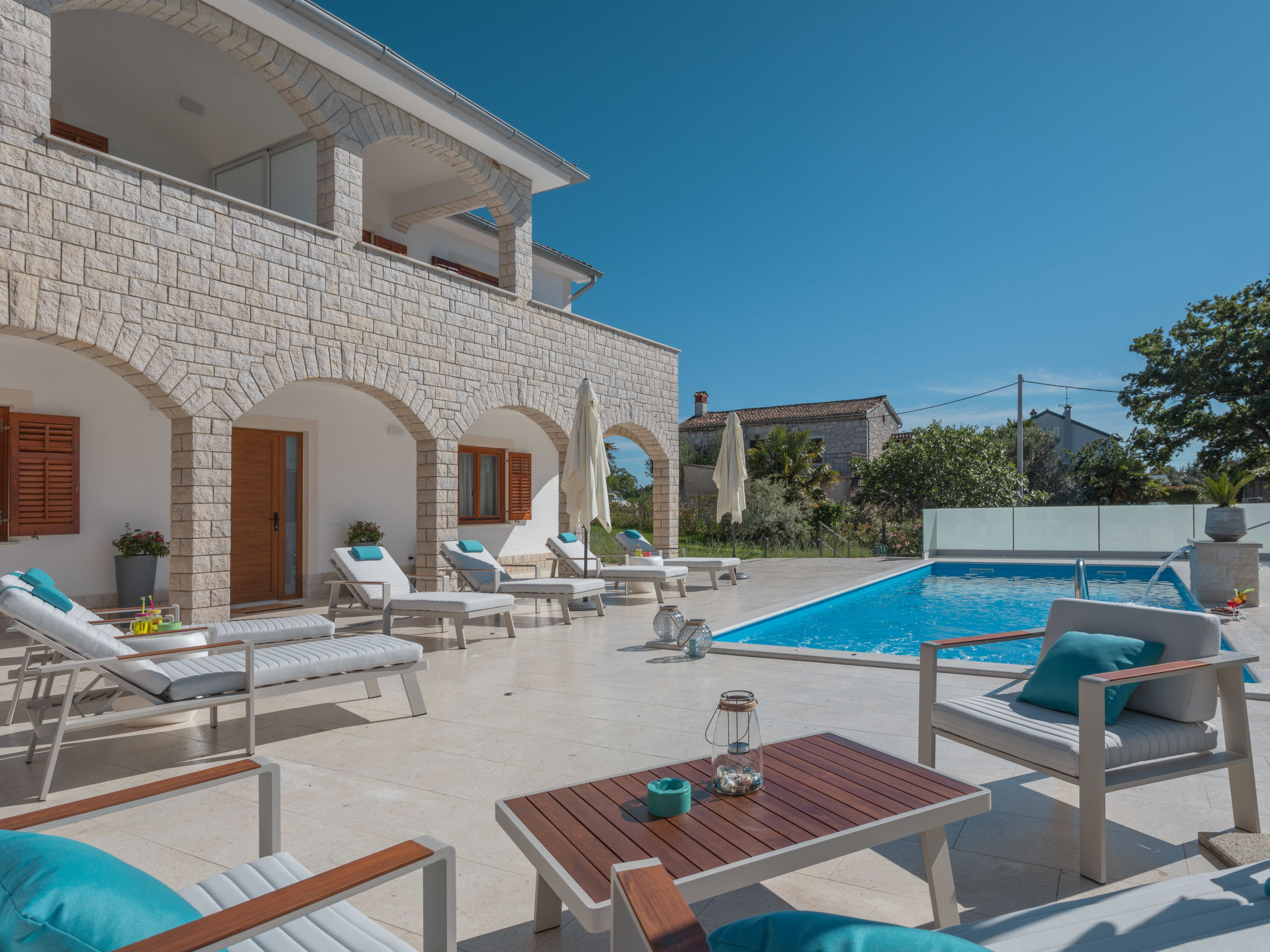 10-Zimmer-Haus 320 m2 auf 2 Stockwerken. Schön und geschmackvoll eingerichtet: Wohn-/Esszimmer 30 m2 mit Küchenblock und Sat-TV (Flachbildschirm), Klimaanlage. Ausgang zur Terrasse. 1 Zimmer mit 1 franz. Bett (160 cm, Länge 200 cm), Sat-TV (Flachbildschirm), Klimaanlage. Wohn-/Esszimmer 30 m2 mit Sat-TV (Flachbildschirm), Klimaanlage. Ausgang zum Schwimmbad. 1 Zimmer mit 2 Betten (90 cm, Länge 200 cm), Sat-TV (Flachbildschirm), Klimaanlage. Offene Küche (Backofen, Geschirrspüler, 4 Glaskeramikherd Platten, Mikrowelle, Tiefkühler, elektrische Kaffeemaschine). Dusche/WC, Dusche/Bidet/WC. Obergeschoss: 3 Zimmer, jedes Zimmer mit 1 franz. Bett (160 cm, Länge 200 cm), Sat-TV (Flachbildschirm), Klimaanlage. 2 Zimmer, jedes Zimmer mit 1 franz. Bett (160 cm, Länge 200 cm), Dusche/WC und Sat-TV (Flachbildschirm), Klimaanlage. Ausgang zur Terrasse. 1 Zimmer mit 1 Bett (90 cm, Länge 200 cm), Sat-TV (Flachbildschirm), Klimaanlage. Ausgang zur Terrasse. 2 Duschen/WC. Terrasse 9 m2, überdacht, 2 Terrassen 14 m2. Terrassenmöbel, Liegestühle. Fernsicht auf das Meer. Zur Verfügung: Safe, Bügeleisen, Kinderhochstuhl, Babybett, Haartrockner. Internet (Wireless LAN, gratis).