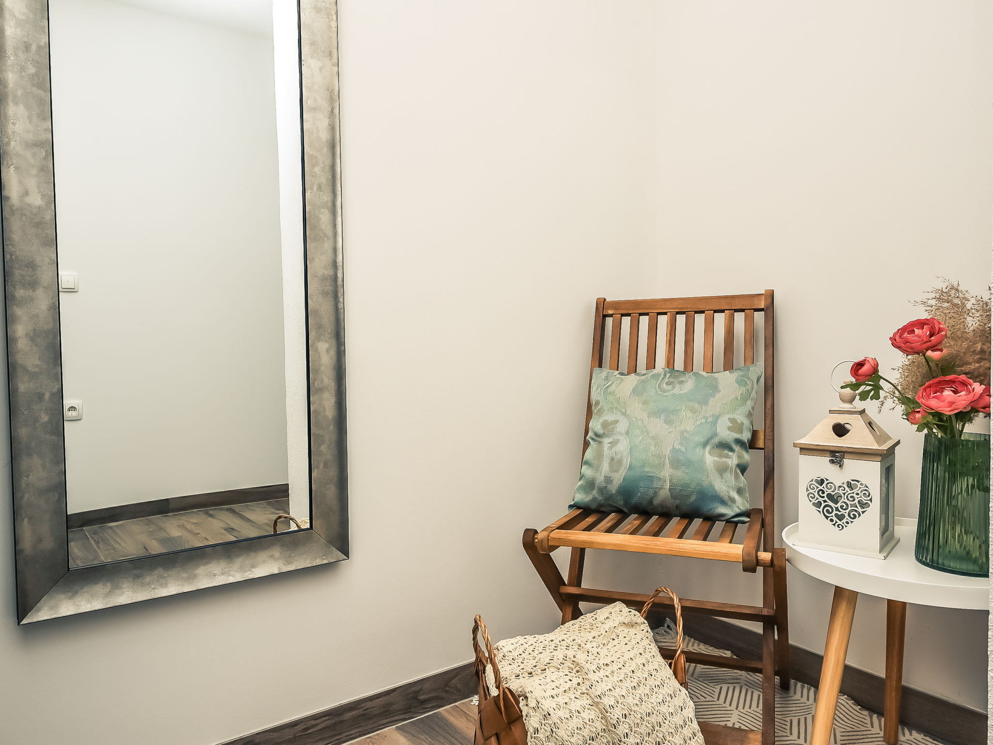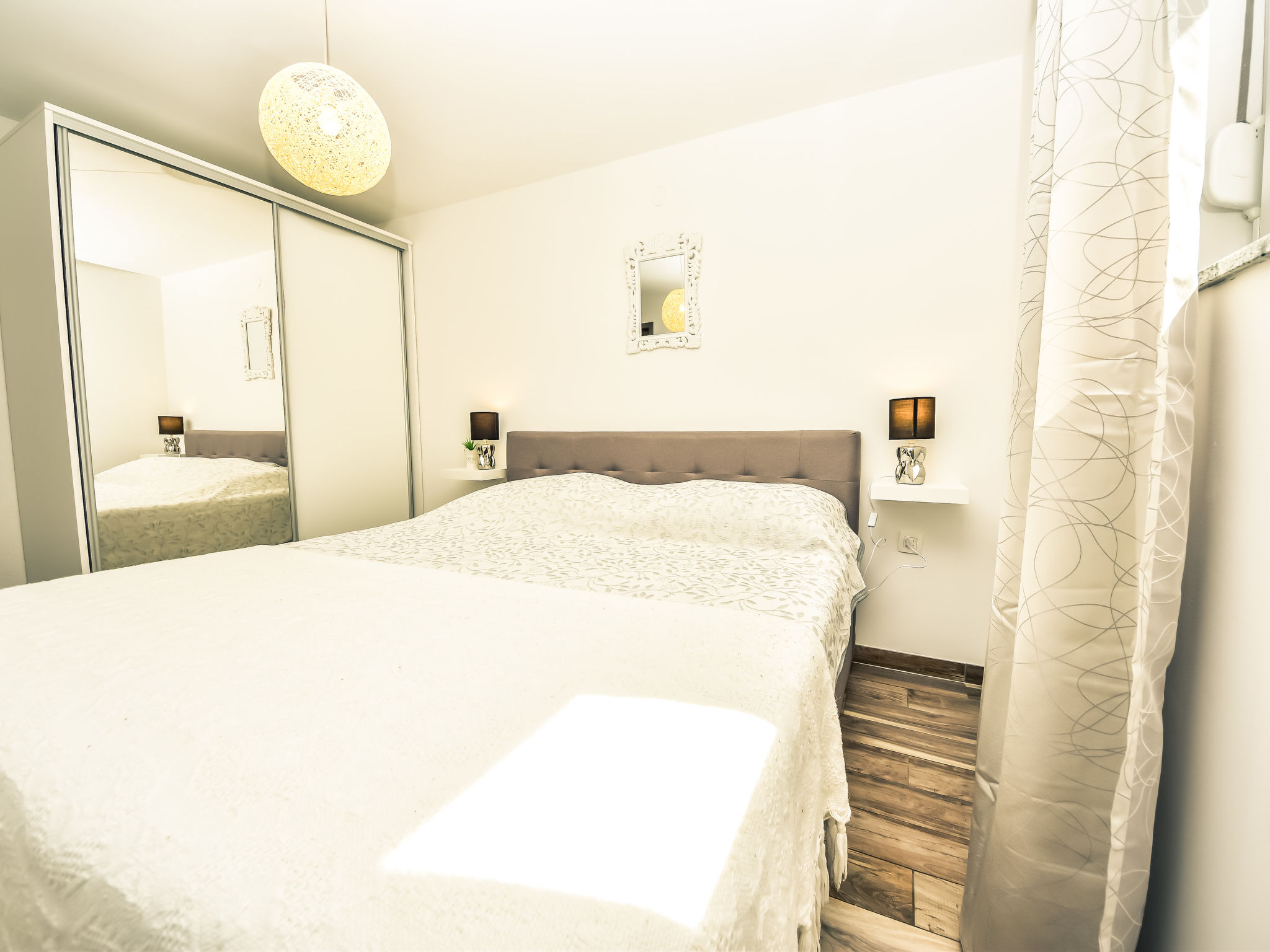 3-Zimmer-Wohnung 45 m2, unteres Geschoss, Südwestlage. Wohn-/Esszimmer 18 m2 mit 1 Diwanbett (140 cm, Länge 200 cm), Sat-TV (Flachbildschirm), Klimaanlage. Ausgang zur Terrasse. 1 Zimmer mit 1 franz. Bett (140 cm, Länge 200 cm). 1 Zimmer mit 1 franz. Bett (160 cm, Länge 200 cm). Offene Küche (Backofen, Geschirrspüler, 4 Glaskeramikherd Platten, Tiefkühler, elektrische Kaffeemaschine). Dusche/WC. Terrasse 20 m2 teilweise überdacht. Terrassenmöbel. Sicht auf das Schwimmbad. Zur Verfügung: Waschmaschine, Haartrockner. Internet (Wireless LAN, gratis).