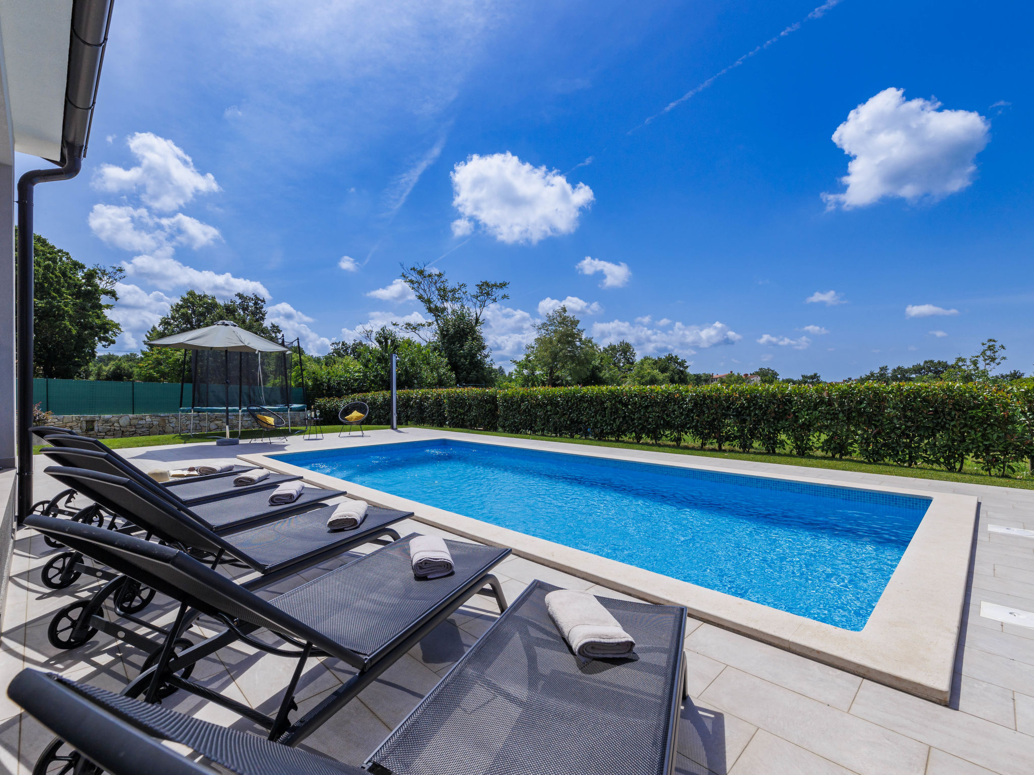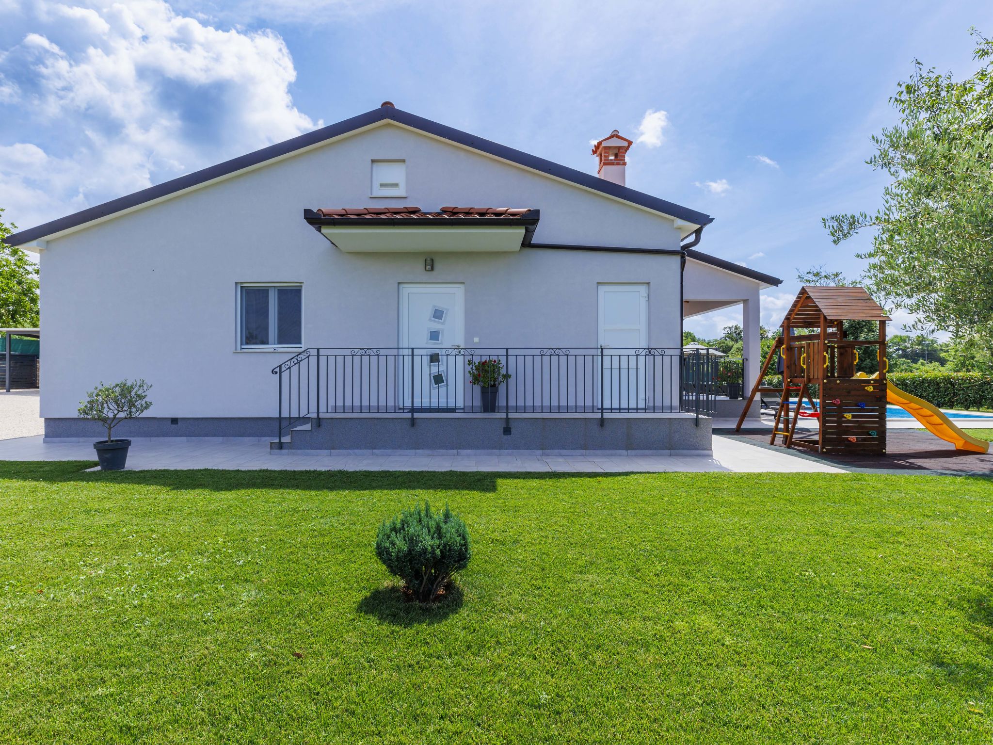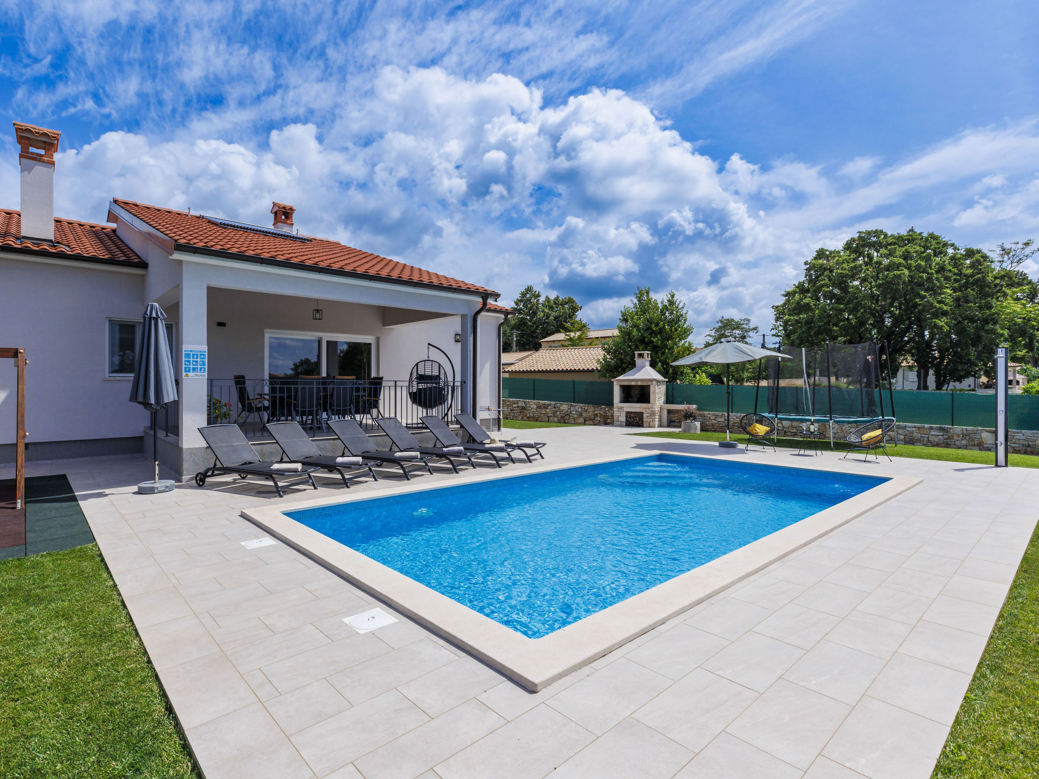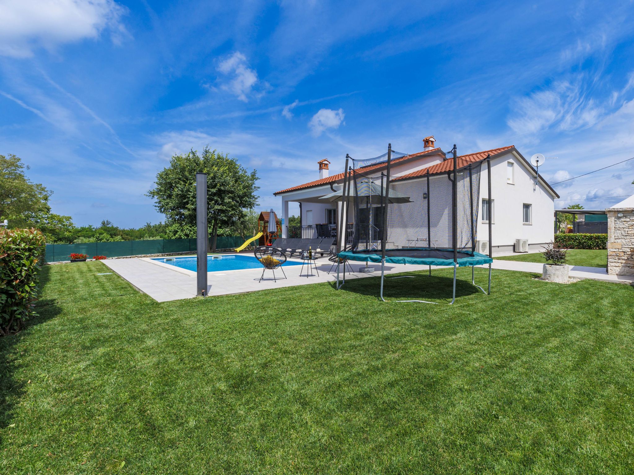 Schönes Einfamilienhaus "Veli vrt", Baujahr 2020. Im Weiler Kuhari, 2 km vom Zentrum von Žminj, 26 km vom Zentrum von Rovinj, ruhige, sonnige Lage, 26 km vom Meer. Zur Alleinbenutzung: Grundstück 1'000 m2 (eingezäunt), Garten mit Rasen und Pflanzen, Schwimmbad eckig (8 x 4 m, 150 cm tief, 01.04.-31.10.) mit Innentreppe. Aussendusche, Grill, Kinderspielplatz (Schaukel). Im Hause: Internetzugang, Trampolin, Waschmaschine. Parkplatz (für 2 Autos) beim Haus auf dem Grundstück. Supermarkt 1.5 km, Restaurant 2 km, Kieselstrand 26 km. Reitstall 10 km, Wanderwege ab Haus 100 m, Radweg 150 m. Nahe gelegene Sehenswürdigkeiten: adventure park 20 km, zip line 15 km. Bitte beachten: geeignet für Familien. Der Besitzer akzeptiert keine Jugendgruppen.