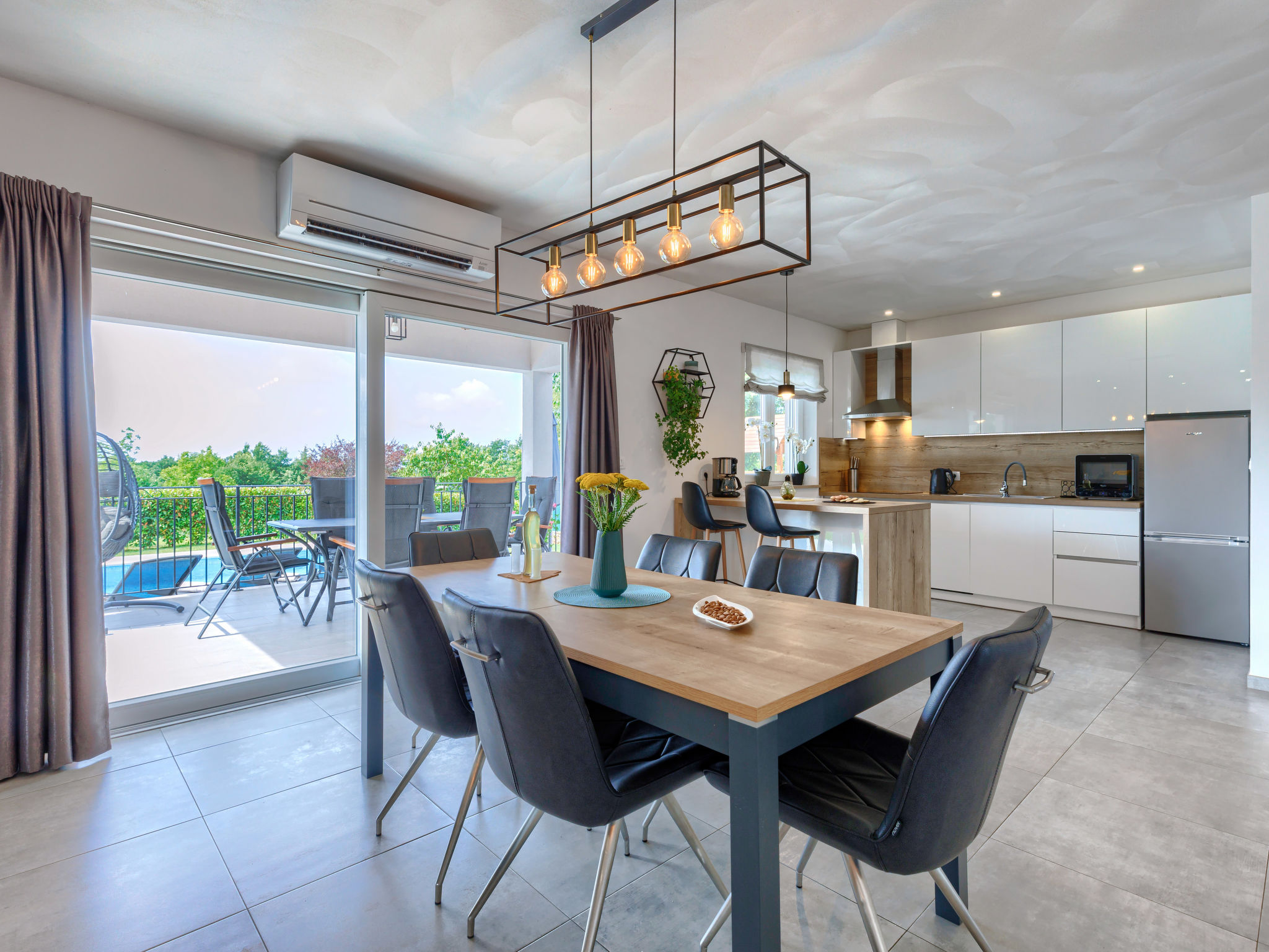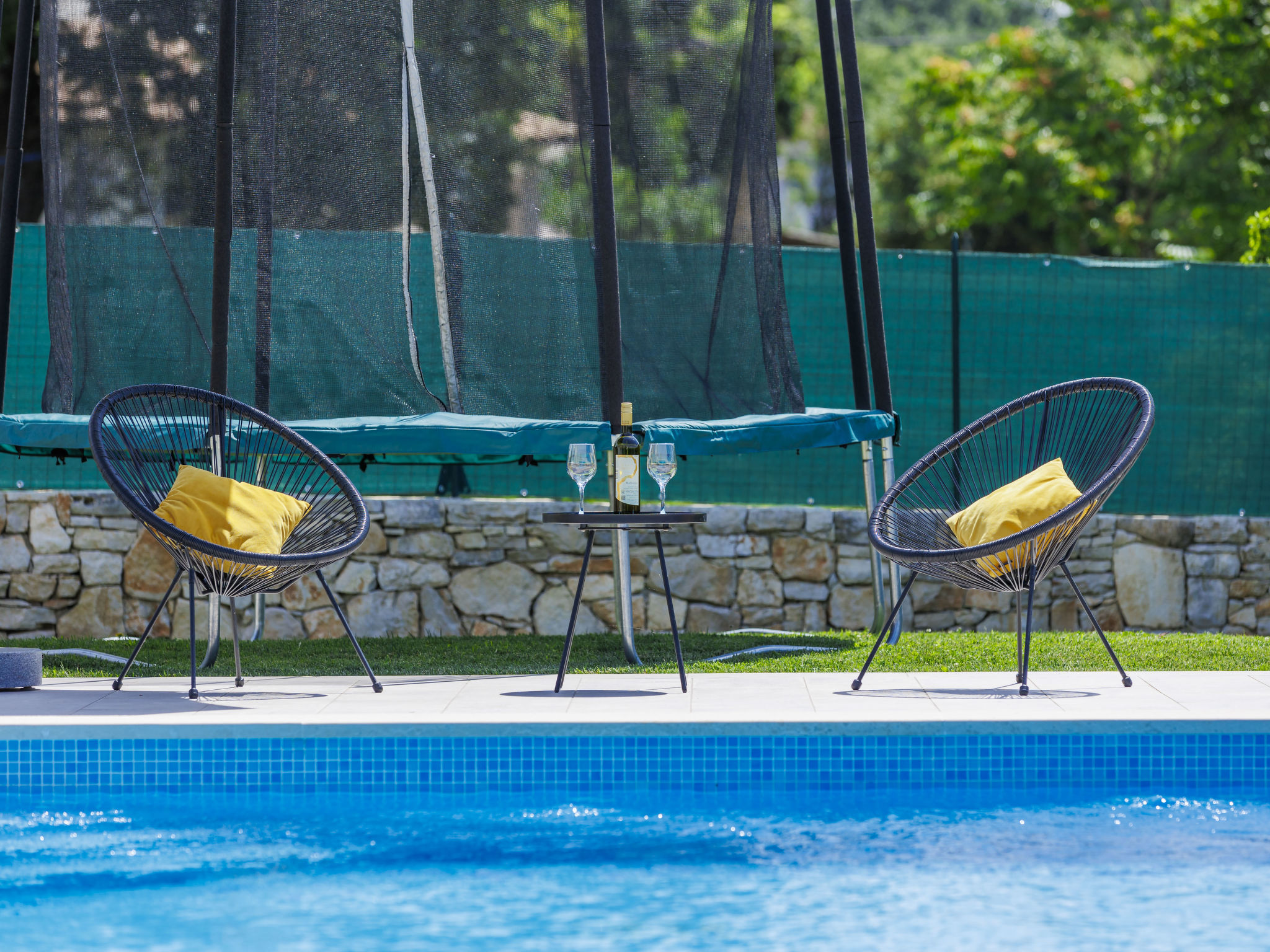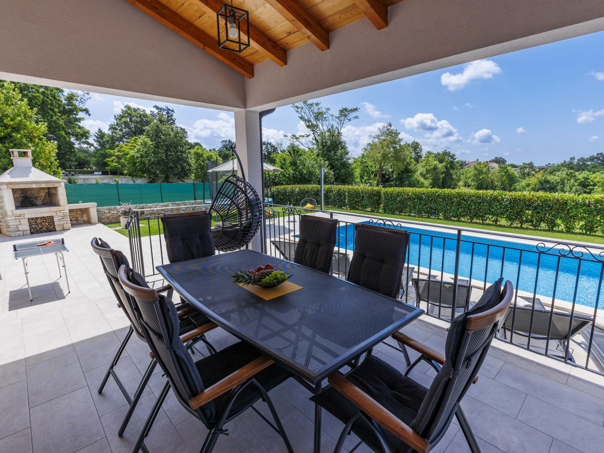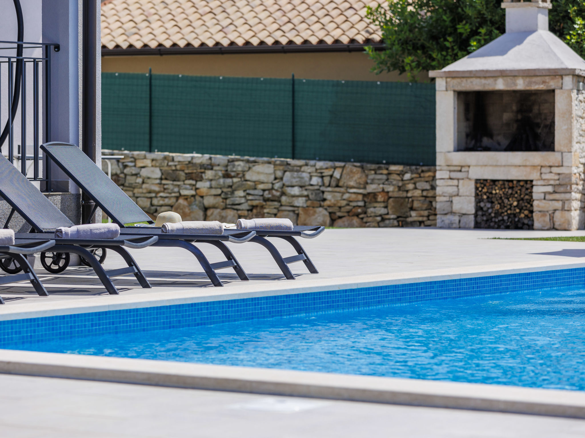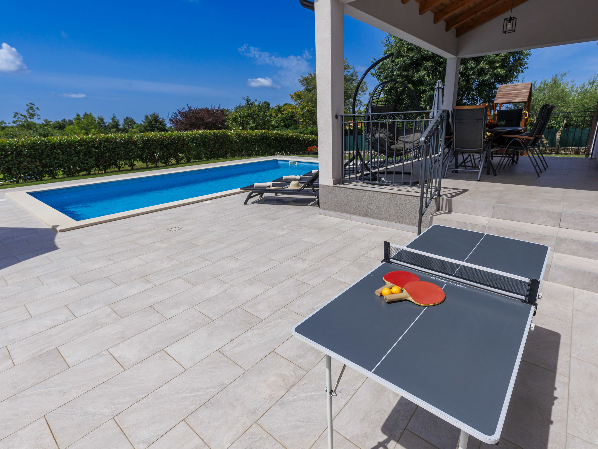 Schönes Einfamilienhaus "Veli vrt", Baujahr 2020. Im Weiler Kuhari, 2 km vom Zentrum von Žminj, 26 km vom Zentrum von Rovinj, ruhige, sonnige Lage, 26 km vom Meer. Zur Alleinbenutzung: Grundstück 1'000 m2 (eingezäunt), Garten mit Rasen und Pflanzen, Schwimmbad eckig (8 x 4 m, 150 cm tief, 01.04.-31.10.) mit Innentreppe. Aussendusche, Grill, Kinderspielplatz (Schaukel). Im Hause: Internetzugang, Trampolin, Waschmaschine. Parkplatz (für 2 Autos) beim Haus auf dem Grundstück. Supermarkt 1.5 km, Restaurant 2 km, Kieselstrand 26 km. Reitstall 10 km, Wanderwege ab Haus 100 m, Radweg 150 m. Nahe gelegene Sehenswürdigkeiten: adventure park 20 km, zip line 15 km. Bitte beachten: geeignet für Familien. Der Besitzer akzeptiert keine Jugendgruppen.