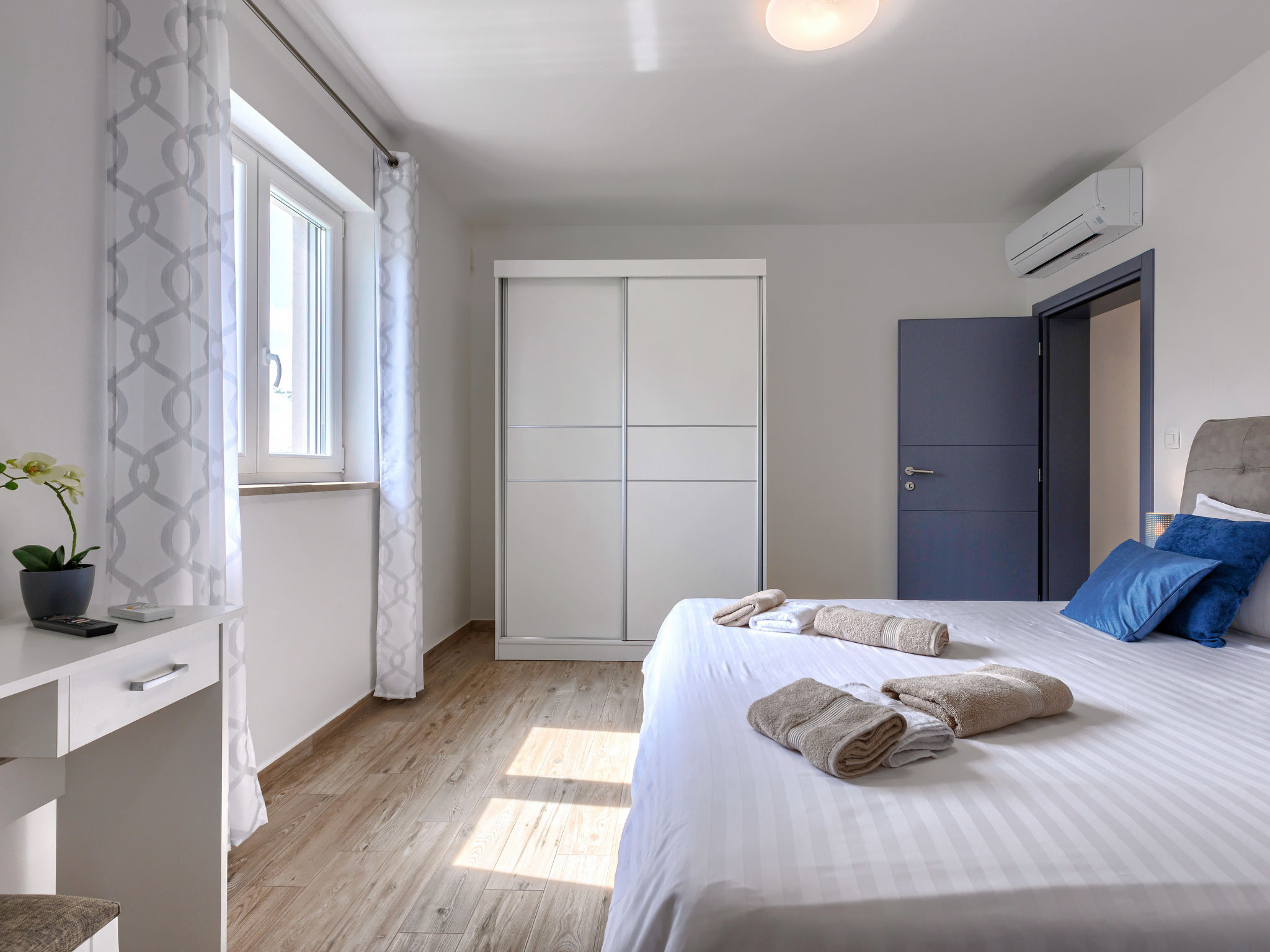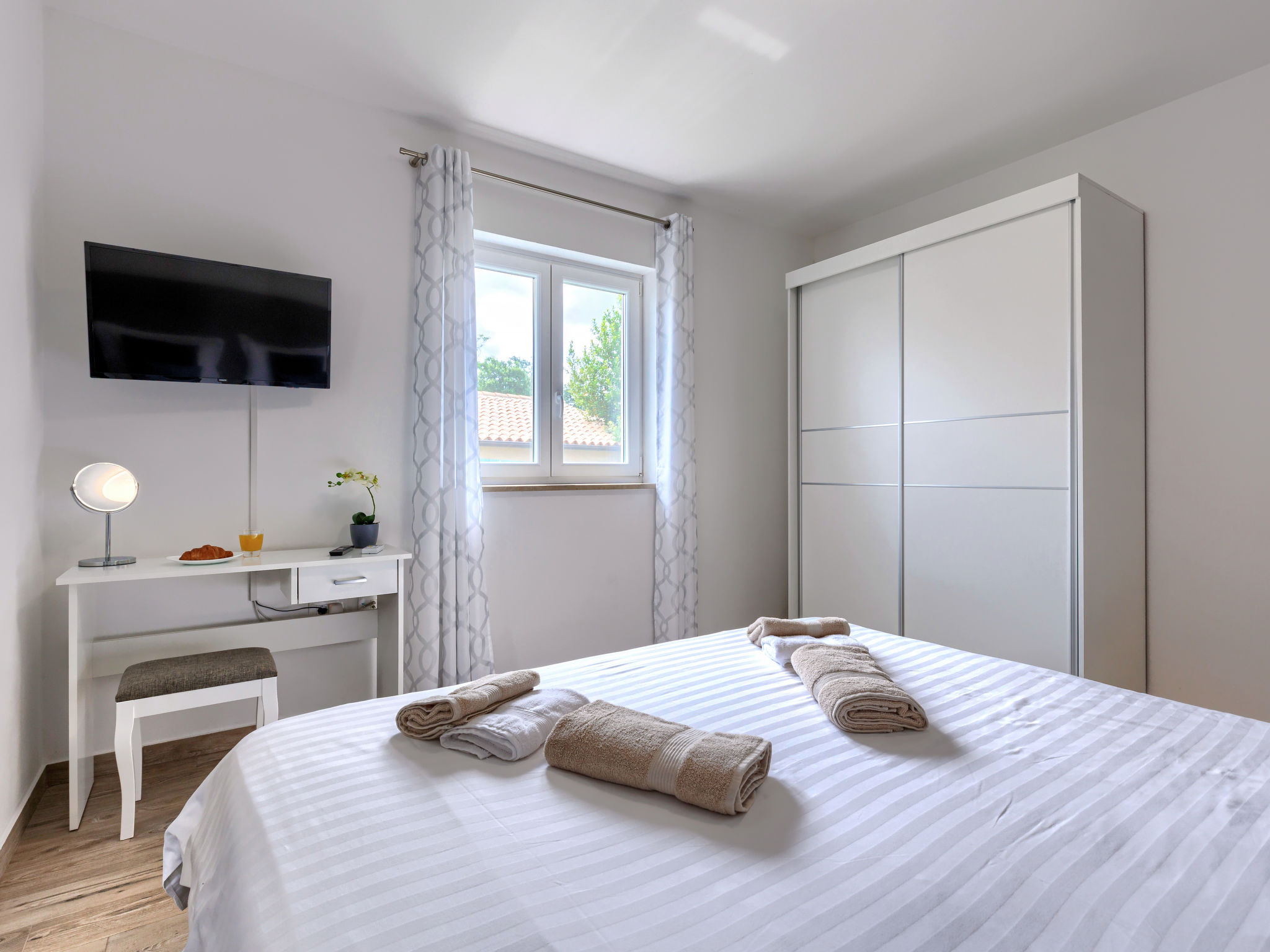 4-Zimmer-Haus 141 m2. Schön und geschmackvoll eingerichtet: Wohn-/Esszimmer 45 m2 mit Sat-TV (Flachbildschirm), Klimaanlage. Ausgang zur Terrasse, zum Schwimmbad. 2 Zimmer, jedes Zimmer mit 1 franz. Bett (180 cm, Länge 200 cm), Dusche/WC und Klimaanlage. 1 Zimmer mit 2 Betten (90 cm, Länge 200 cm), Dusche/WC und Klimaanlage. Offene Küche (4 Kochplatten, Backofen, Geschirrspüler, Toaster, Wasserkocher, Tiefkühler, elektrische Kaffeemaschine). Terrasse 19 m2, überdacht. Terrassenmöbel, Liegestühle. Sicht auf das Schwimmbad. Zur Verfügung: Bügeleisen, Fliegengitter, Kinderhochstuhl, Babybett, Haartrockner. Internet (Wireless LAN, gratis).