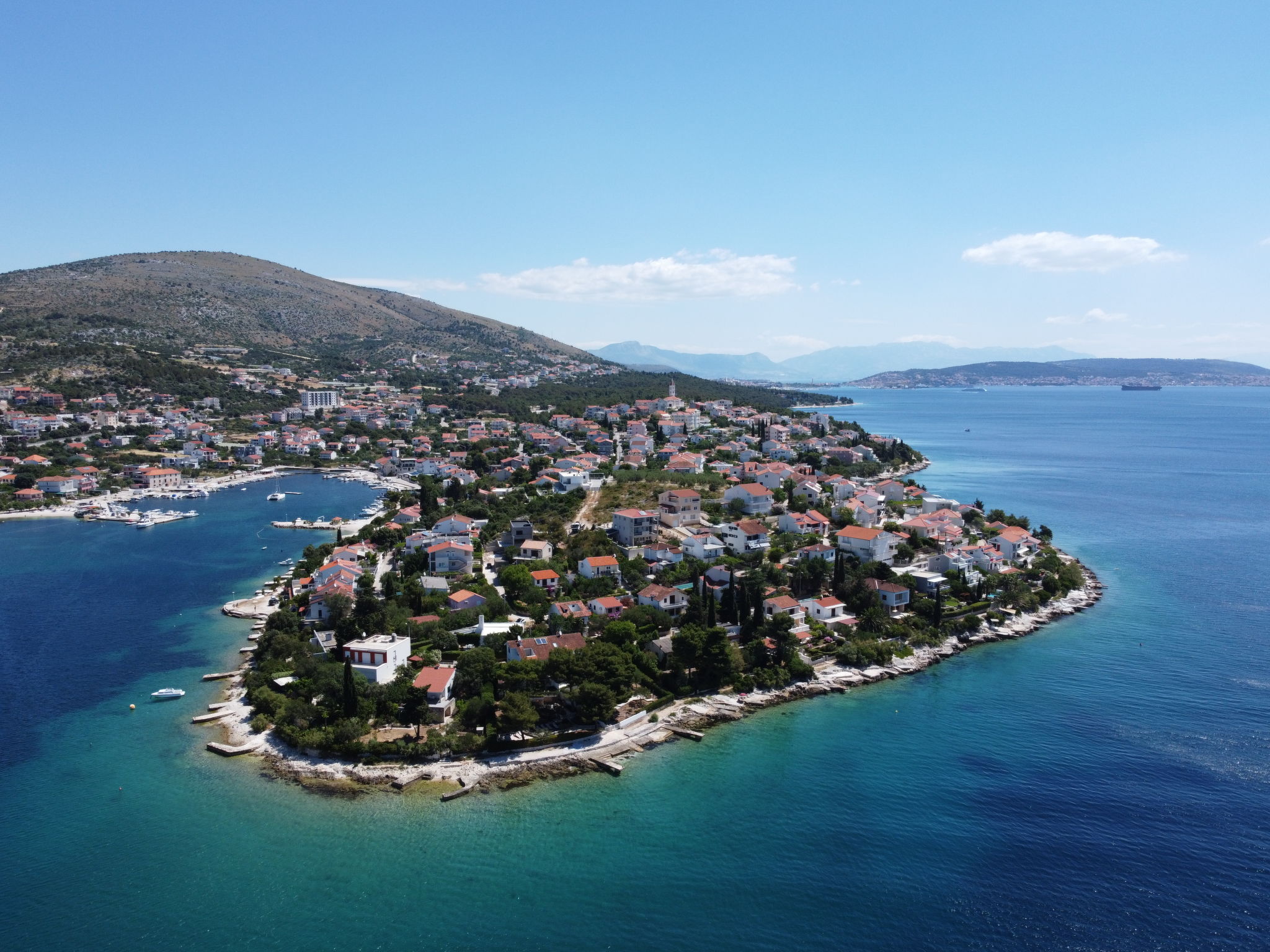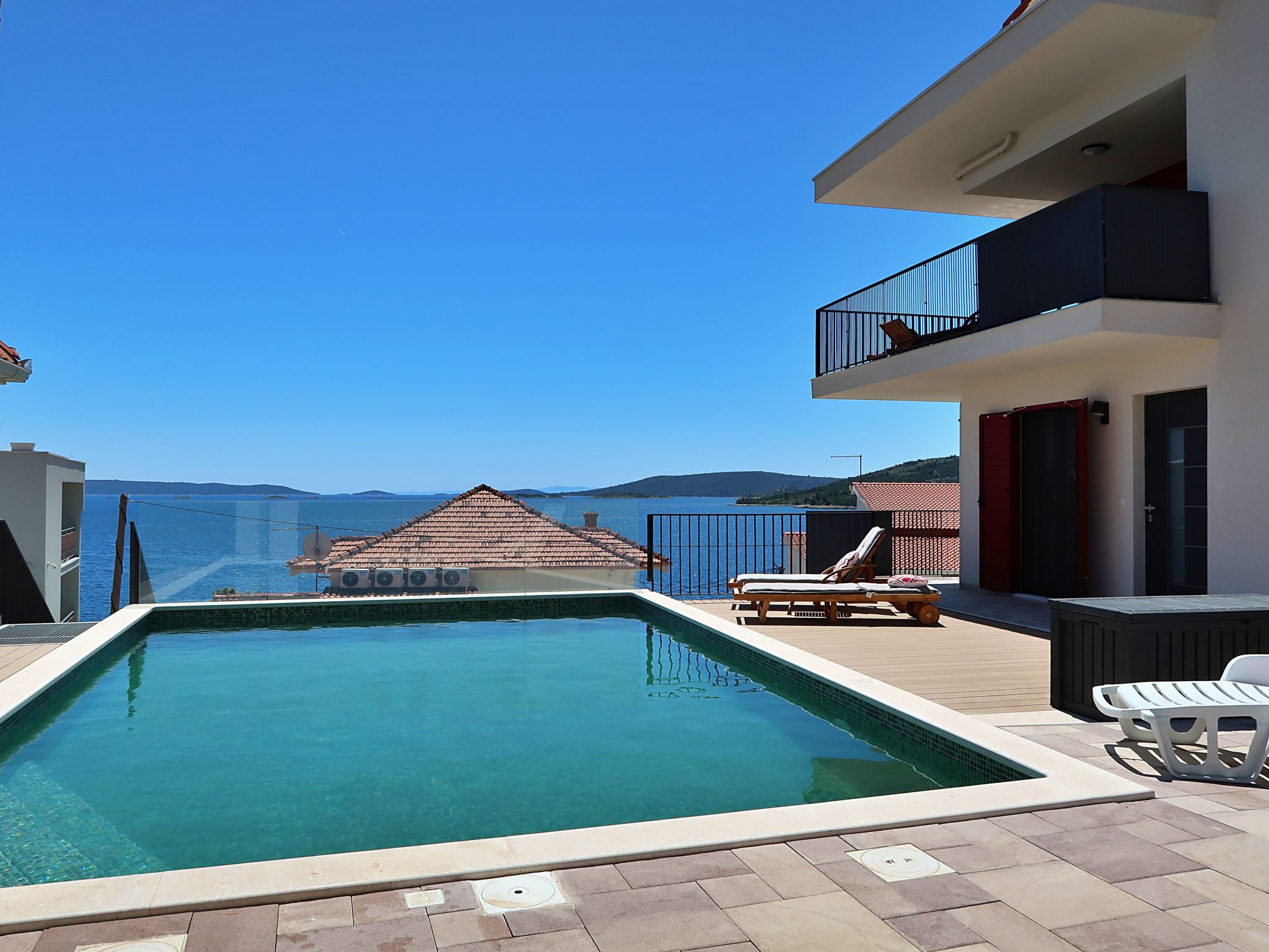 Seget Vranjica 4 km von Trogir: Modernes Dreifamilienhaus "Viva-by the Sea", Baujahr 2020. 500 m vom Zentrum von Seget Vranjica, ruhige, sonnige Lage, 100 m vom Meer, 100 m vom Strand. Zur Mitbenutzung: Grundstück 100 m2, Schwimmbad eckig (8 x 4 m, 150 cm tief, saisonale Verfügbarkeit: 01.Mai.-02.Okt.) mit Innentreppe und Salzelektrolyse-Reinigungssystem. Aussendusche. Im Hause: Internetzugang. Parkplatz beim Haus auf dem Grundstück. Einkaufsgeschäft 450 m, Supermarkt 6 km, Restaurant, Café 600 m, Kieselstrand 500 m, Felsstrand 100 m. Der Besitzer akzeptiert keine Jugendgruppen. Bitte beachten: Flugplatz 12 km vom Haus. Schwimmbad mit Hydromassage.