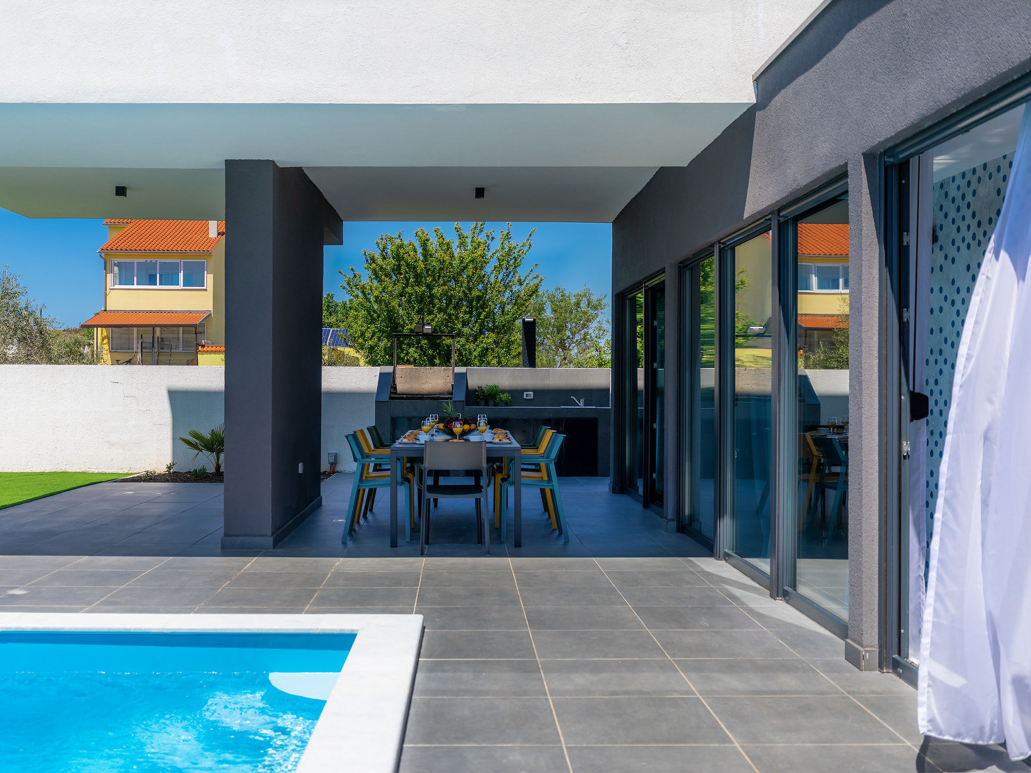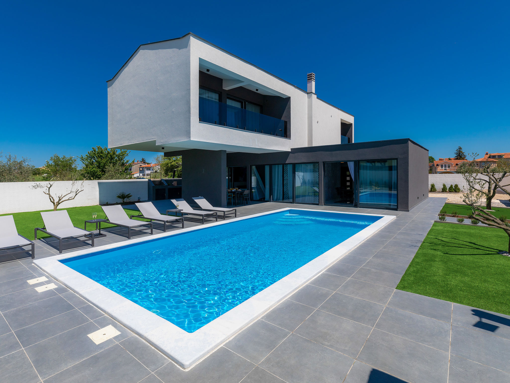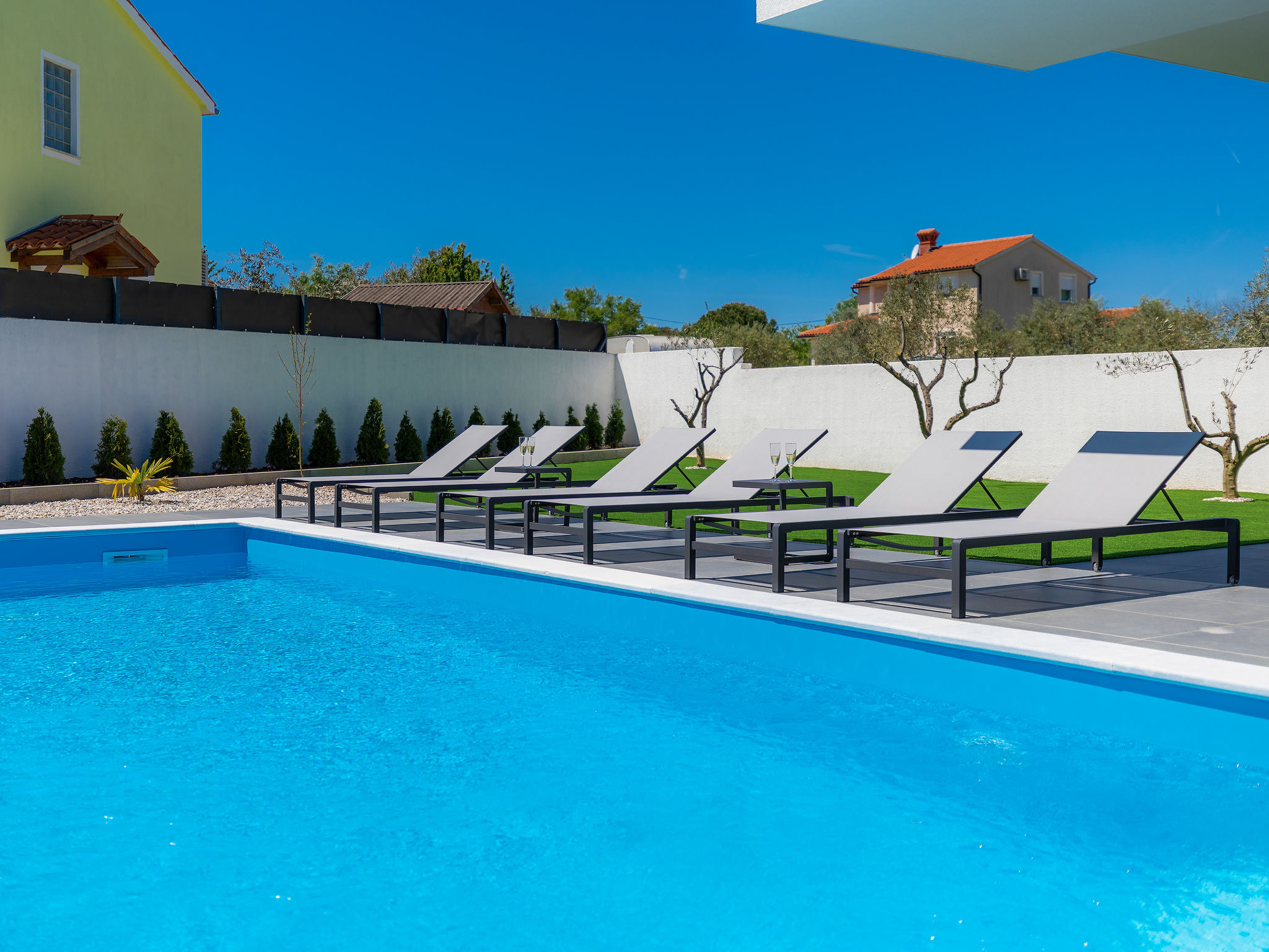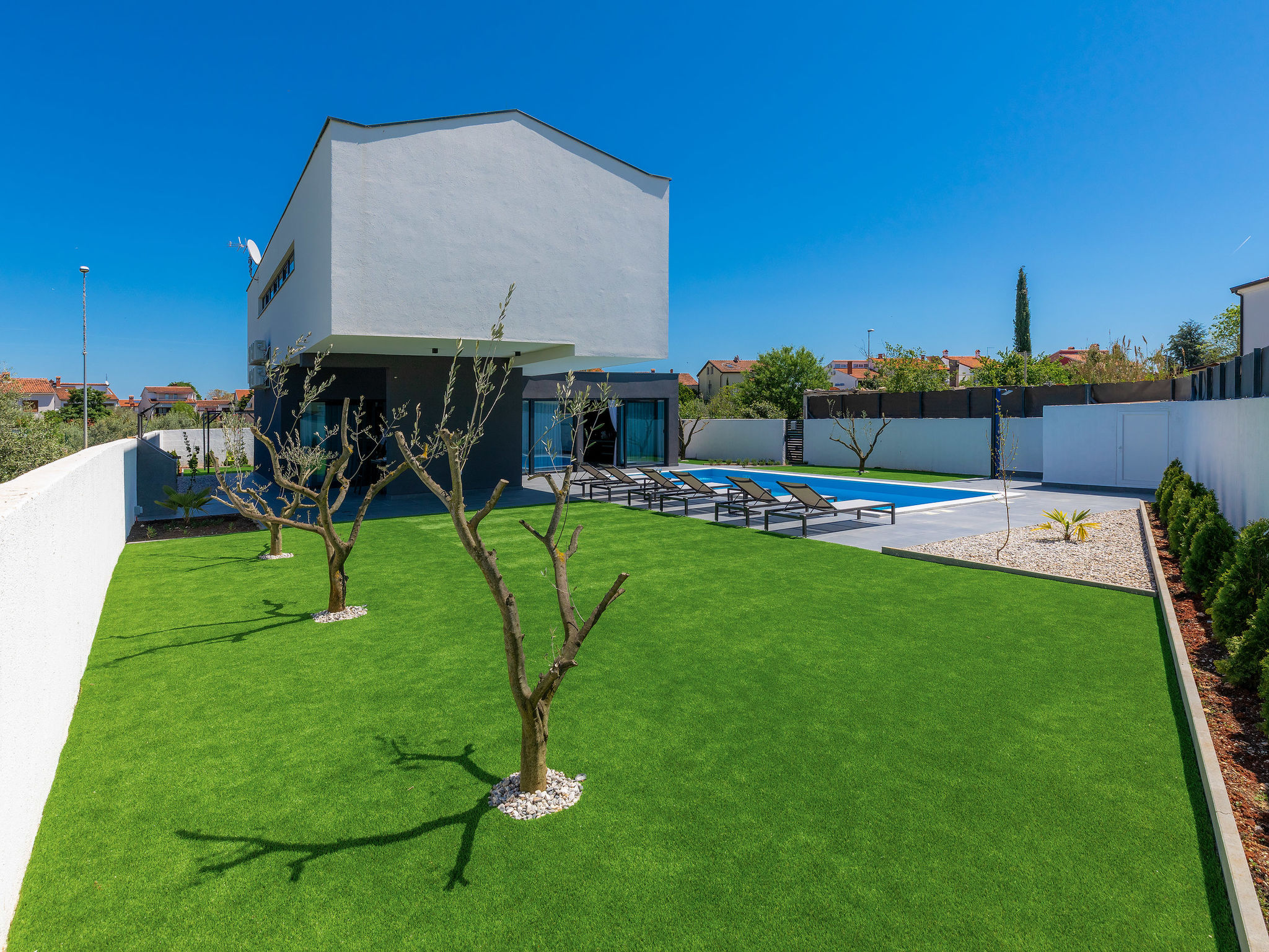 4-Zimmer-Villa 150 m2 auf 2 Stockwerken. Schön und gemütlich eingerichtet: Wohn-/Esszimmer 50 m2 mit Sat-TV und Klimaanlage. Ausgang zur Terrasse, zum Schwimmbad. Offene Küche (Backofen, Geschirrspüler, 2 Glaskeramikherd Platten, 2 Flammen, Wasserkocher, Mikrowelle, Tiefkühler, elektrische Kaffeemaschine). Dusche/WC. Obergeschoss: 1 Zimmer mit 1 franz. Bett (160 cm, Länge 200 cm), Sat-TV und Klimaanlage. Ausgang zur Terrasse. 1 Zimmer mit begehbarer Kleiderschrank mit 1 franz. Bett (160 cm, Länge 200 cm), Dusche/WC, Sat-TV und Klimaanlage. Ausgang zur Terrasse. 1 Zimmer mit 2 Betten (90 cm, Länge 200 cm), Sat-TV und Klimaanlage. Ausgang zur Terrasse. Dusche/WC. Warmluftheizung. Terrasse 4 m2, Terrasse 9 m2. Terrassenmöbel, Liegestühle. Sicht auf das Schwimmbad. Zur Verfügung: Safe, Kinderhochstuhl, Babybett, Haartrockner. Internet (Wireless LAN, gratis). 1 kleines Haustier/Hund erlaubt.