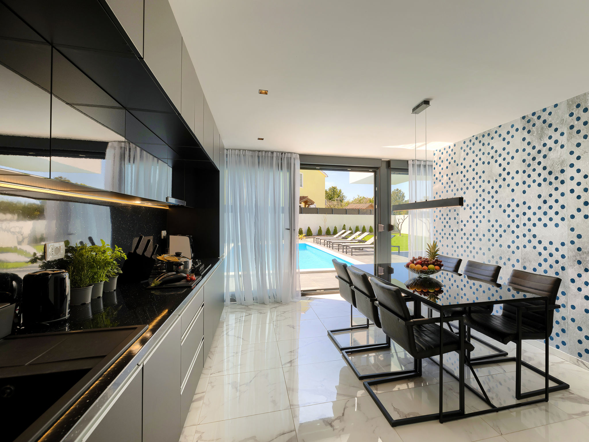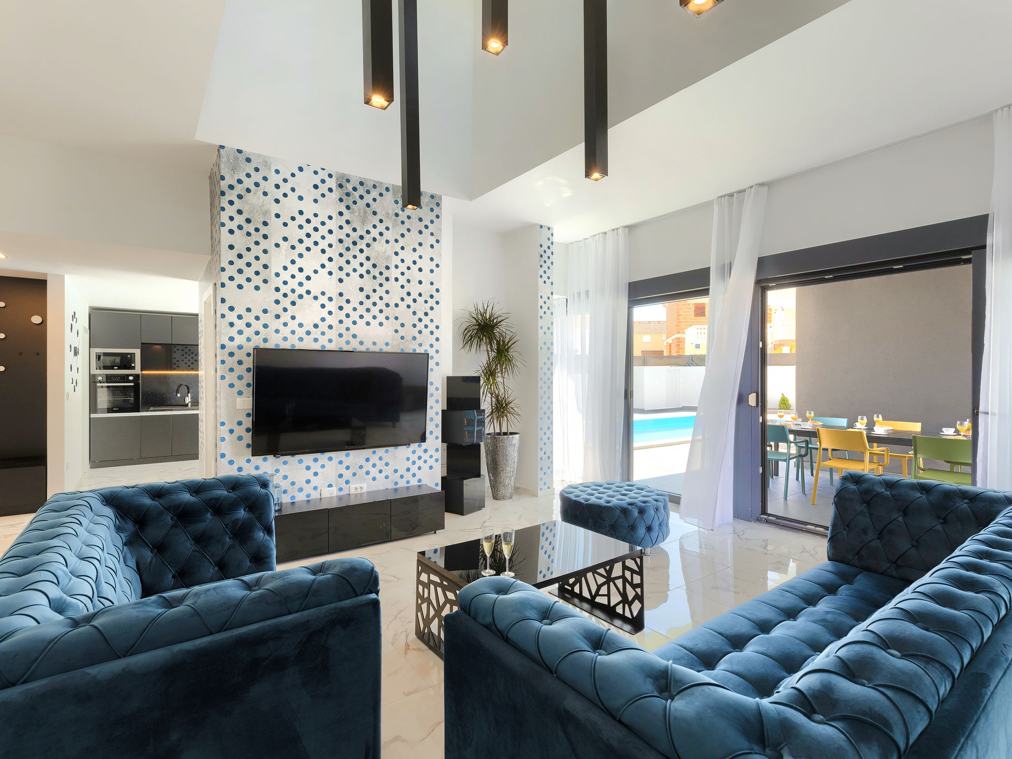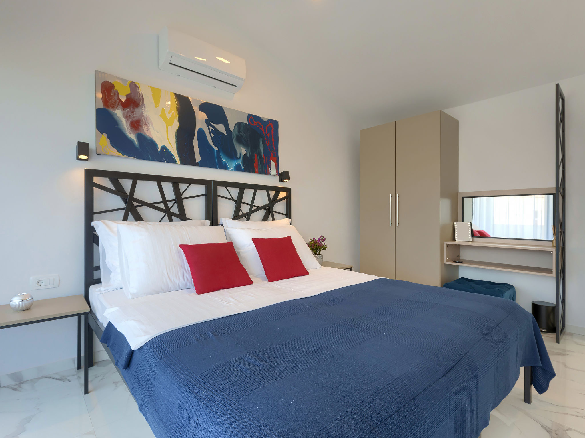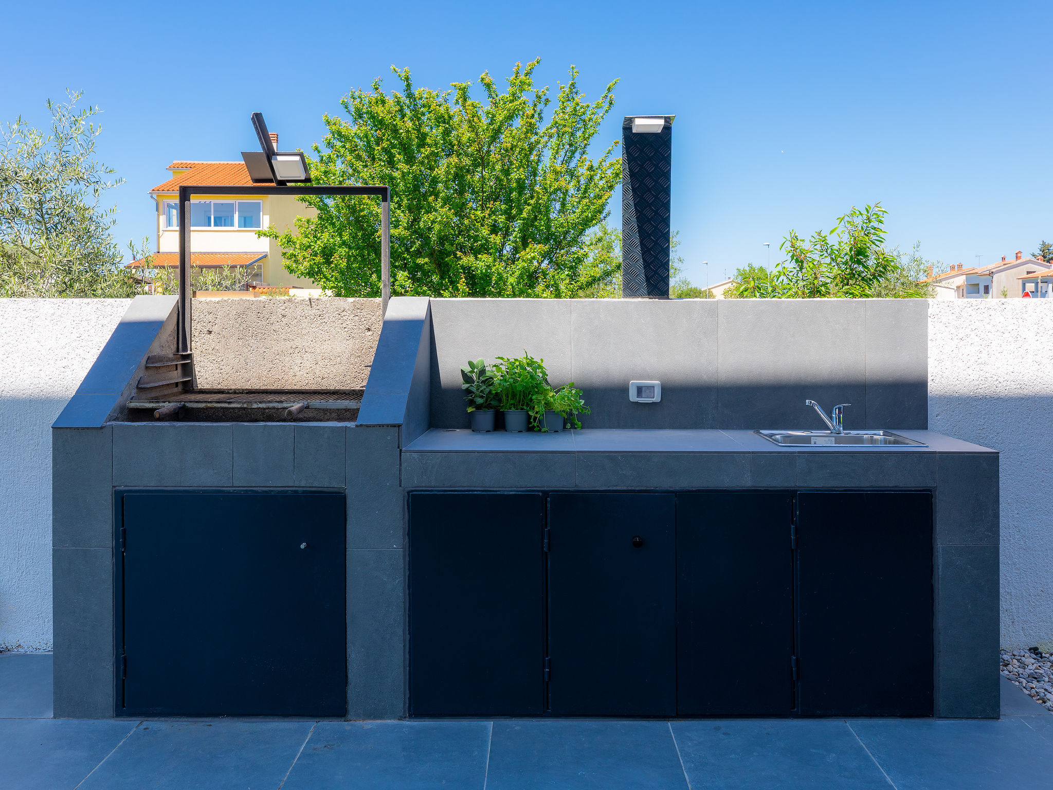 4-Zimmer-Villa 150 m2 auf 2 Stockwerken. Schön und gemütlich eingerichtet: Wohn-/Esszimmer 50 m2 mit Sat-TV und Klimaanlage. Ausgang zur Terrasse, zum Schwimmbad. Offene Küche (Backofen, Geschirrspüler, 2 Glaskeramikherd Platten, 2 Flammen, Wasserkocher, Mikrowelle, Tiefkühler, elektrische Kaffeemaschine). Dusche/WC. Obergeschoss: 1 Zimmer mit 1 franz. Bett (160 cm, Länge 200 cm), Sat-TV und Klimaanlage. Ausgang zur Terrasse. 1 Zimmer mit begehbarer Kleiderschrank mit 1 franz. Bett (160 cm, Länge 200 cm), Dusche/WC, Sat-TV und Klimaanlage. Ausgang zur Terrasse. 1 Zimmer mit 2 Betten (90 cm, Länge 200 cm), Sat-TV und Klimaanlage. Ausgang zur Terrasse. Dusche/WC. Warmluftheizung. Terrasse 4 m2, Terrasse 9 m2. Terrassenmöbel, Liegestühle. Sicht auf das Schwimmbad. Zur Verfügung: Safe, Kinderhochstuhl, Babybett, Haartrockner. Internet (Wireless LAN, gratis). 1 kleines Haustier/Hund erlaubt.