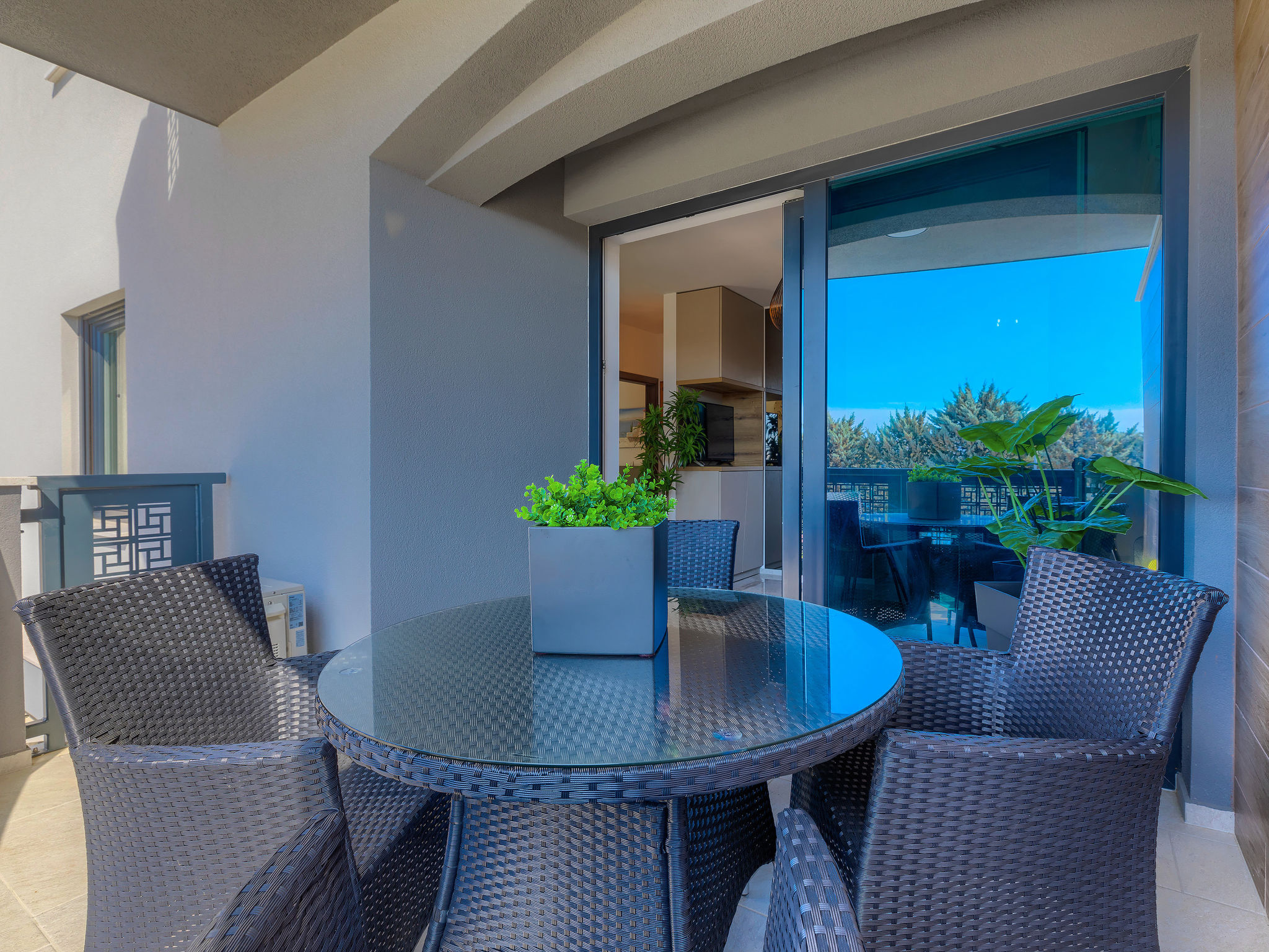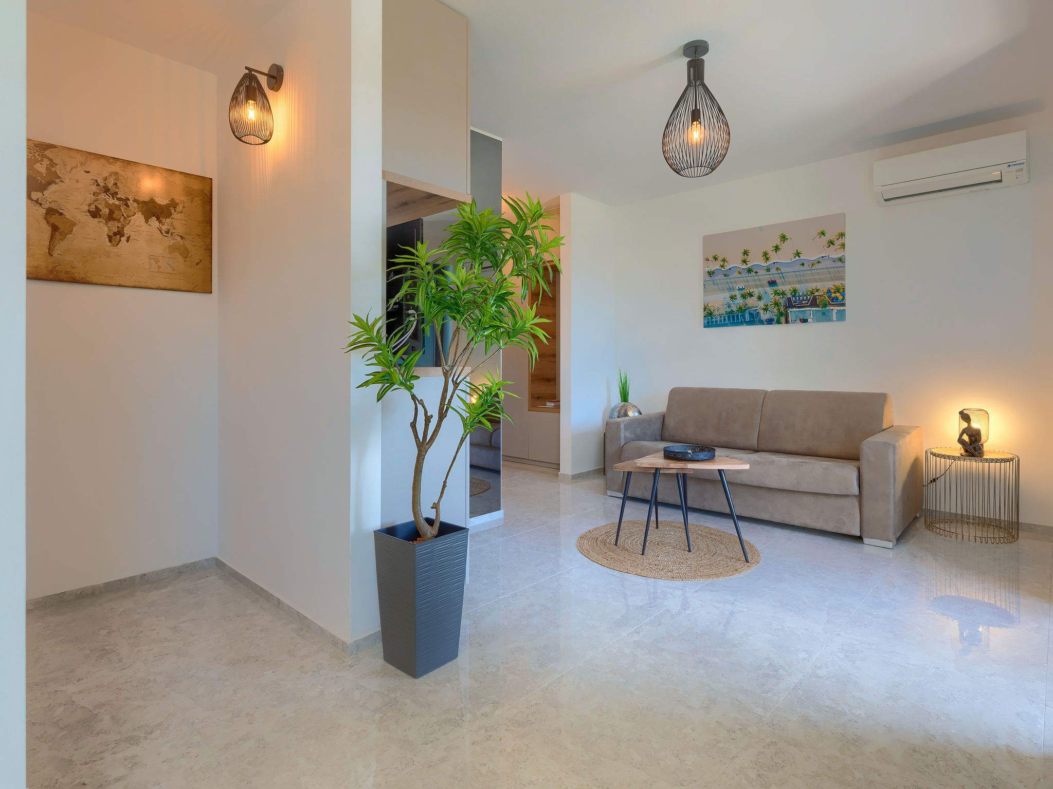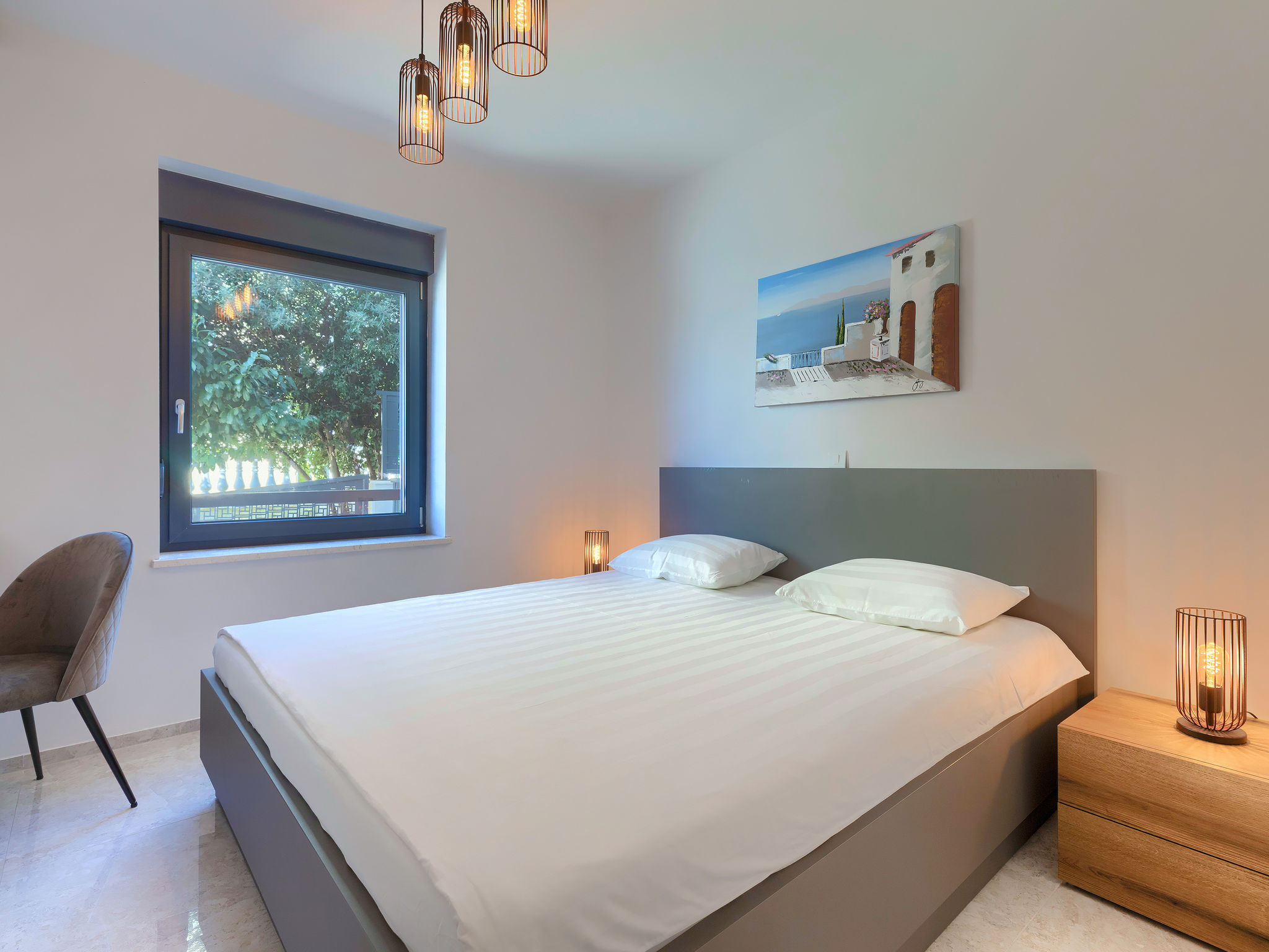 2-Zimmer-Wohnung 45 m2 im 1. Stock. Wohn-/Esszimmer mit 1 Doppeldiwanbett (140 cm, Länge 200 cm), Sat-TV und Klimaanlage. Ausgang zur Terrasse. 1 Zimmer mit 1 franz. Bett (200 cm, Länge 200 cm), Klimaanlage. Offene Küche (Backofen, Geschirrspüler, 4 Glaskeramikherd Platten, Wasserkocher, Mikrowelle, Tiefkühler, elektrische Kaffeemaschine). Dusche/WC. Warmluftheizung. Terrasse 6 m2, überdacht. Terrassenmöbel. Sicht auf das Meer. Zur Verfügung: Waschmaschine, Haartrockner. Internet (Wireless LAN, gratis).