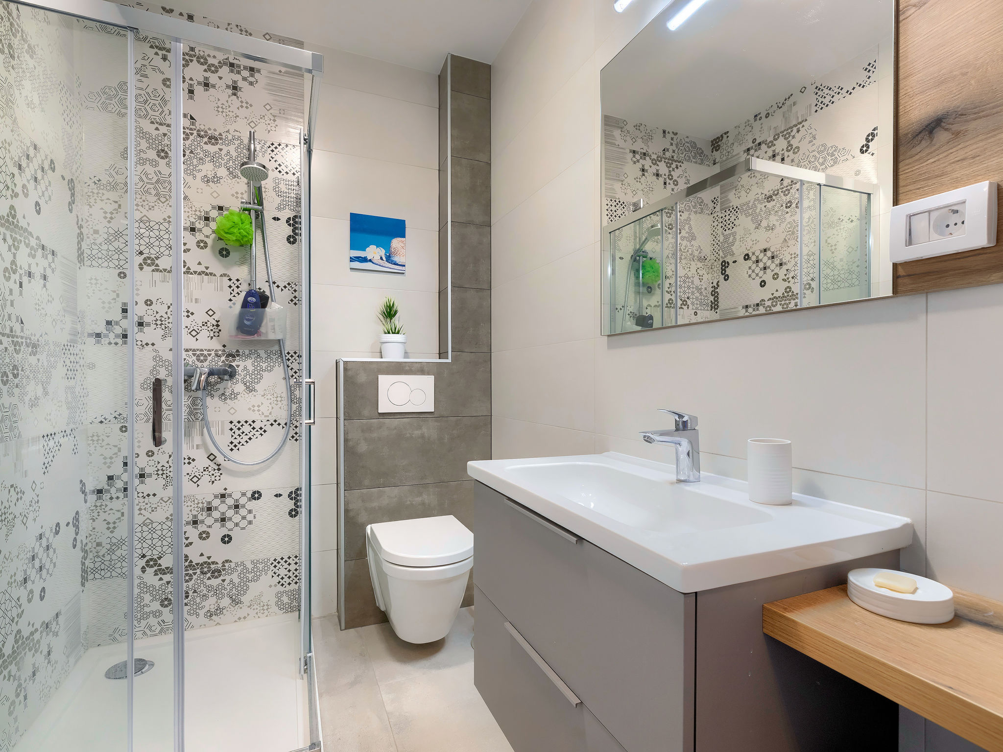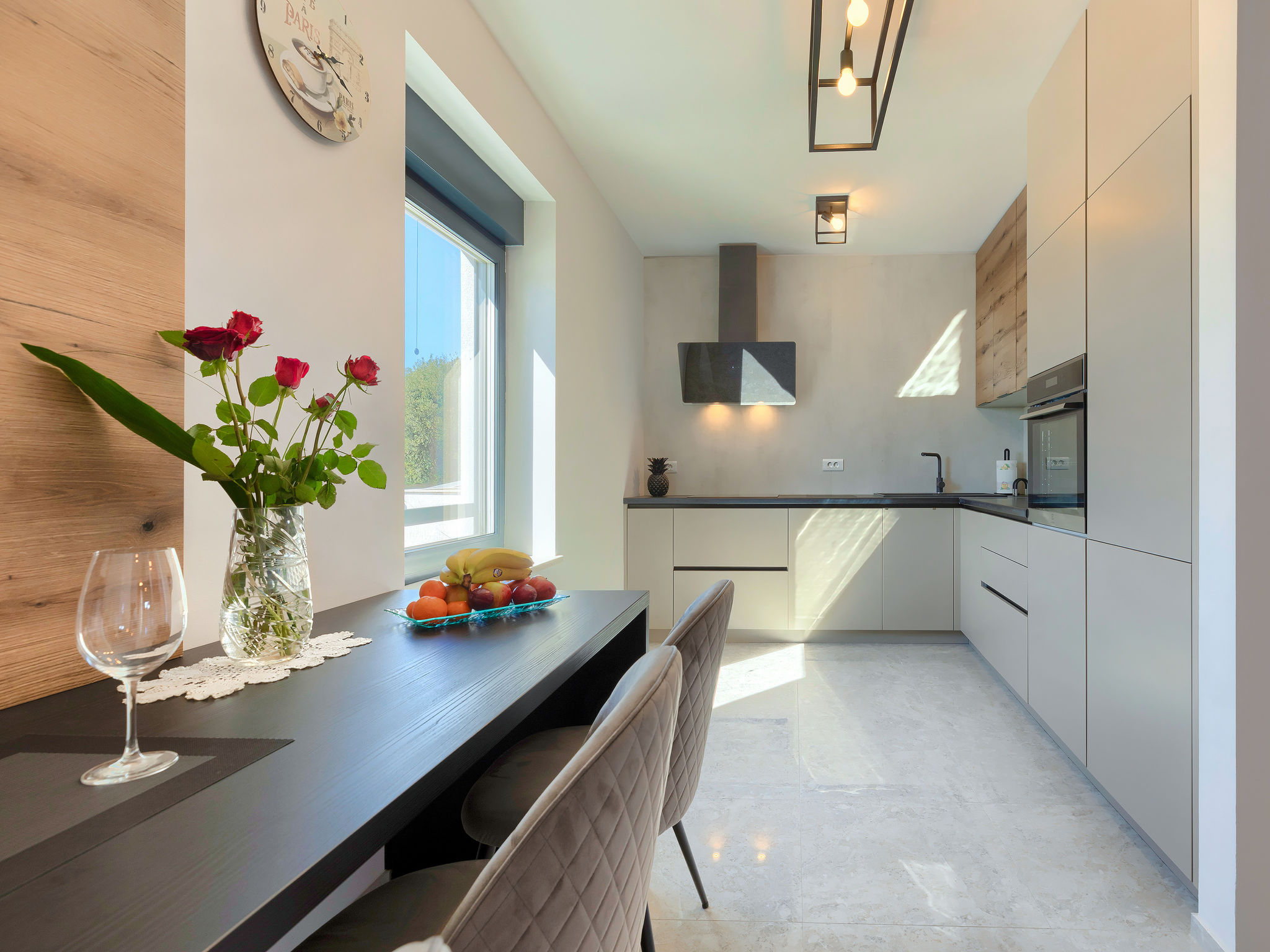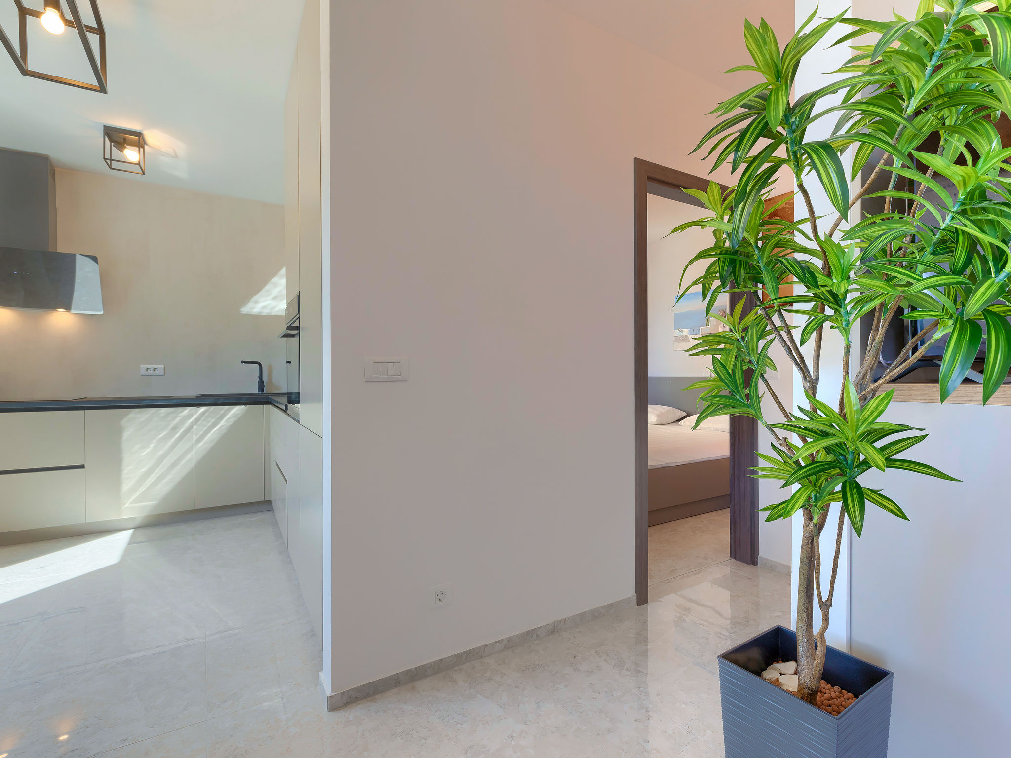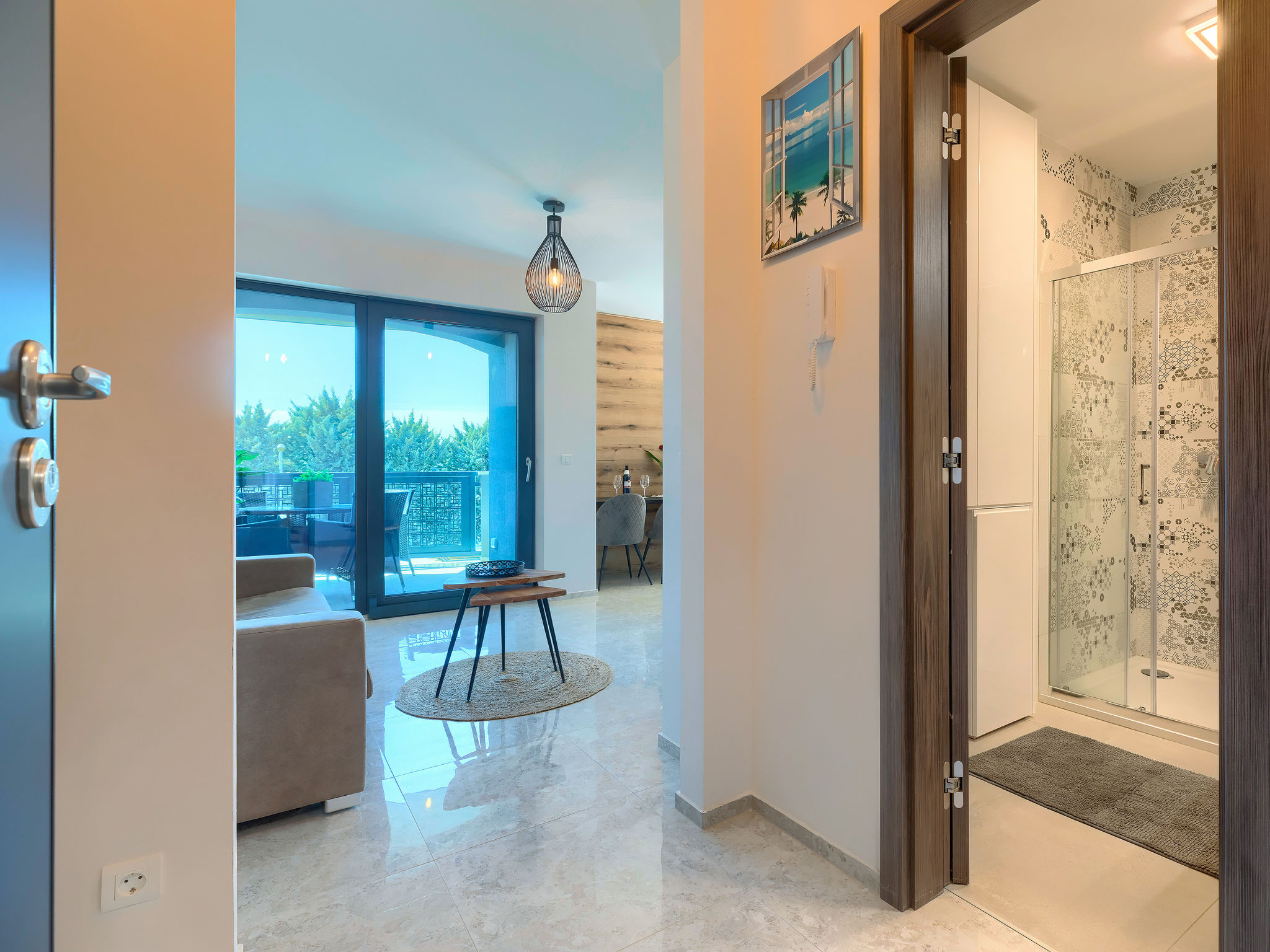 2-Zimmer-Wohnung 45 m2 im 1. Stock. Wohn-/Esszimmer mit 1 Doppeldiwanbett (140 cm, Länge 200 cm), Sat-TV und Klimaanlage. Ausgang zur Terrasse. 1 Zimmer mit 1 franz. Bett (200 cm, Länge 200 cm), Klimaanlage. Offene Küche (Backofen, Geschirrspüler, 4 Glaskeramikherd Platten, Wasserkocher, Mikrowelle, Tiefkühler, elektrische Kaffeemaschine). Dusche/WC. Warmluftheizung. Terrasse 6 m2, überdacht. Terrassenmöbel. Sicht auf das Meer. Zur Verfügung: Waschmaschine, Haartrockner. Internet (Wireless LAN, gratis).
