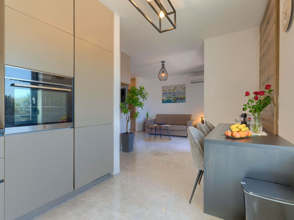 2-Zimmer-Wohnung 45 m2 im 1. Stock. Wohn-/Esszimmer mit 1 Doppeldiwanbett (140 cm, Länge 200 cm), Sat-TV und Klimaanlage. Ausgang zur Terrasse. 1 Zimmer mit 1 franz. Bett (200 cm, Länge 200 cm), Klimaanlage. Offene Küche (Backofen, Geschirrspüler, 4 Glaskeramikherd Platten, Wasserkocher, Mikrowelle, Tiefkühler, elektrische Kaffeemaschine). Dusche/WC. Warmluftheizung. Terrasse 6 m2, überdacht. Terrassenmöbel. Sicht auf das Meer. Zur Verfügung: Waschmaschine, Haartrockner. Internet (Wireless LAN, gratis).