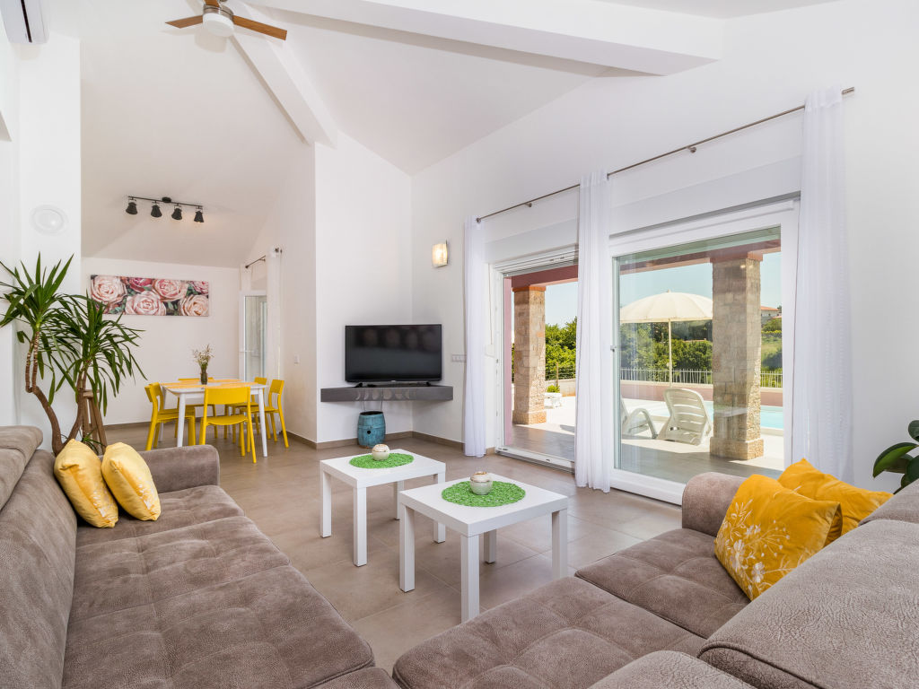 4-Zimmer-Haus 130 m2. Schön und gemütlich eingerichtet: Wohn-/Esszimmer mit 1 Doppeldiwanbett (140 cm, Länge 200 cm), Sat-TV und Klimaanlage. Ausgang zur Terrasse, zum Schwimmbad. 1 Zimmer mit 1 franz. Bett (180 cm, Länge 200 cm), Dusche/WC und Klimaanlage. Ausgang zur Terrasse. 1 Zimmer mit 1 franz. Bett (160 cm, Länge 200 cm), Dusche/WC und Klimaanlage. 1 Zimmer mit 1 franz. Bett (160 cm, Länge 200 cm). Ausgang zur Terrasse. Offene Küche (Backofen, Geschirrspüler, 4 Induktionskochplatten, Toaster, Wasserkocher, Mikrowelle, Tiefkühler, elektrische Kaffeemaschine). Dusche/WC. Warmluftheizung. Terrasse 26 m2 teilweise überdacht, Terrasse 8 m2. Terrassenmöbel, Liegestühle. Sicht auf das Schwimmbad. Zur Verfügung: Waschmaschine, Haartrockner. Internet (Wireless LAN, gratis). Bitte beachten: Nichtraucher-Haus. Maximal 2 Haustiere/Hunde erlaubt. 3 Schlafzimmer und Dusche/WC befinden sich 3 Stufen über dem Wohnzimmer, Esszimmer und Küche.
