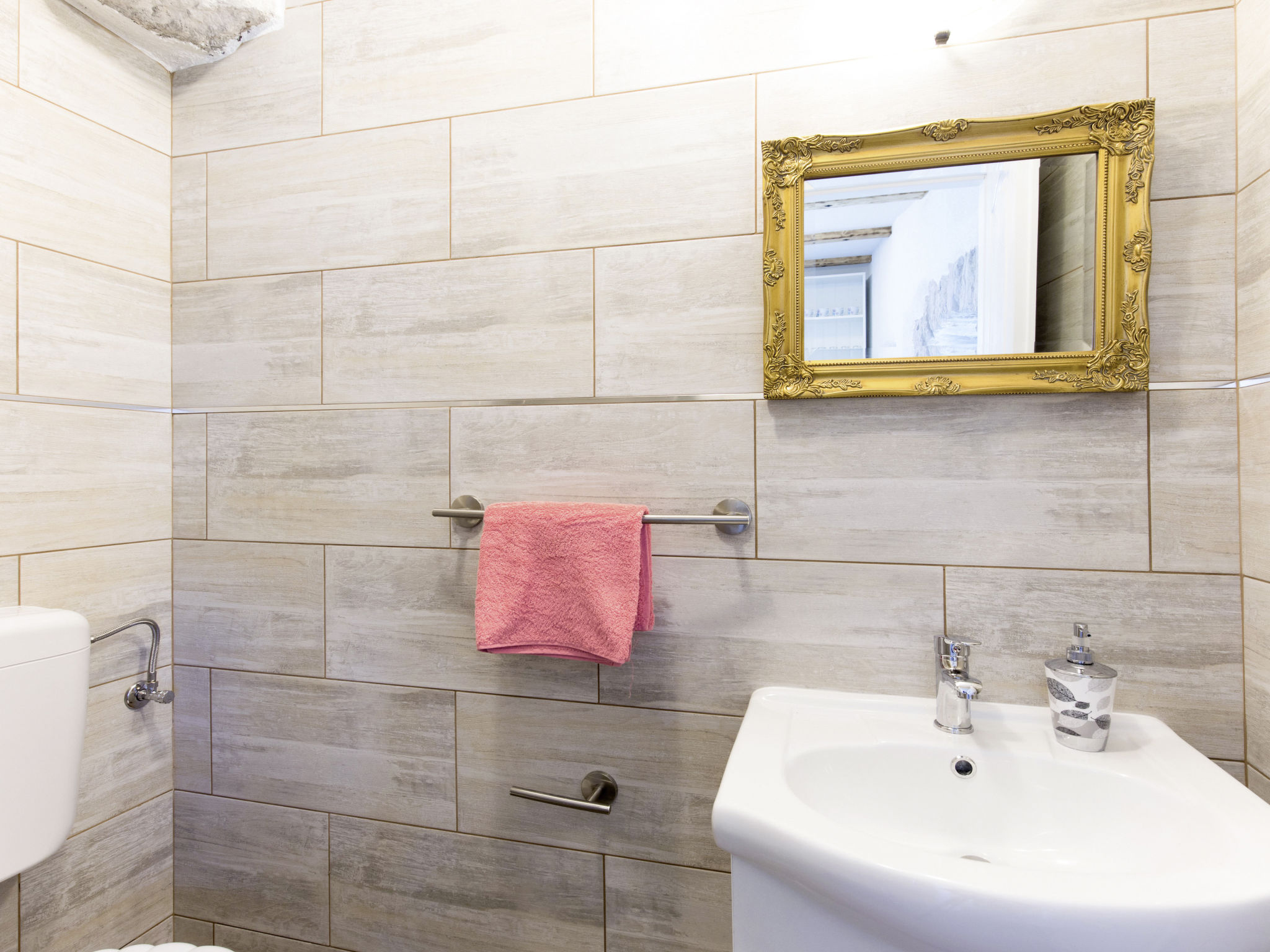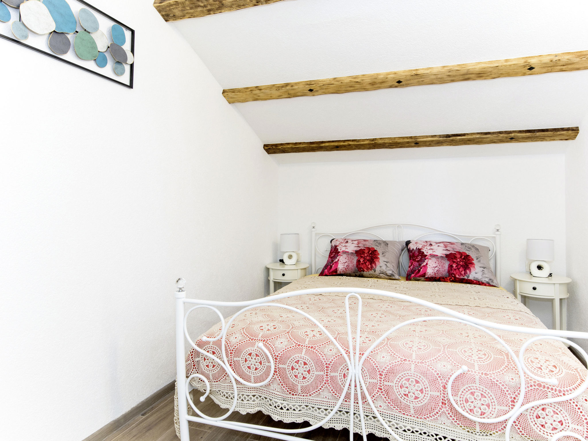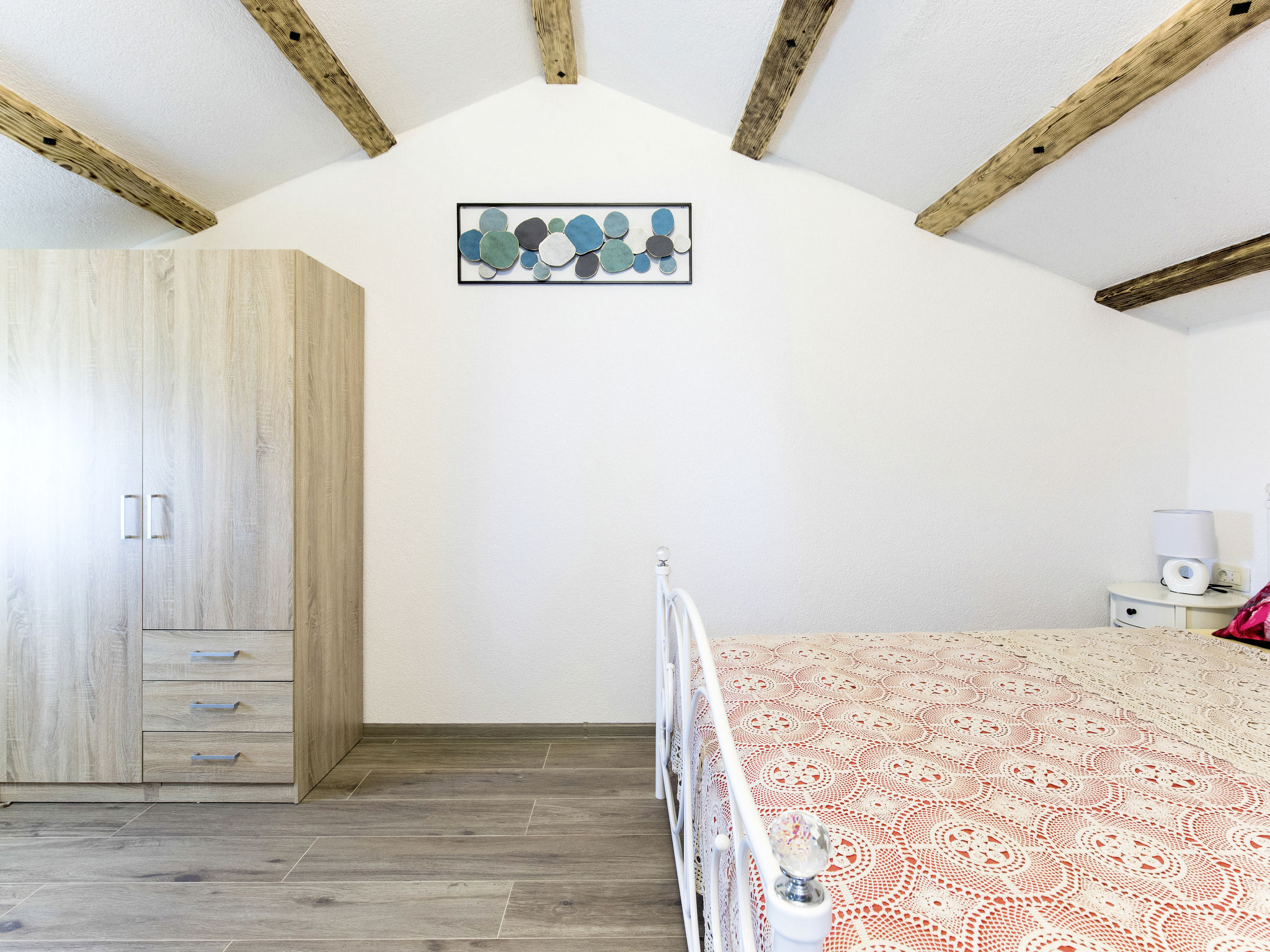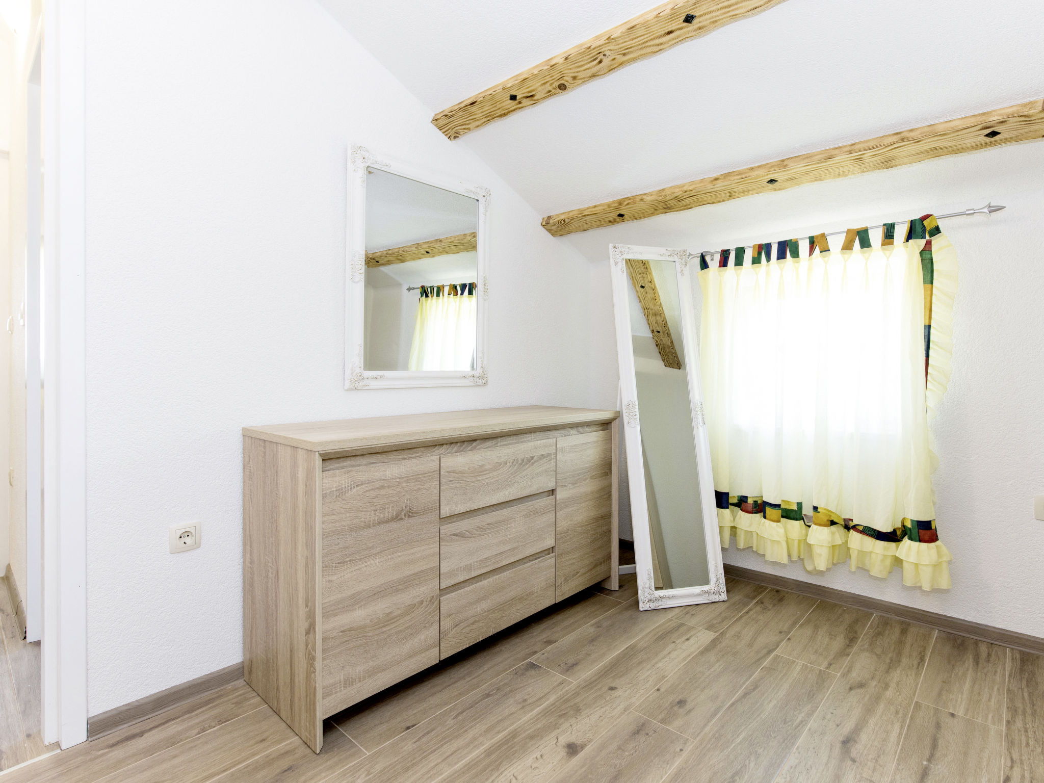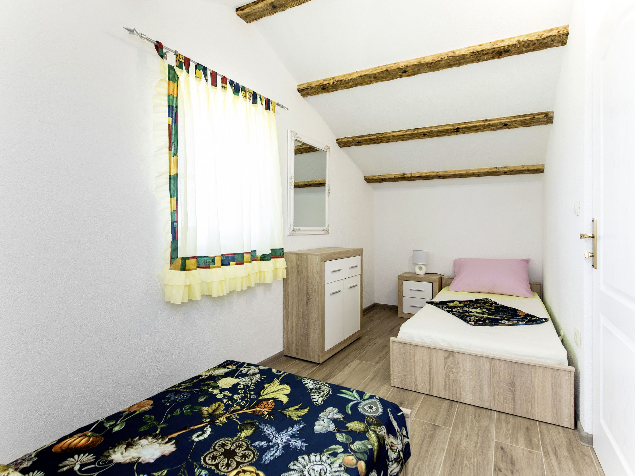 3-Zimmer-Reihenhaus 50 m2 auf 2 Stockwerken im 1. Stock. Objekt geeignet für 6 Erwachsene. Wohn-/Esszimmer mit 1 Doppeldiwanbett und Sat-TV. Ausgang zur Terrasse. Offene Küche (2 Glaskeramikherd Platten, Toaster, Wasserkocher, Mikrowelle, elektrische Kaffeemaschine). Dusche/WC. Obergeschoss: (geländerlose Treppe) 1 abgeschrägtes Zimmer mit 1 franz. Bett (160 cm). 1 abgeschrägtes Zimmer mit 2 Betten. Dusche/WC. Klimaanlage. Terrasse 45 m2. Terrassenmöbel, Gartengrill, Liegestühle (2), Abstellkammer. Sicht auf das Meer. Zur Verfügung: Waschmaschine, Bügeleisen. Internet (Wireless LAN, gratis). Parkplatz (1 Auto) beim Haus. Bitte beachten: Nichtraucher-Haus. Maximal 2 Haustiere/Hunde erlaubt.