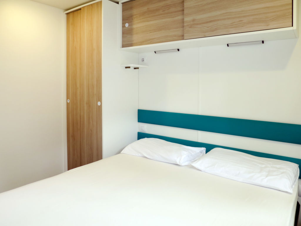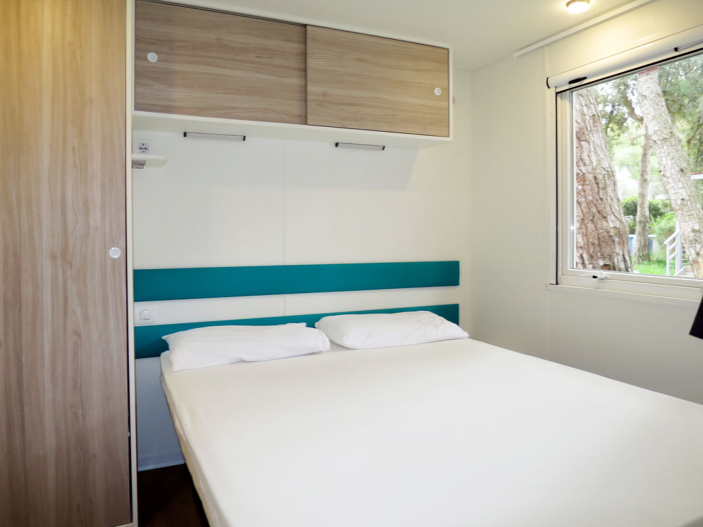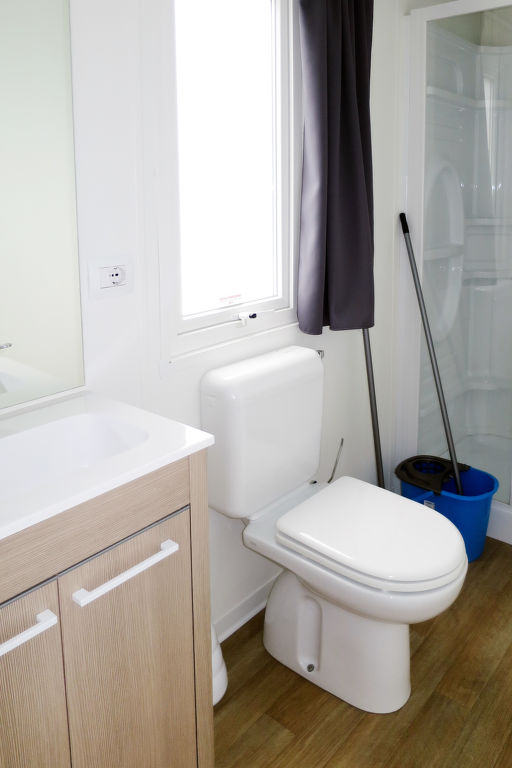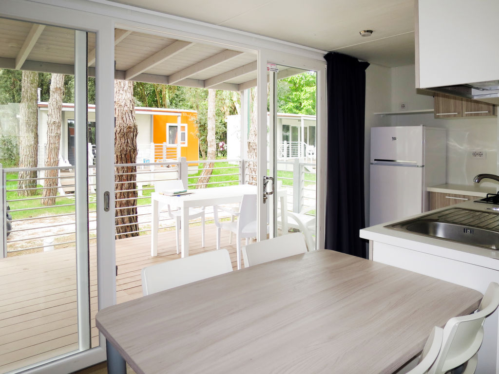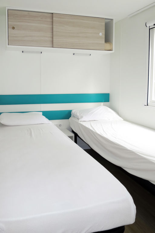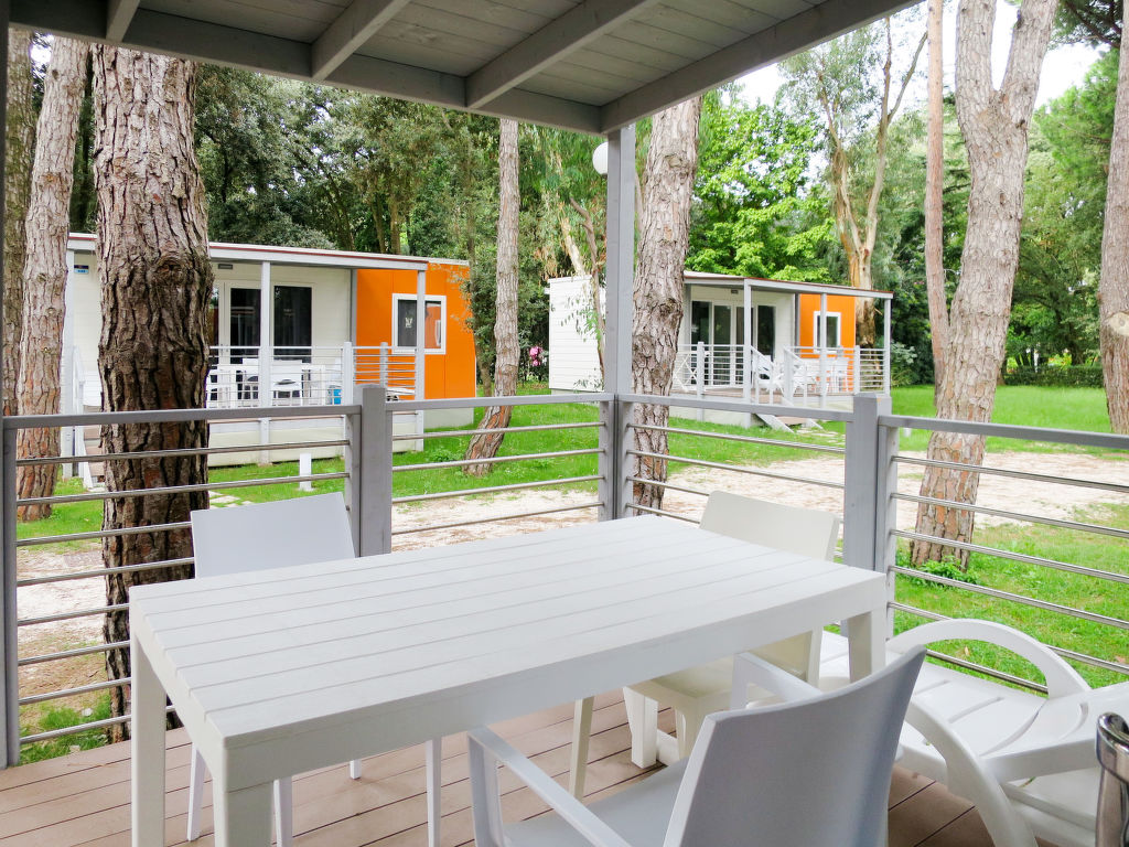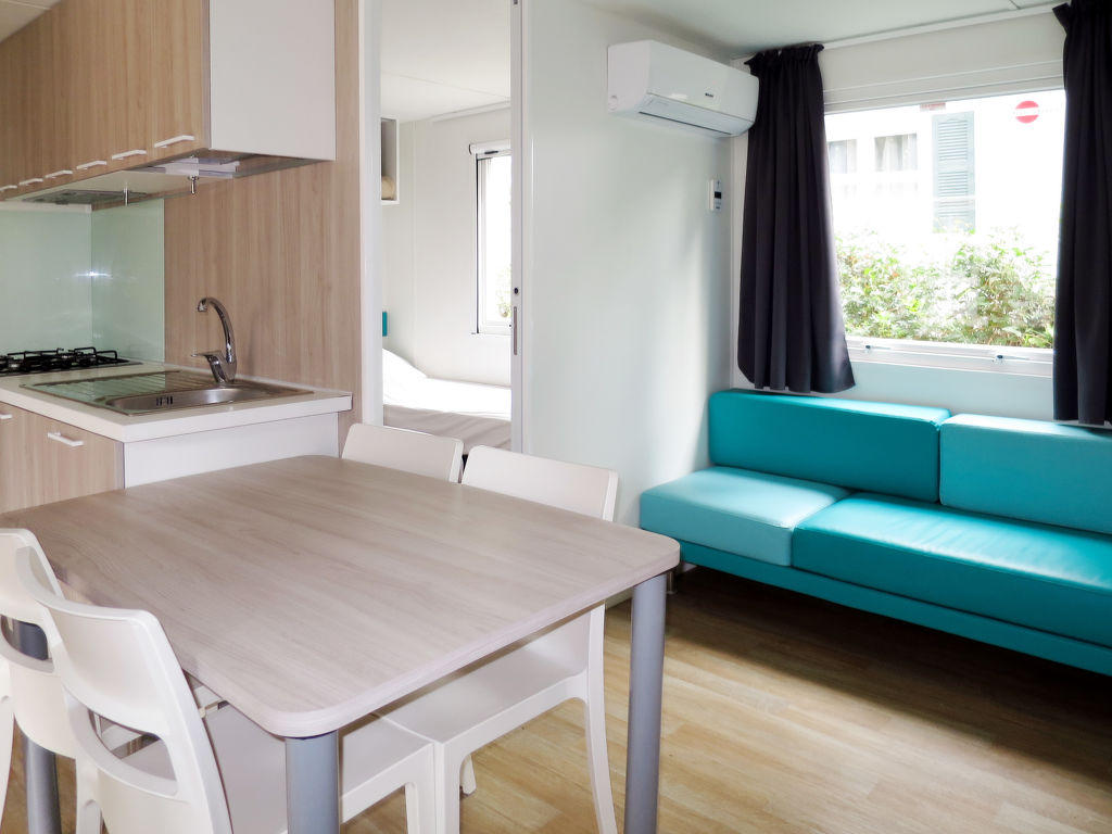 "Camping Village Baia Domizia (BDO124)", 3-Zimmer-Mobilheim 29 m2. Zweckmässig eingerichtet: Wohn-/Schlafzimmer mit 1 Diwanbett, Esstisch und Sat-TV. Ausgang zur Terrasse. 1 Zimmer mit 1 franz. Bett (160 cm). 1 Zimmer mit 2 Betten (80 cm). Kochnische (4 Flammen, Tiefkühler). Dusche/WC. Klimaanlage. Keine Heizmöglichkeit. Terrasse, Laube. Terrassenmöbel, Liegestühle (1). Zur Verfügung: Kinderhochstuhl, Babybett. Internet (Wireless LAN, extra). Parkplatz. Bitte beachten: Nichtraucher-Unterkunft.