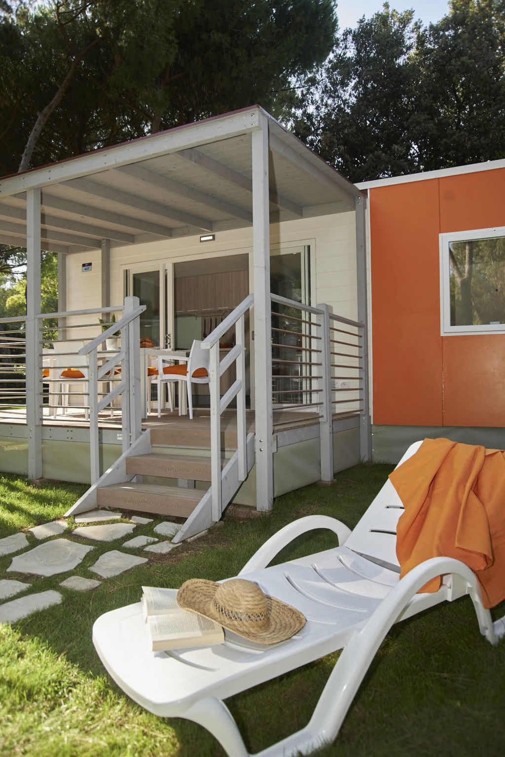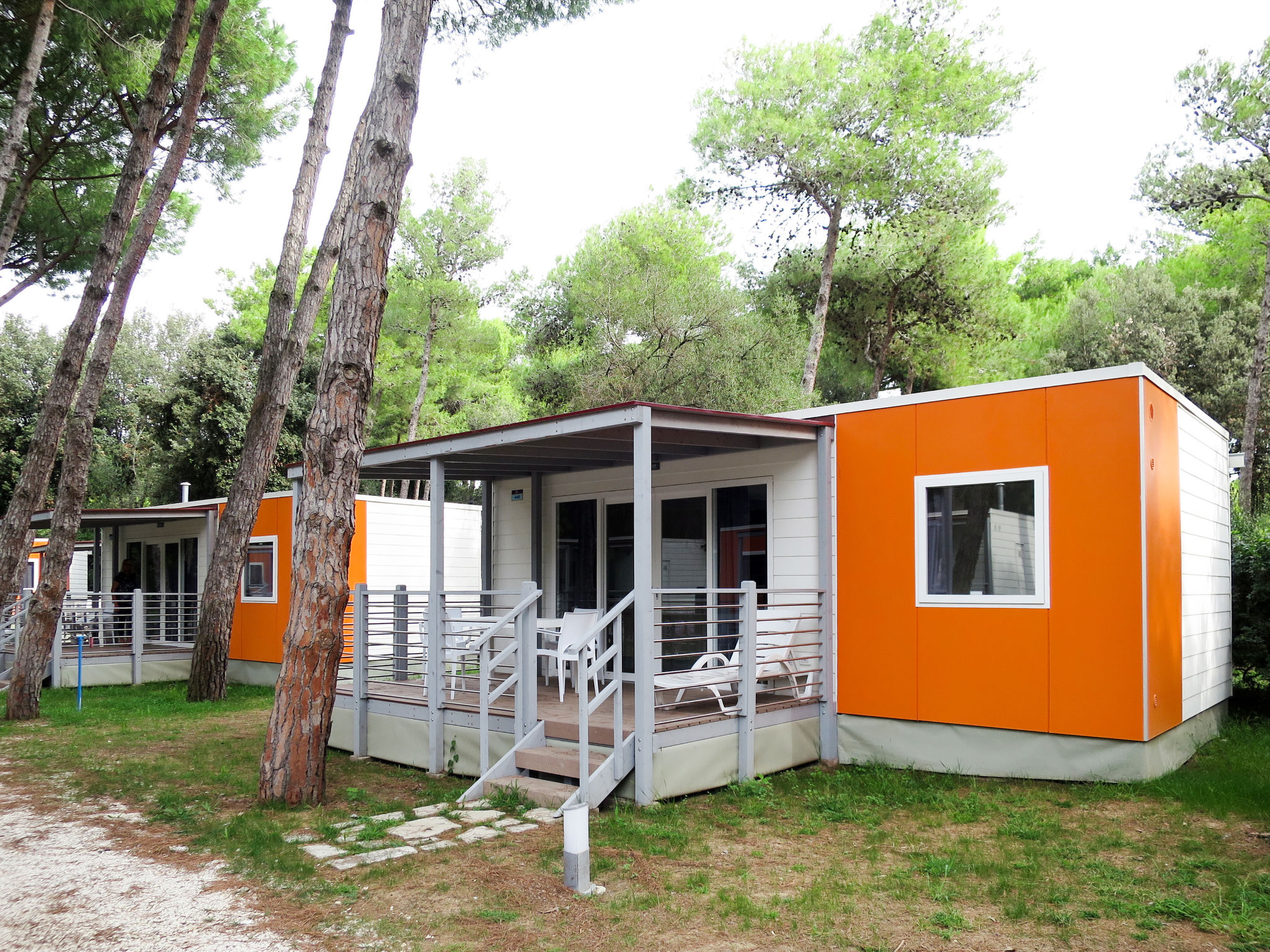 "Camping Village Baia Domizia (BDO124)", 3-Zimmer-Mobilheim 29 m2. Zweckmässig eingerichtet: Wohn-/Schlafzimmer mit 1 Diwanbett, Esstisch und Sat-TV. Ausgang zur Terrasse. 1 Zimmer mit 1 franz. Bett (160 cm). 1 Zimmer mit 2 Betten (80 cm). Kochnische (4 Flammen, Tiefkühler). Dusche/WC. Klimaanlage. Keine Heizmöglichkeit. Terrasse, Laube. Terrassenmöbel, Liegestühle (1). Zur Verfügung: Kinderhochstuhl, Babybett. Internet (Wireless LAN, extra). Parkplatz. Bitte beachten: Nichtraucher-Unterkunft.
