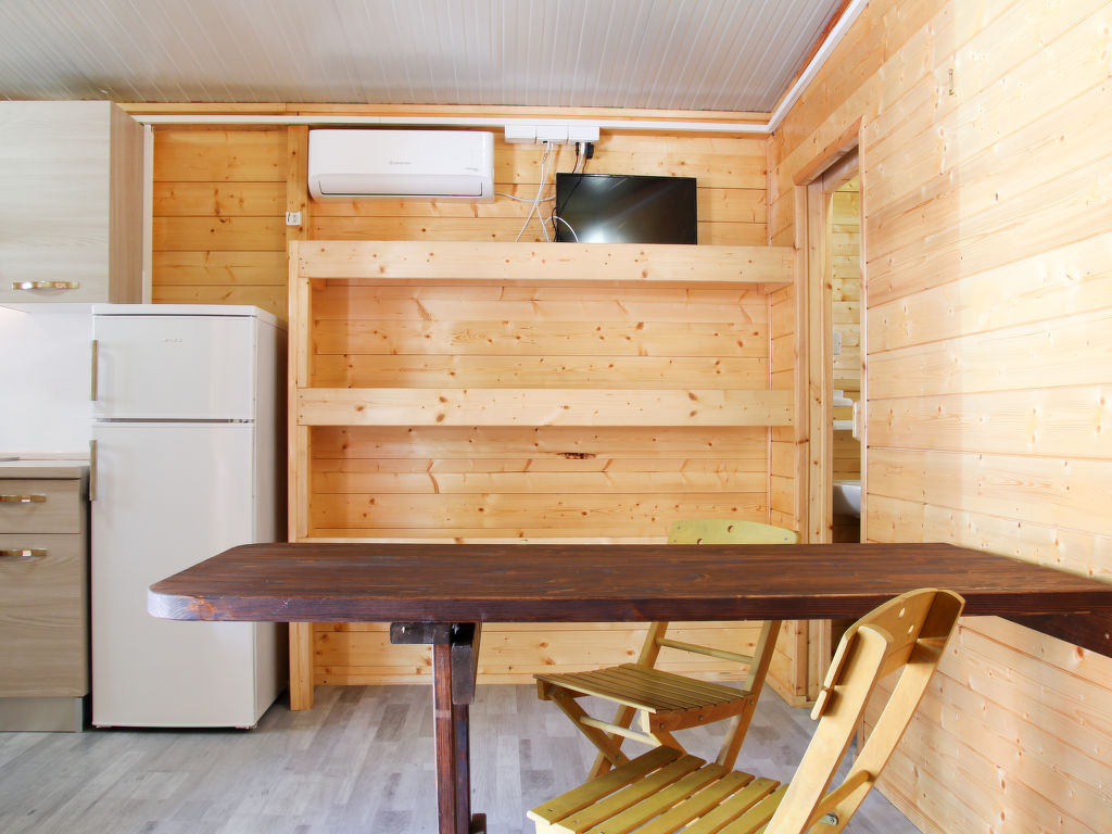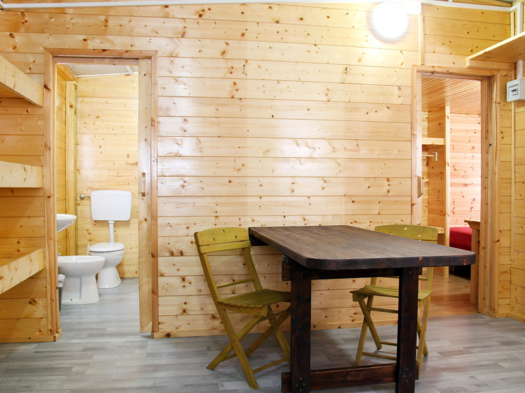 "Chalet Atlantico", 3-Zimmer-Bungalow 35 m2. Objekt geeignet für 5 Erwachsene + 1 Kind. Zweckmässig und mit viel Holz eingerichtet: Esszimmer mit Sat-TV, Klimaanlage und Warmluftheizung. 1 Zimmer mit 1 Bett und 1 franz. Bett (140 cm). 1 Zimmer mit 2 Betten und 1 x 1 Etagenbetten. Offene Küche (4 Flammen, Tiefkühler). Dusche/WC. Terrasse überdacht. Terrassenmöbel. Zur Verfügung: Safe (extra). Parkplatz (1 Auto). Maximal 2 Haustiere/Hunde erlaubt.