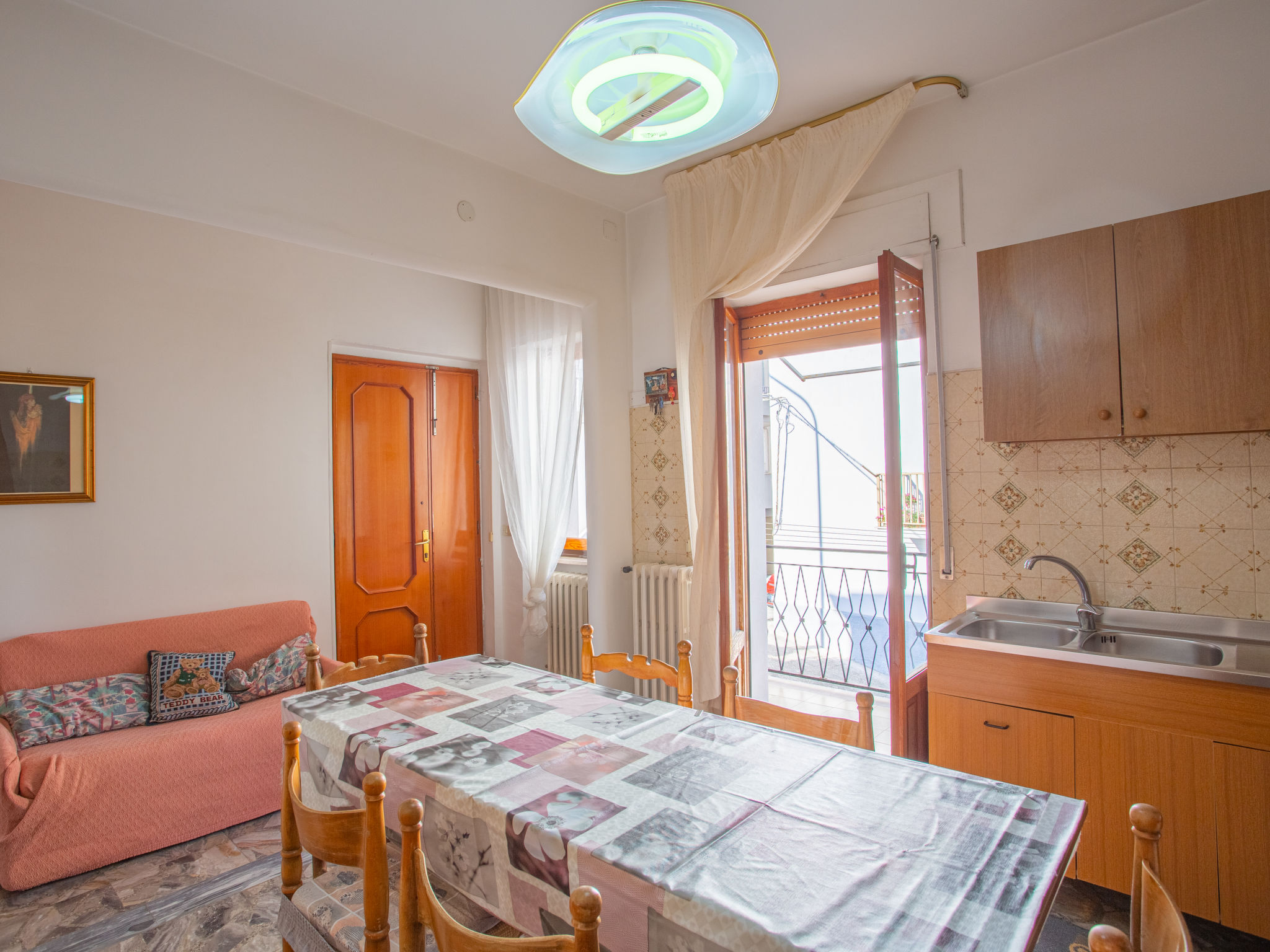 Zweifamilienhaus "Villa Teresa", auf 2 Stockwerken. 200 m vom Zentrum von Peschici, 20 km vom Zentrum von Vieste, 15 km vom Zentrum von Rodi Garganico, zentrale Lage, 2 km vom Meer. Wäschewechsel (zusätzlich extra). Handtuchwechsel (zusätzlich extra). Öffentliche Parkplätze auf der Strasse extra. Einkaufsgeschäft 100 m, Supermarkt 400 m, Restaurant, Bar, Café 200 m, Bahnstation "Calenella" 6 km, Sandstrand 2 km. Bitte beachten: Be- und Entladen am Ferienhaus möglich. Der Besitzer wohnt im selben Haus.