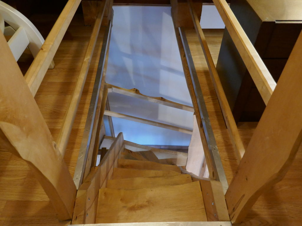 2-Zimmer-Haus, 2 Etagen, ca. 50 m². Außentreppe über Terrasse ins Hochparterre: Wohnraum mit Essplatz, Kamin und Küchenzeile (4 Ceranfelder, Backofen, zusätzlicher Holzherd, Kühlschrank, Kaffeemaschine, Wasserkocher, Toaster). Dusche/WC. Vom Wohnraum Holz-Wendeltreppe in die Mansarde (zum Wohnraum offen, offener Holzdachstuhl, seitlich keine Stehhöhe, Holzdielenboden): Schlafzimmer mit Doppelbett und franz. Bett (1,60 m breit). Hinweis: Auf der Wendeltreppe muss man sich kurz unter zwei wuchtigen Holzbalken bücken.