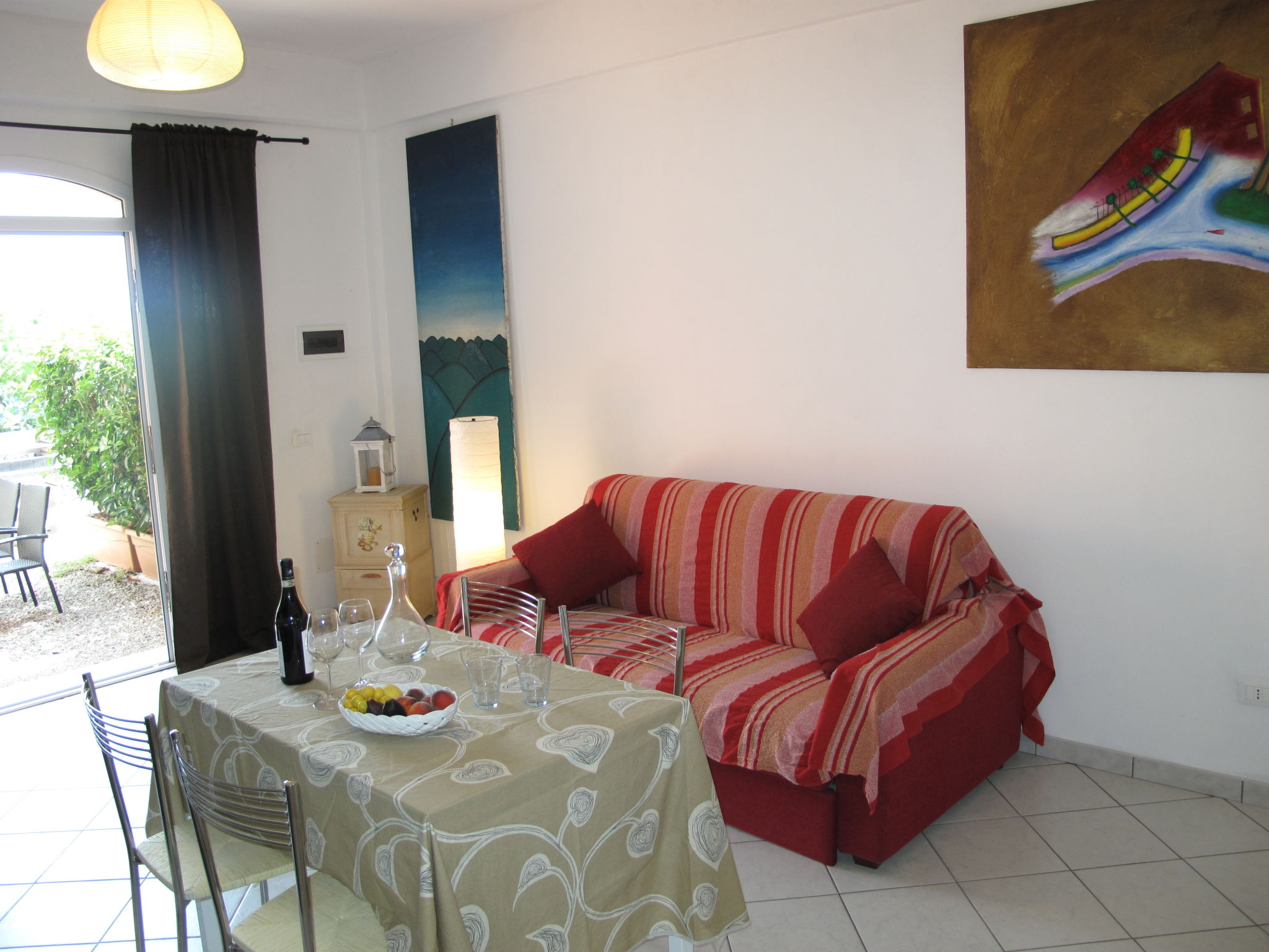 Der AGRITURISMO LA TUFFATRICE steht 1,5 km außerhalb von San Lorenzo al Mare auf einer Hangterrasse am Ende einer Stichstraße, mit schönem Blick auf das nahegelegene Meer. Nächster Sandstrand ca. 800 m. Yachthafen 1 km. Supermarkt 1,8 km. Bushaltestelle ca. 300 m. Die Küstenstraße verläuft ca. 50 m unterhalb. 5 Parkplätze auf dem Grundstück, ca. 100 m von den Wohnungen entfernt. Zufahrt zu den Wohnungen zum Be- und Entladen frei. Ca. 600 m² großes Grundstück, teils mit Wiese und einigen Bäumen, teils gepflastert. Kleine Gemeinschaftsterrasse (4 Stühle). Der Agriturismo besteht aus 5 Ferienwohnungen, einer dauervermieteten Wohnung und der Wohnung der Besitzer. Die Wohnungen SLR 350-353 befinden sich auf der dem Meer zugewandten Süd-Ost-Seite, die Wohnung SLR 354 liegt auf der Hausrückseite (Nord-Ost-Richtung). Seitlich des Grundstücks die Gewächshäuser der Besitzer. Zu den Wohnungen SLR 350 und SLR 351 gehört jeweils ein kleiner gekiester Freisitz mit Mobiliar, Sonnenschirm und transportablem Grill. SLR 352 und SLR 353 haben nebeneinanderliegende, durch Hecke sichtgeschützte Freisitze mit Mobiliar und Sonnenschirm und teilen sich einen gemauerten Grill. SLR 354 mit großer, teilüberdachter, wind- und sichtgeschützter Naturstein-Terrasse mit Mobiliar, Sonnenschirm, Sitzgruppe und gemauertem Grill. Die Wohnungen sind feriengerecht eingerichtet und haben Fliesenboden. Sat-TV. Internetzugang (WLAN, inklusive). Waschmaschine. Gas-Zentralheizung.