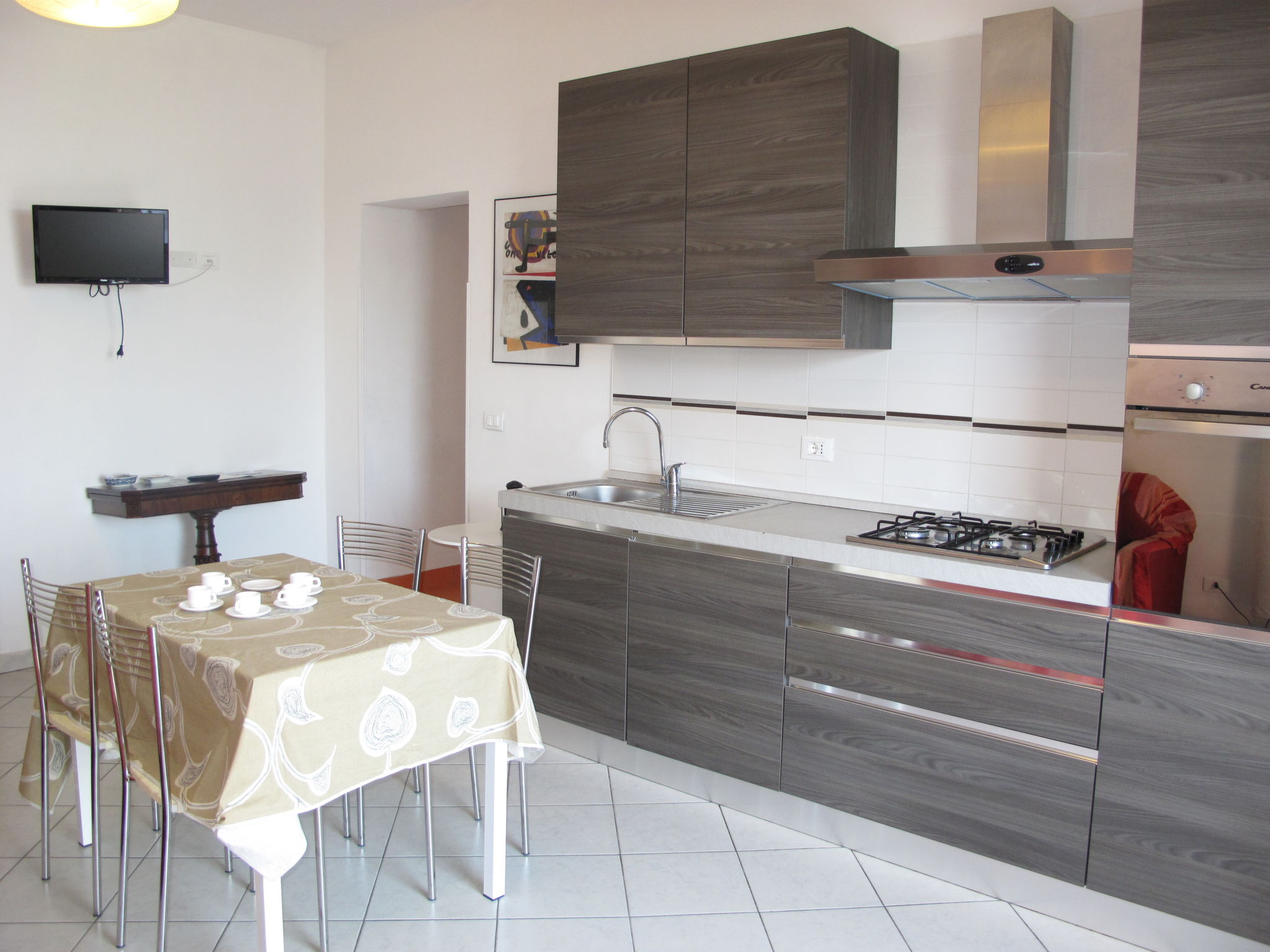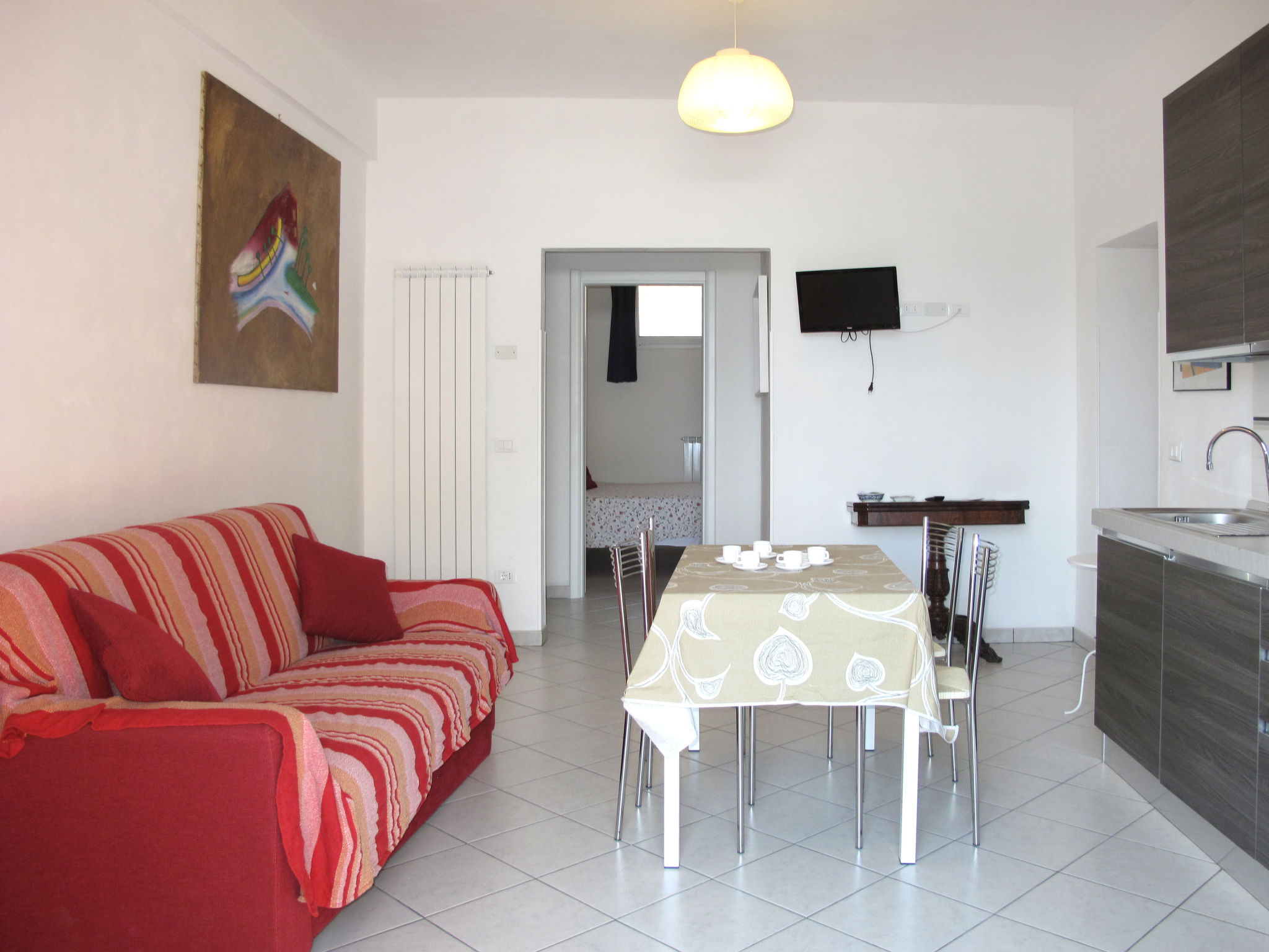 2-Zimmer-Wohnung 'Orange', Erdgeschoss, ca. 40 m². Separater Zugang über 2 Stufen. Wohn-/Schlafraum mit Doppelbettcouch, Essplatz und Küchenzeile (4 Flammen, Backofen, Kühl-/Gefrierkombination, Kaffeemaschine, Wasserkocher, Toaster), Ausgang ins Freie. Schlafzimmer (hochgelegenes Fenster) mit franz. Bett (1,60 m breit) und Bettcouch. Dusche/Bidet/WC. CITR: 008031-AGR-0015