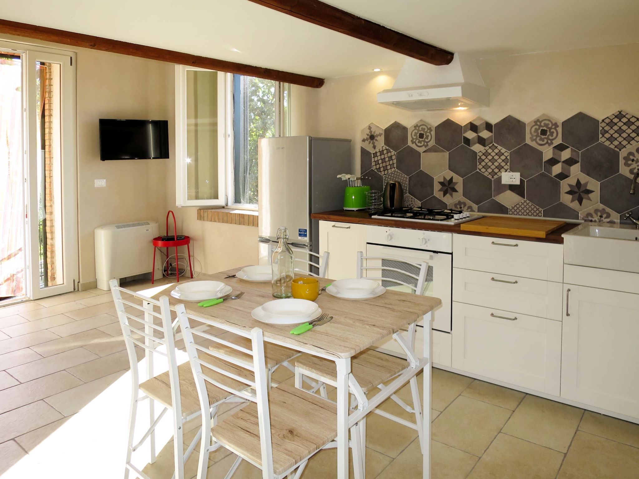 Landhaus "L'Essiccatoio". 3 Wohnungen in der Residenz. 5 km vom Zentrum von Bolsena, 9 km vom Zentrum von Montefiascone, 110 km vom Zentrum von Roma, 350 m vom See, im Grünen. Zur Mitbenutzung: naturbelassenes Grundstück 30 ha mit Bäumen, Schwimmbad (15 x 5 m, 140 cm tief, saisonale Verfügbarkeit: 16.Mai.-03.Okt.). Aussendusche, Grill. Im Hause: Waschmaschine (zur Mitbenutzung, extra). Supermarkt 4 km, Grasstrand "Lago di Bolsena" 350 m. Das Schwimmbad gehört zum Landgut Sant'Antonio, das 450 m vom Haus entfernt ist.
