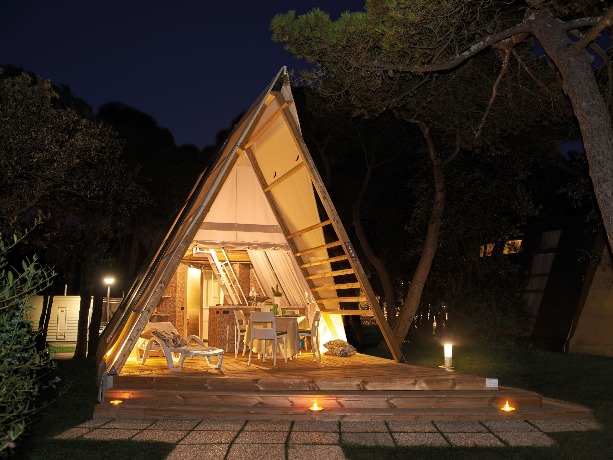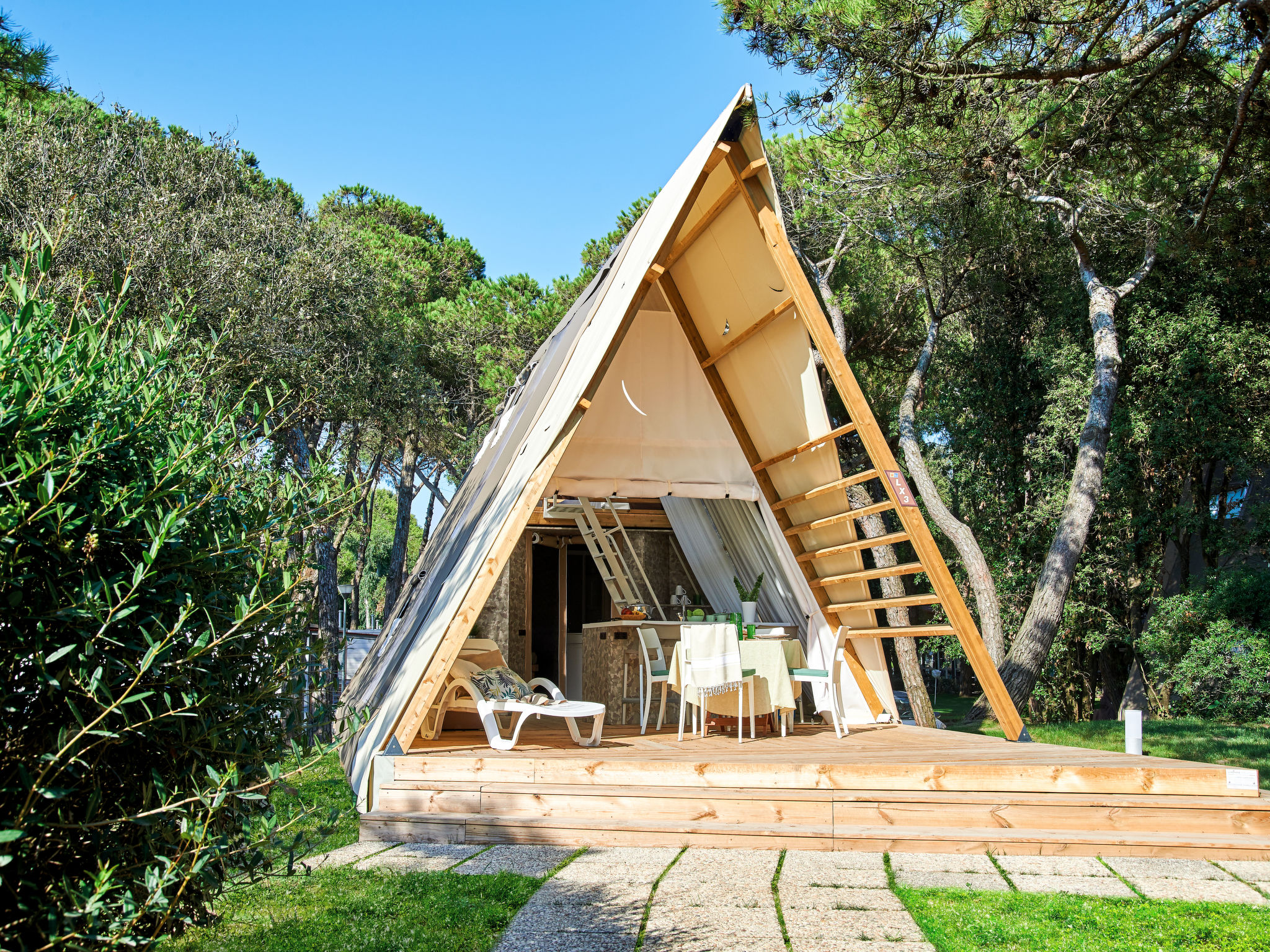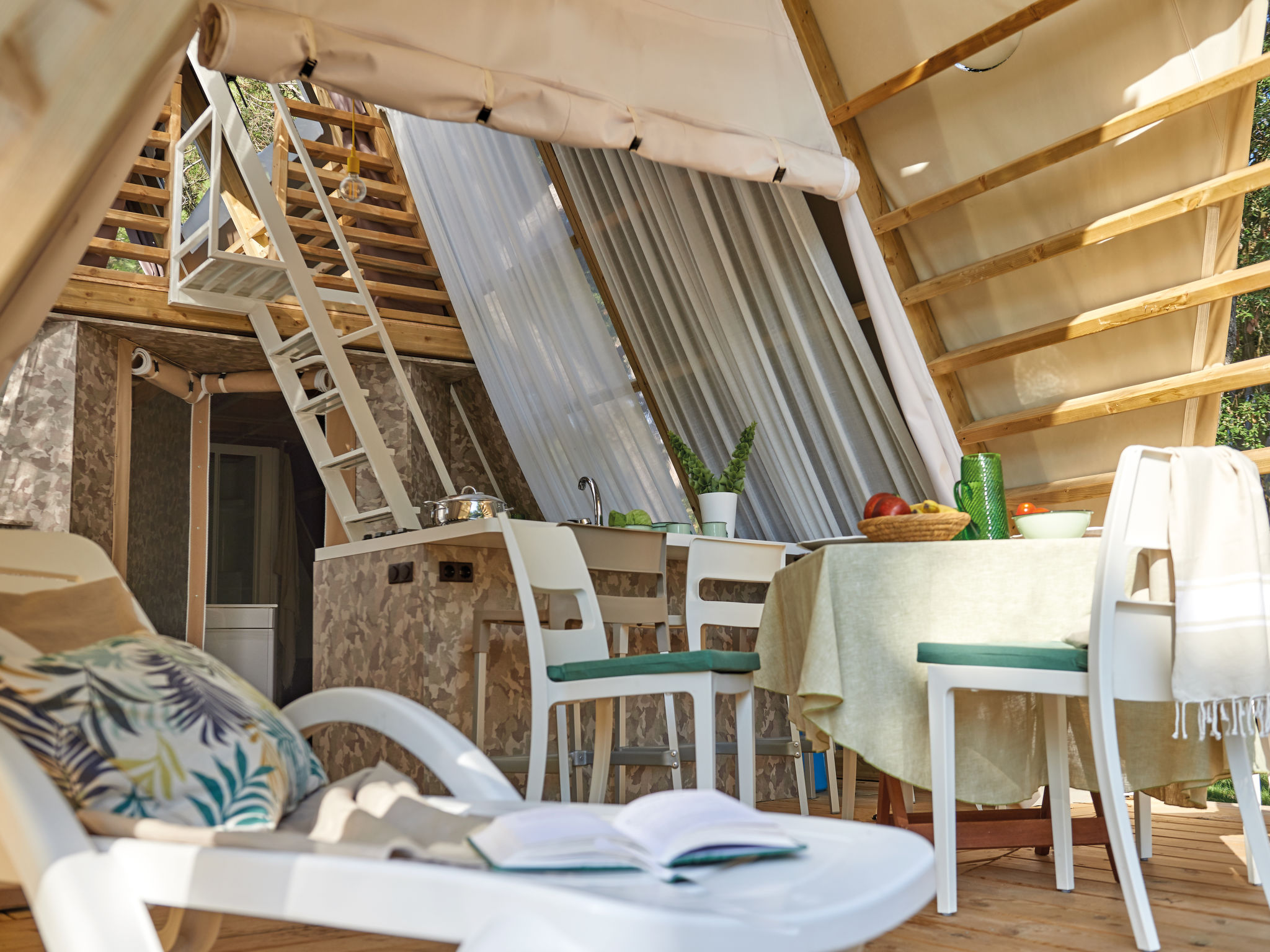 3-Zimmer-Lodge-Zelt, 2 Etagen, ca. 36 m². Zugang über 3 Stufen und Terrasse mit Essplatz. Wohnküche (4 Flammen, Kühlschrank) mit Bettcouch. Schlafzimmer mit franz. Bett. Dusche/WC. Von der Küche Leiter ins Dachgeschoss: Zweibettzimmer (Betten 0,70 m breit, Dachschräge, eingeschränkte Stehhöhe, Raum nicht durch Tür abgeschlossen).