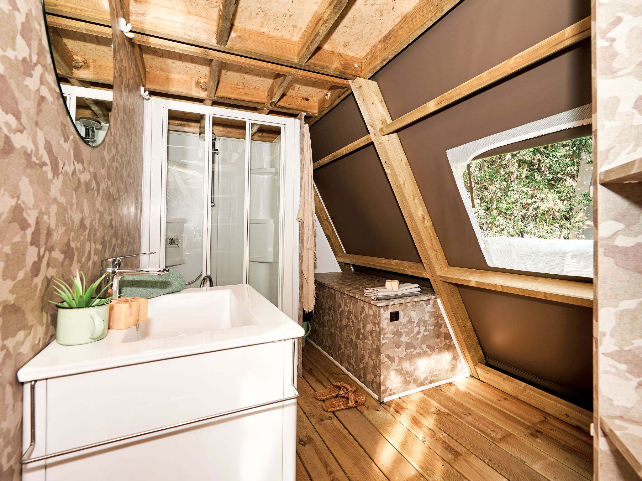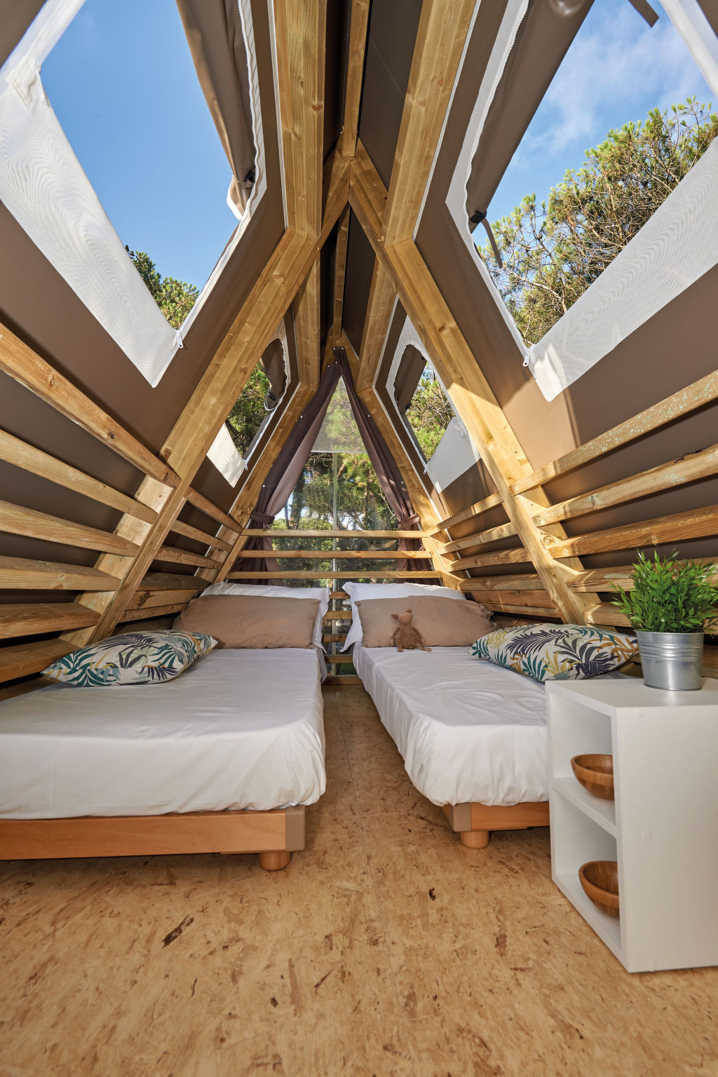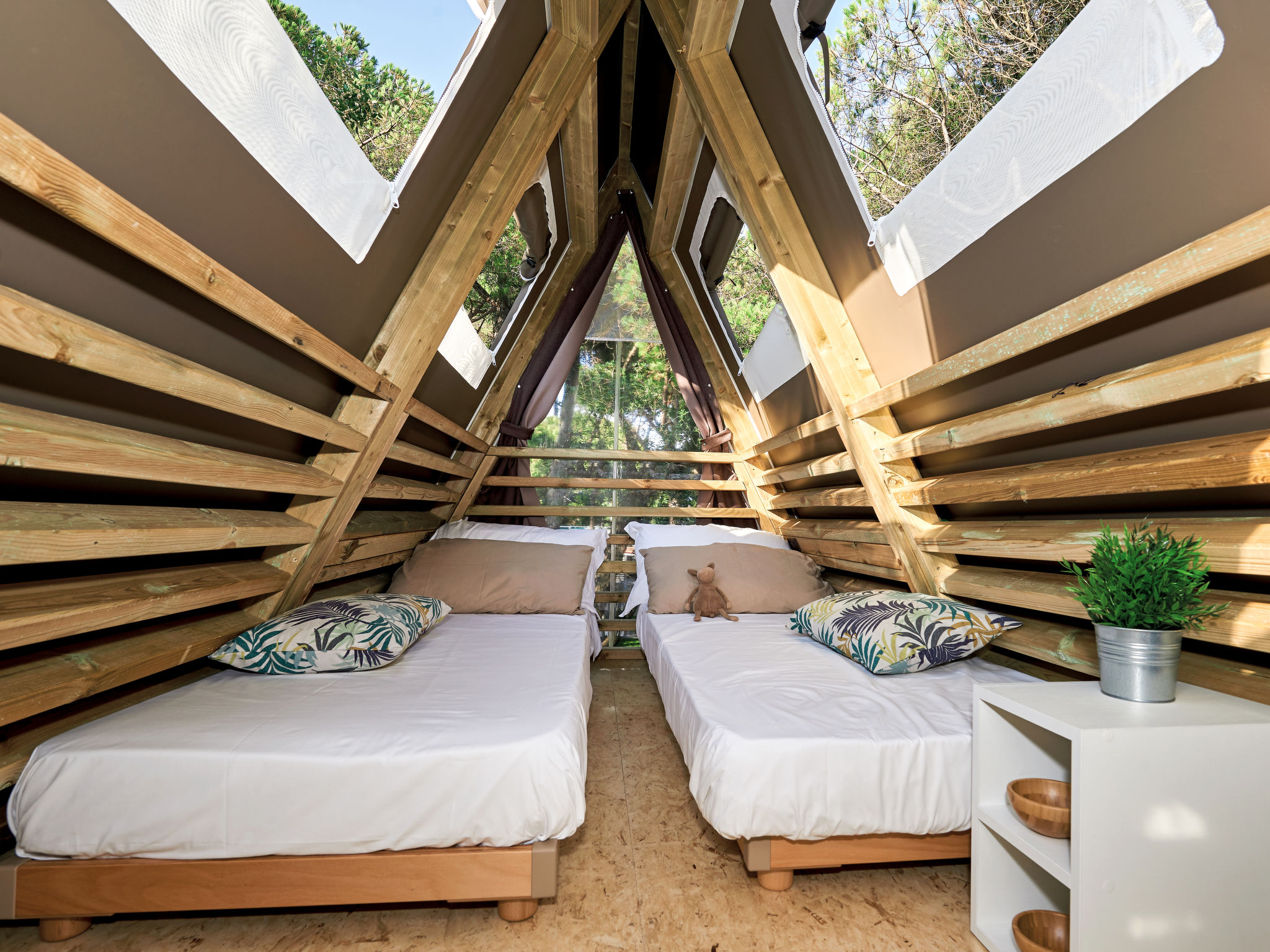 3-Zimmer-Lodge-Zelt, 2 Etagen, ca. 36 m². Zugang über 3 Stufen und Terrasse mit Essplatz. Wohnküche (4 Flammen, Kühlschrank) mit Bettcouch. Schlafzimmer mit franz. Bett. Dusche/WC. Von der Küche Leiter ins Dachgeschoss: Zweibettzimmer (Betten 0,70 m breit, Dachschräge, eingeschränkte Stehhöhe, Raum nicht durch Tür abgeschlossen).