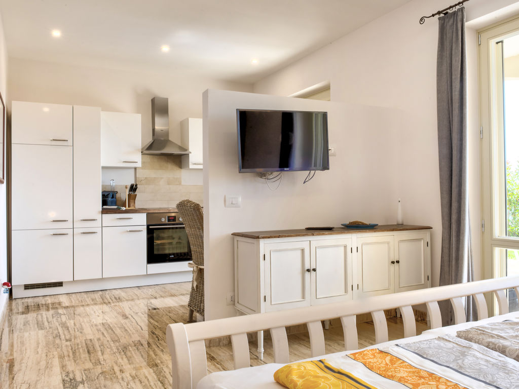 1-Zimmer-Wohnung 40 m2, im Erdgeschoss. Hell, schön und geschmackvoll eingerichtet: Wohn-/Schlafzimmer mit 1 Diwanbett, 1 Doppelbett, Esstisch und Sat-TV. Ausgang zur Terrasse. Kochnische (Backofen, Geschirrspüler, 4 Glaskeramikherd Platten, elektrische Kaffeemaschine). Dusche/Bidet/WC. Heizung, Klimaanlage. Terrasse 15 m2, kleiner Garten. Terrassenmöbel. Herrliche Sicht auf das Meer. Zur Verfügung: Internet (Wireless LAN, gratis). Bitte beachten: Nichtraucher-Unterkunft. 1 kleines Haustier/Hund erlaubt. Eigener Eingang.