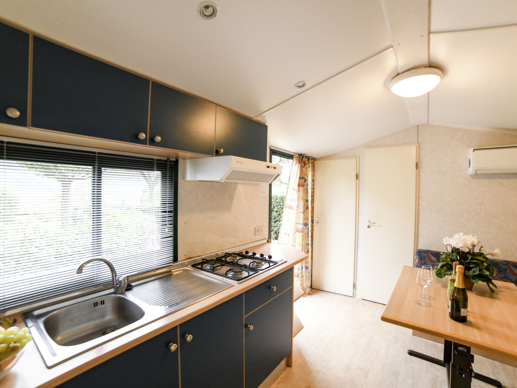 3-Zimmer-Mobilhome, ca. 30 m². Wohnraum mit Bettcouch/Eckbank, Essplatz und Küchenzeile (4 Flammen, Kühlschrank). Schlafzimmer mit franz. Bett (1,60 m breit). Schlafzimmer mit Einzelbett und Etagenbett. Dusche/WC.