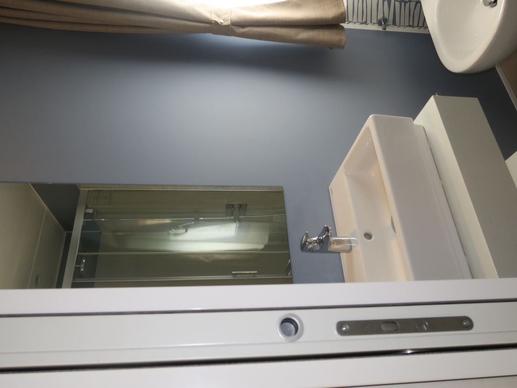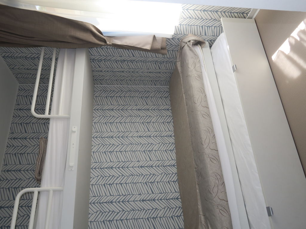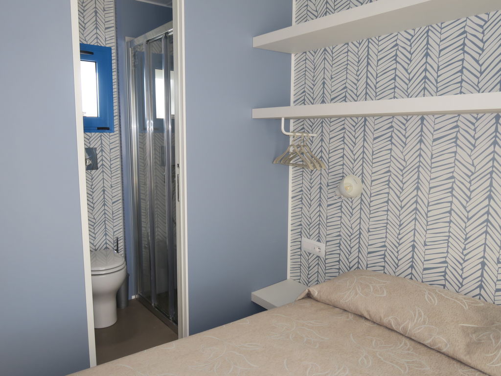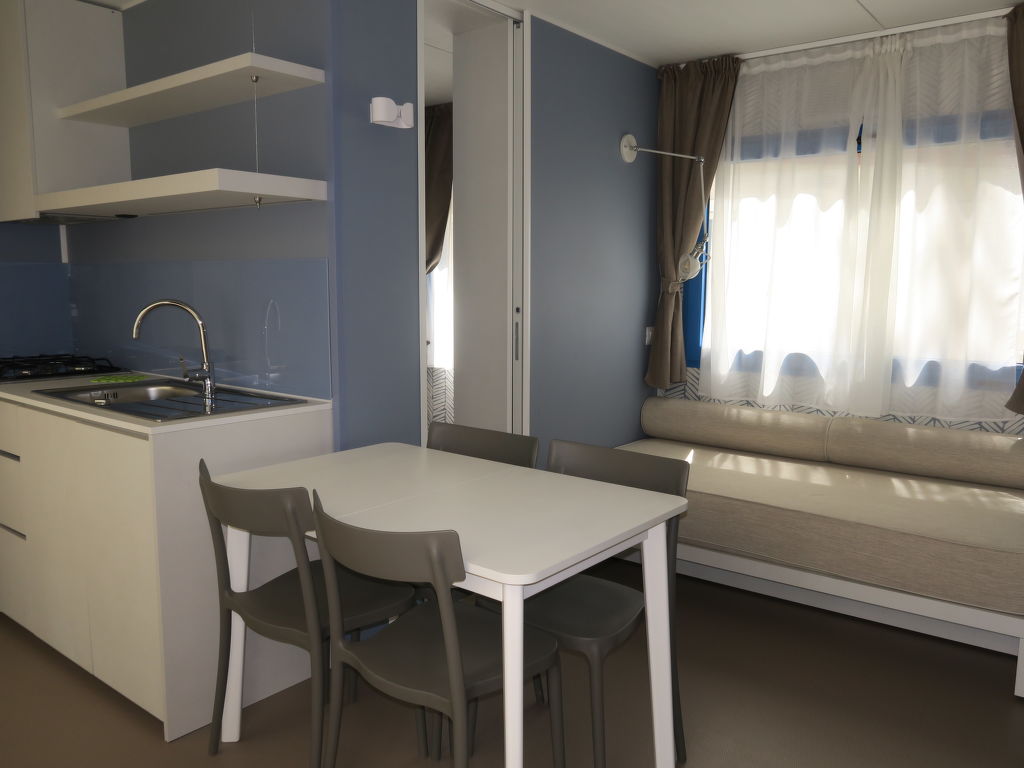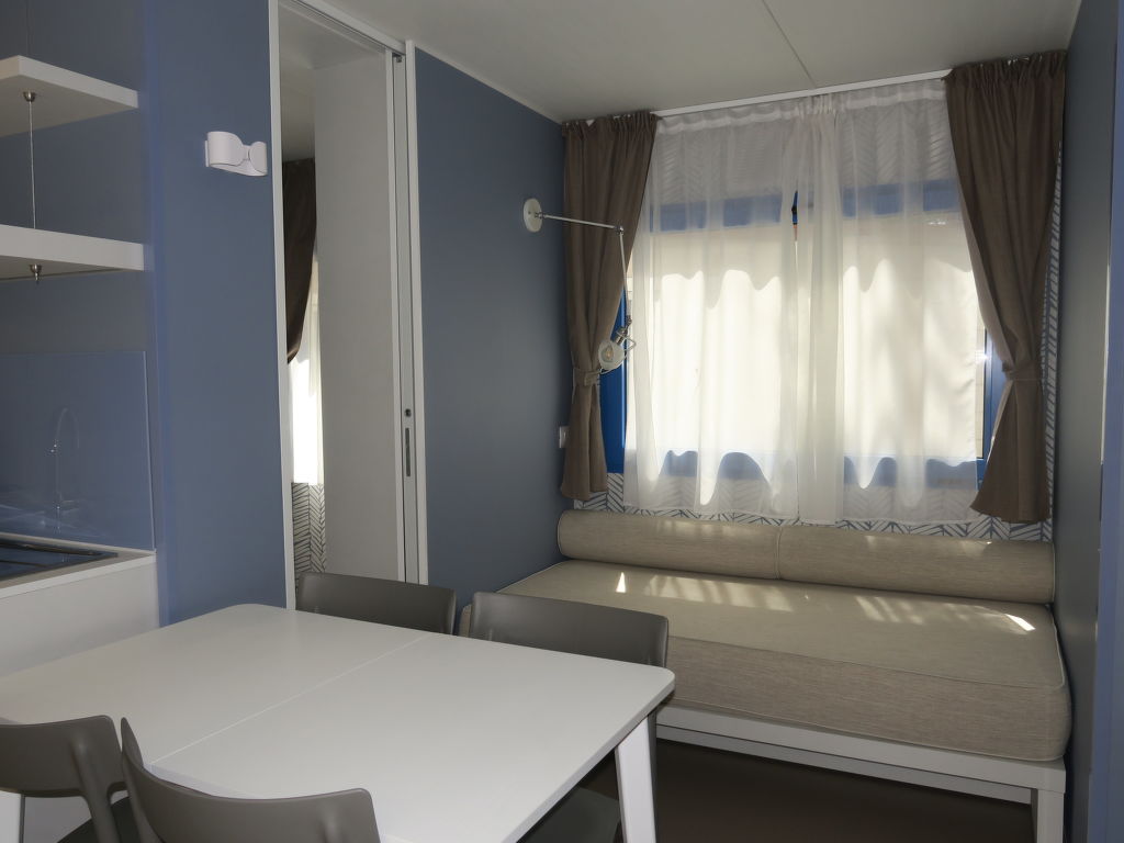 3-Zimmer-Mobilhome, ca. 34 m². Zugang über 3 Stufen und Terrasse. Wohn-/Schlafraum mit Bettcouch, Essplatz und Küchenzeile (4 Flammen, Mikrowelle, Geschirrspüler, Kühl-/Gefrierkombination, Kaffeemaschine). Schlafzimmer mit franz. Bett (1,60 m breit) und Dusche/WC. Schlafzimmer mit Etagenbett (0,75 m breit) und Ausziehbett (0,70 m breit). Dusche/WC. Maximale Belegung: 5 Personen. Flexibilität bei der Bettenaufteilung: Es stehen mehr Schlafmöglichkeiten zur Verfügung als die maximal zugelassene Personenzahl, diese darf dennoch nicht überschritten werden.
