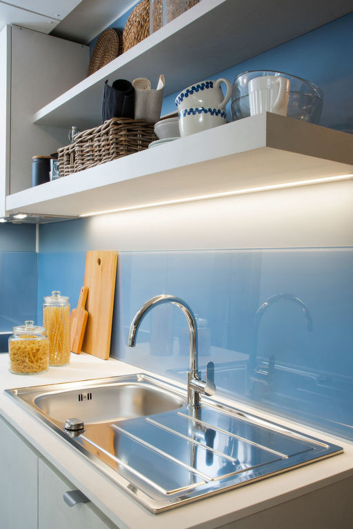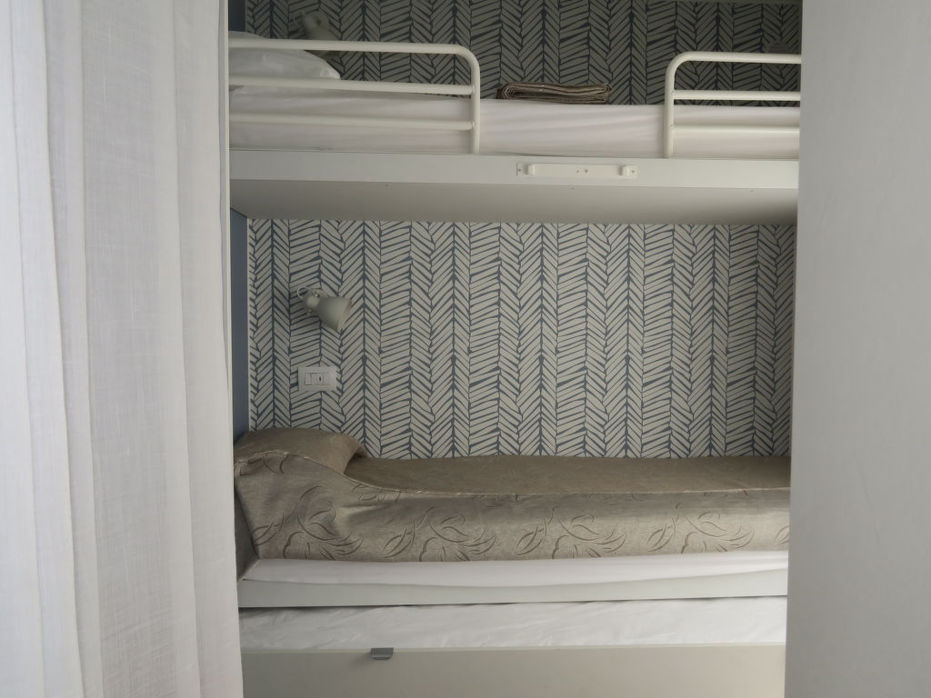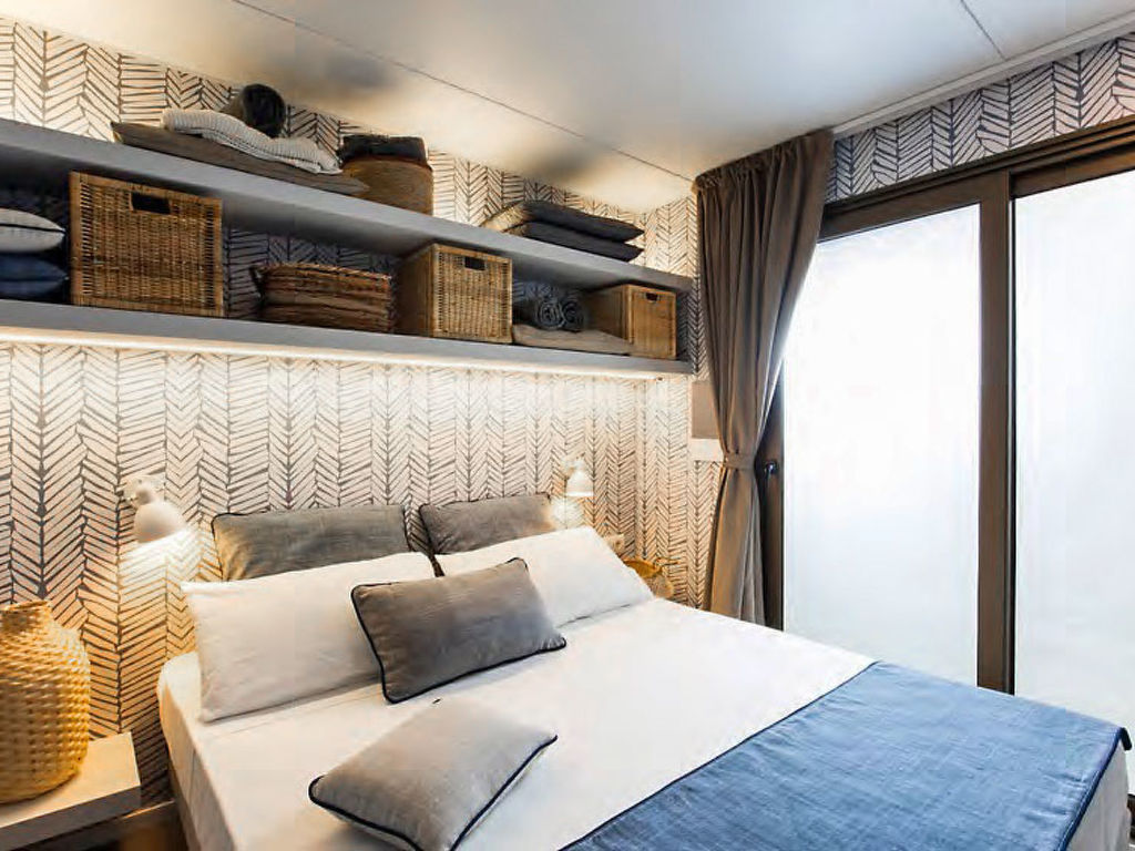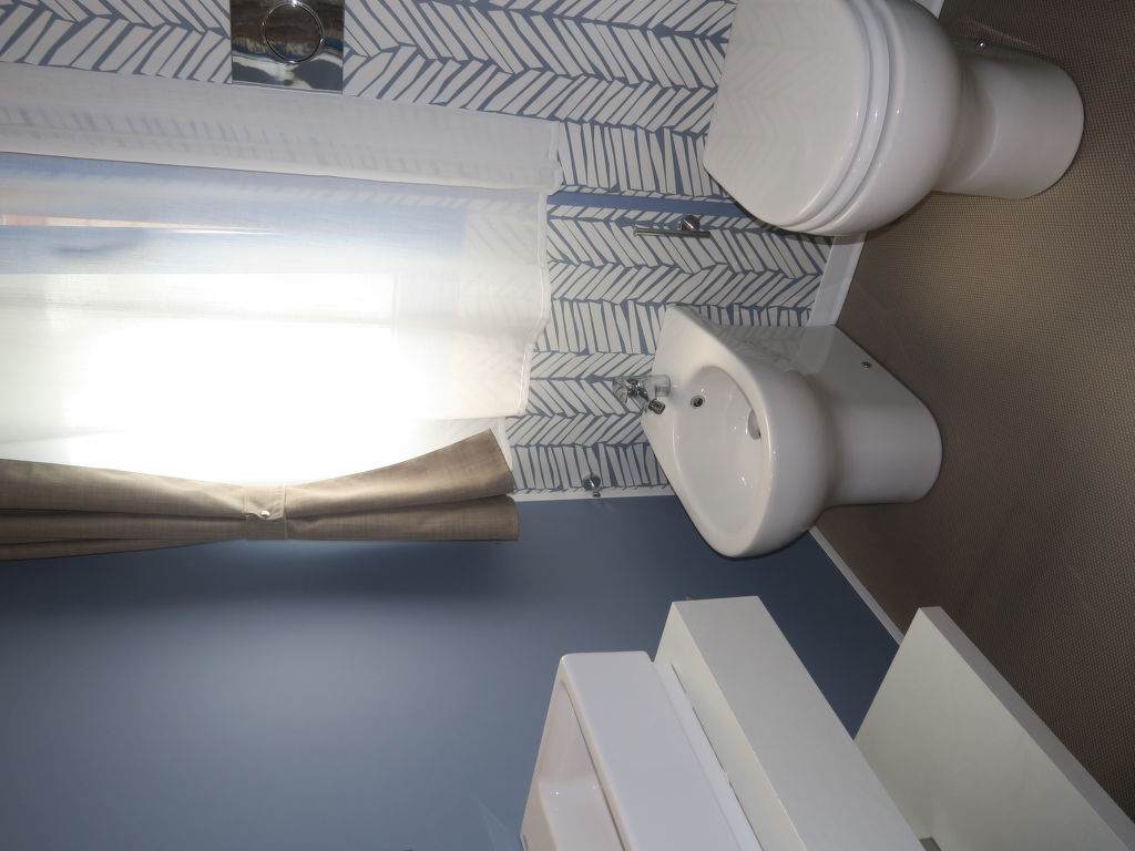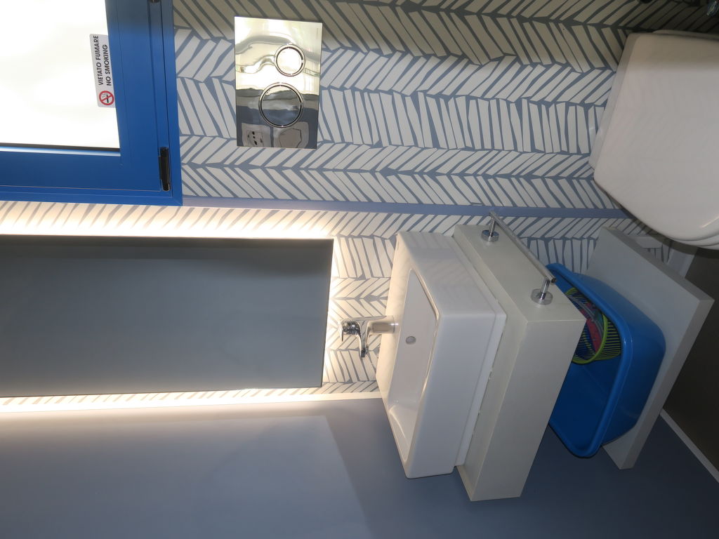 3-Zimmer-Mobilhome, ca. 34 m². Zugang über 3 Stufen und Terrasse. Wohn-/Schlafraum mit Bettcouch, Essplatz und Küchenzeile (4 Flammen, Mikrowelle, Geschirrspüler, Kühl-/Gefrierkombination, Kaffeemaschine). Schlafzimmer mit franz. Bett (1,60 m breit) und Dusche/WC. Schlafzimmer mit Etagenbett (0,75 m breit) und Ausziehbett (0,70 m breit). Dusche/WC. Maximale Belegung: 5 Personen. Flexibilität bei der Bettenaufteilung: Es stehen mehr Schlafmöglichkeiten zur Verfügung als die maximal zugelassene Personenzahl, diese darf dennoch nicht überschritten werden.