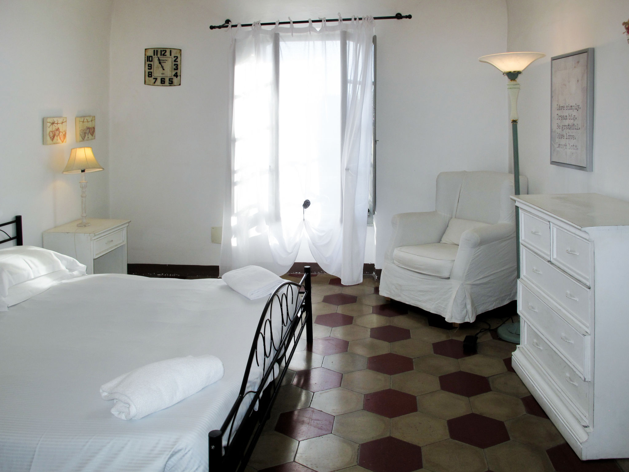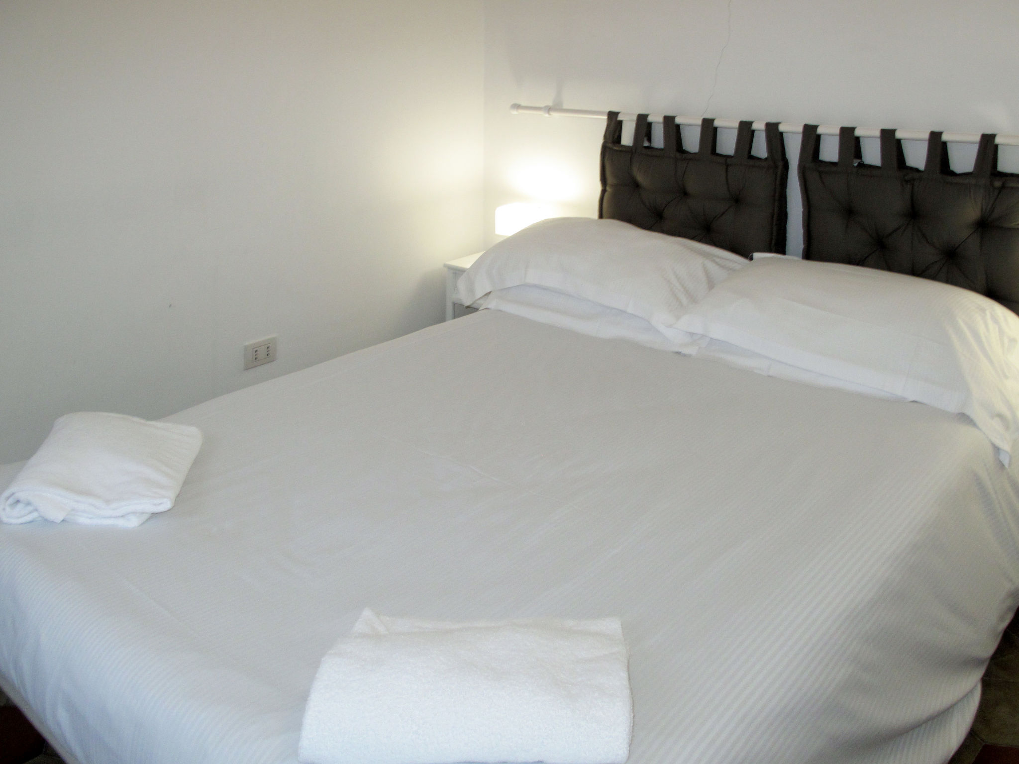 2,5-Zimmer-Wohnung 'Ginevra', 3. Etage, ca. 85 m². Wohndiele mit Doppelbettcouch (1,60 m breit). Küche (4 Ceranfelder, Backofen, Geschirrspüler, Kühl-/Gefrierkombination, Kaffeemaschine, Wasserkocher, Toaster) mit Essplatz. Schlafzimmer mit franz. Bett (1,60 m breit), Ausziehbett (0,80 m breit) und Terrassenausgang. Schlafzimmer mit franz. Bett. Dusche/Doppelwaschbecken/Bidet/WC. CITR: 009029-CAV-0015