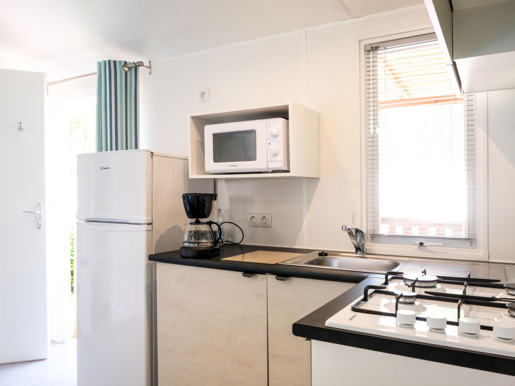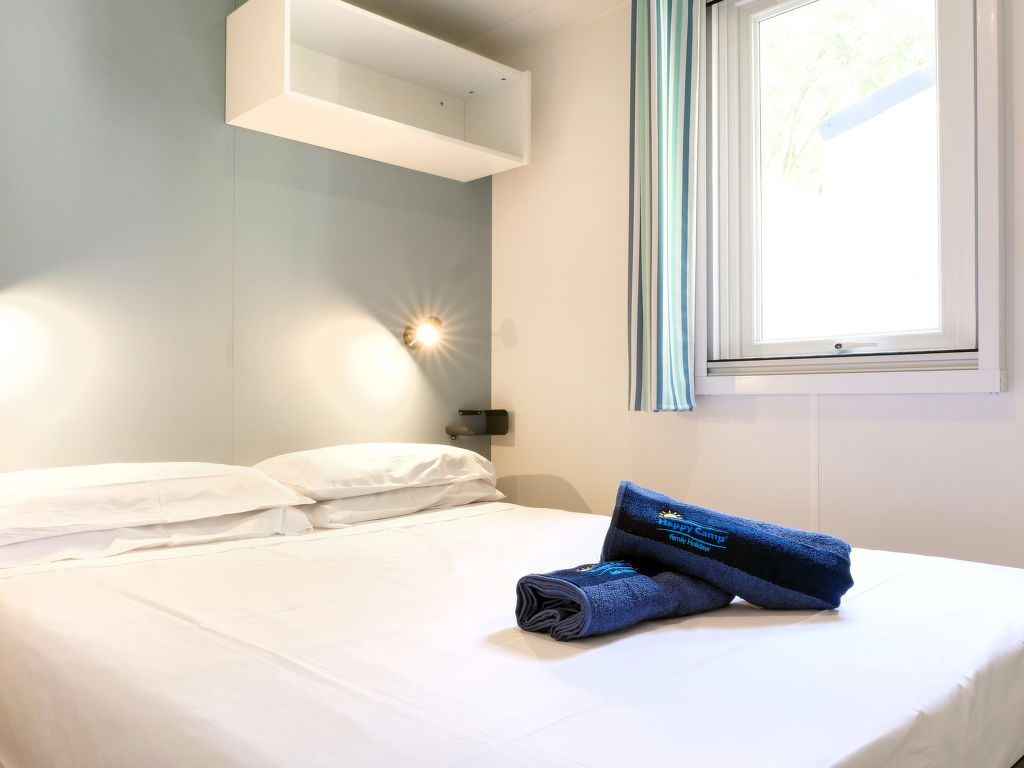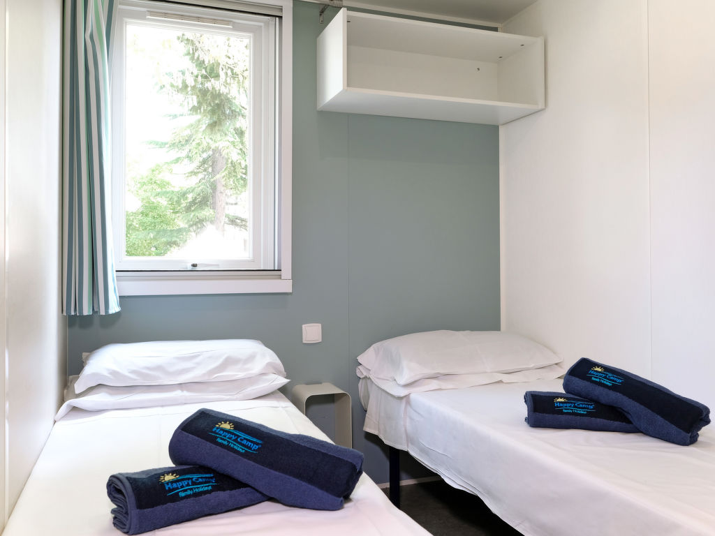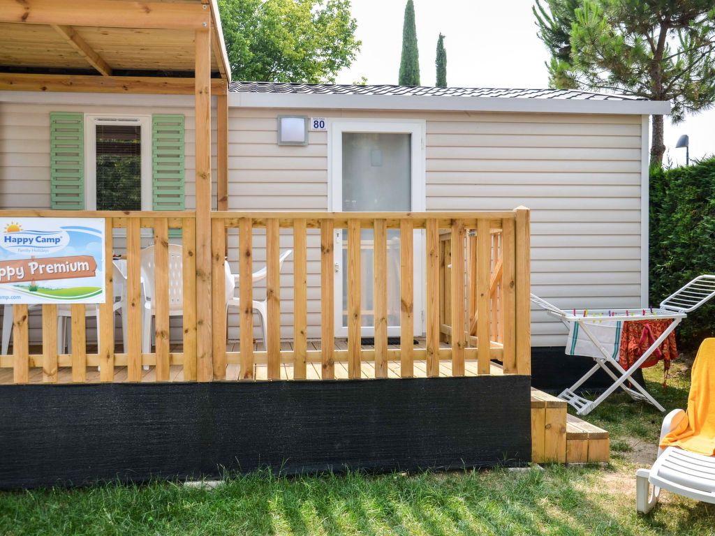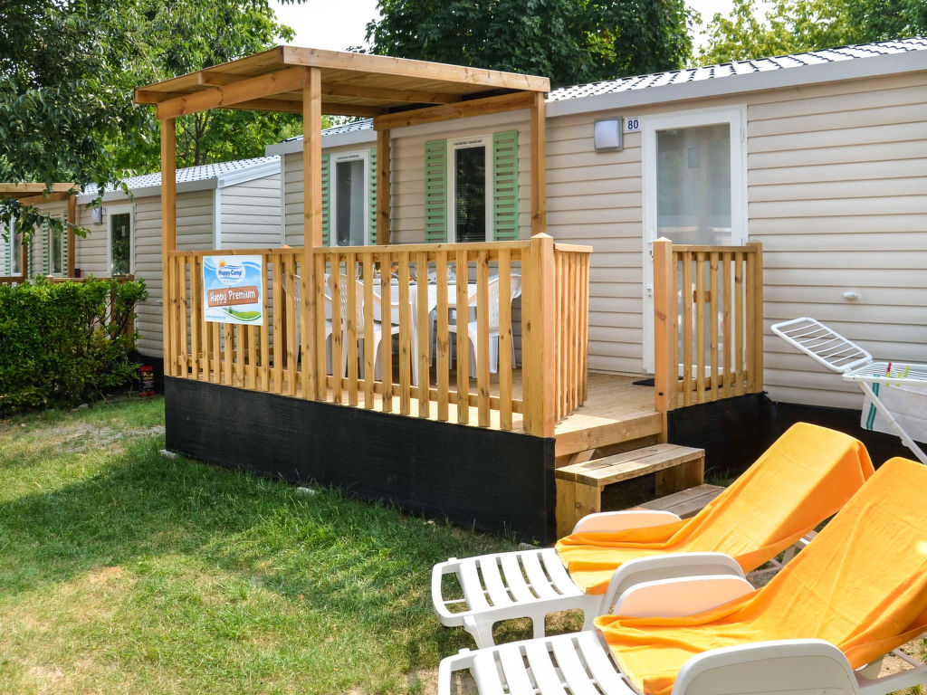 "Happy Premium", 4-Zimmer-Mobilheim 30 m2. Komfortabel eingerichtet: Wohn-/Schlafzimmer mit 1 Diwanbett, Esstisch, E-Heizung und Klimaanlage. 1 Zimmer mit 1 franz. Bett (140 cm). 2 Zimmer, jedes Zimmer mit 2 Betten (70 cm). Offene Küche (4 Kochplatten, Mikrowelle, Tiefkühler, elektrische Kaffeemaschine). Dusche/WC. Terrasse teilweise überdacht. Terrassenmöbel, Elektrogrill (mobil), Liegestühle (2). Zur Verfügung: Fliegengitter. Bitte beachten: Nichtraucher-Unterkunft. Maximal 1 kleines Haustier/Hund erlaubt.