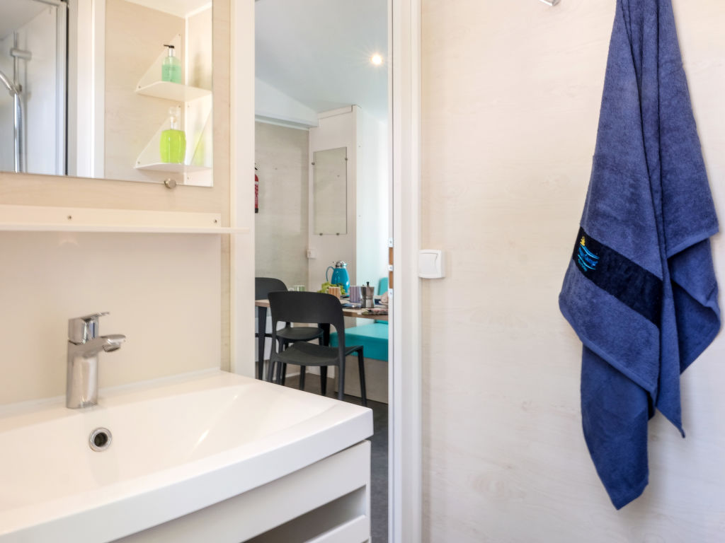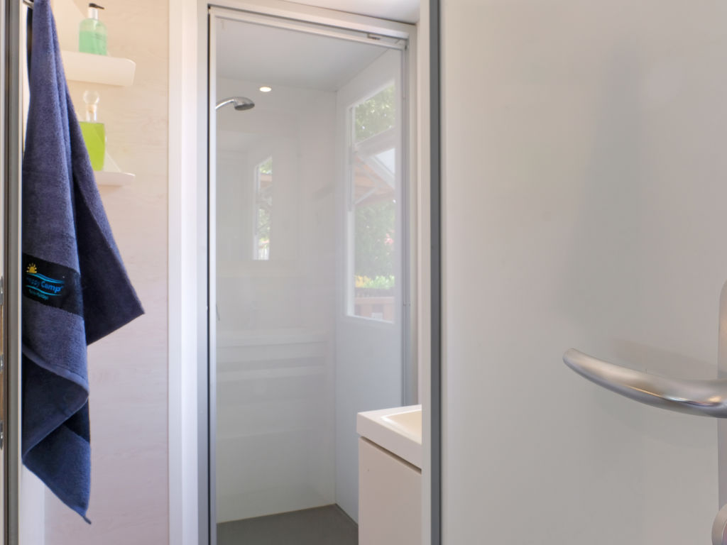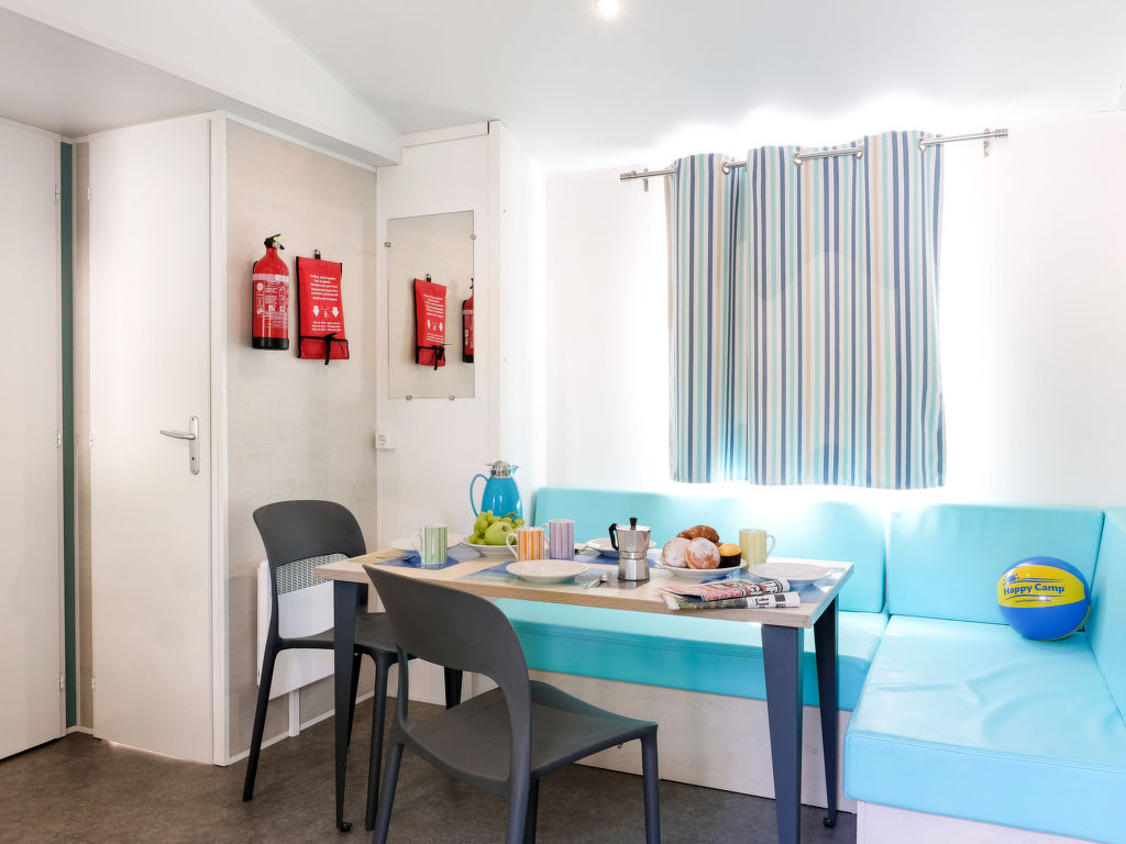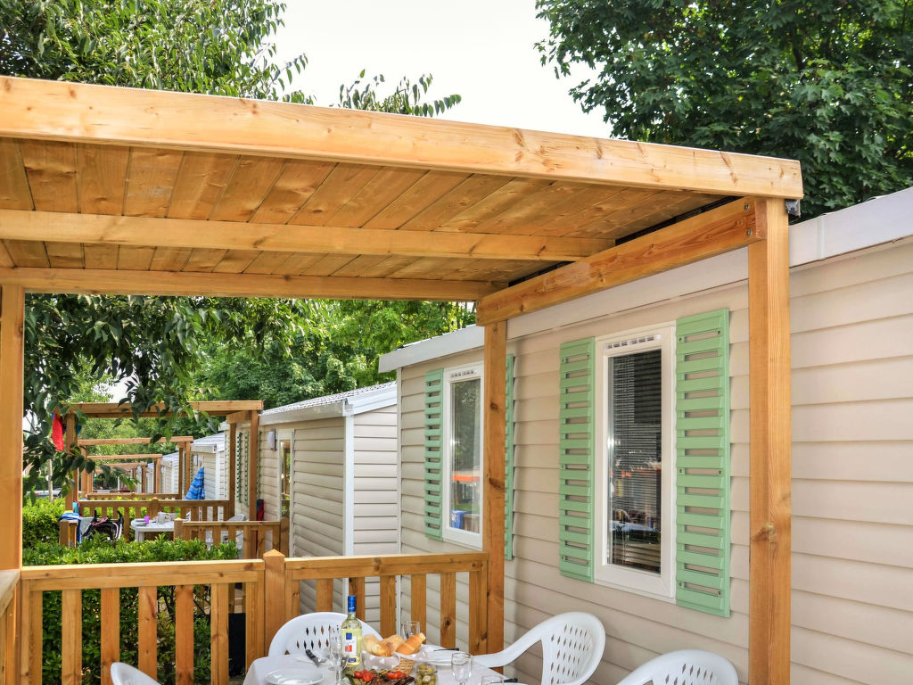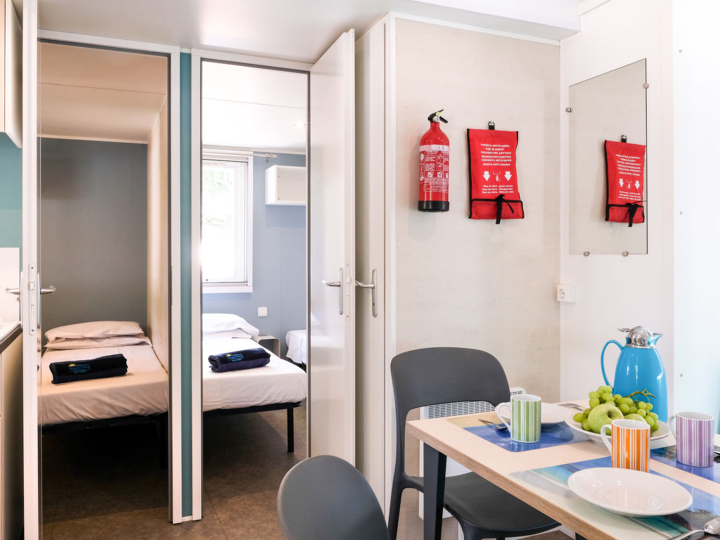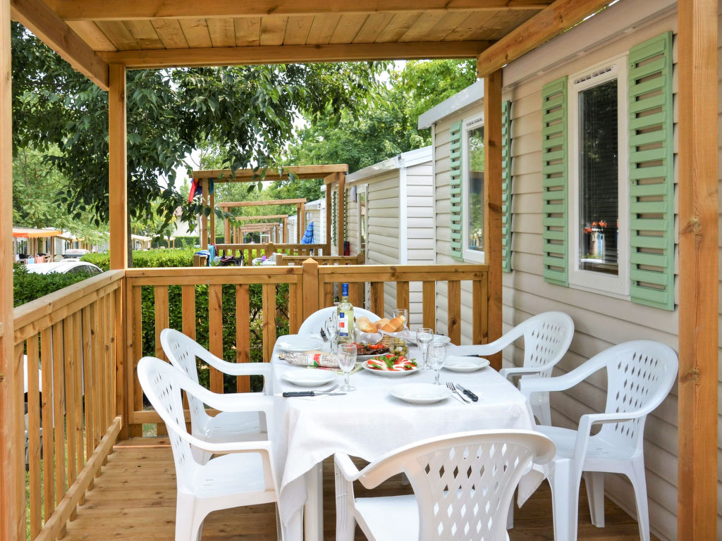 "Happy Premium", 4-Zimmer-Mobilheim 30 m2. Komfortabel eingerichtet: Wohn-/Schlafzimmer mit 1 Diwanbett, Esstisch, E-Heizung und Klimaanlage. 1 Zimmer mit 1 franz. Bett (140 cm). 2 Zimmer, jedes Zimmer mit 2 Betten (70 cm). Offene Küche (4 Kochplatten, Mikrowelle, Tiefkühler, elektrische Kaffeemaschine). Dusche/WC. Terrasse teilweise überdacht. Terrassenmöbel, Elektrogrill (mobil), Liegestühle (2). Zur Verfügung: Fliegengitter. Bitte beachten: Nichtraucher-Unterkunft. Maximal 1 kleines Haustier/Hund erlaubt.