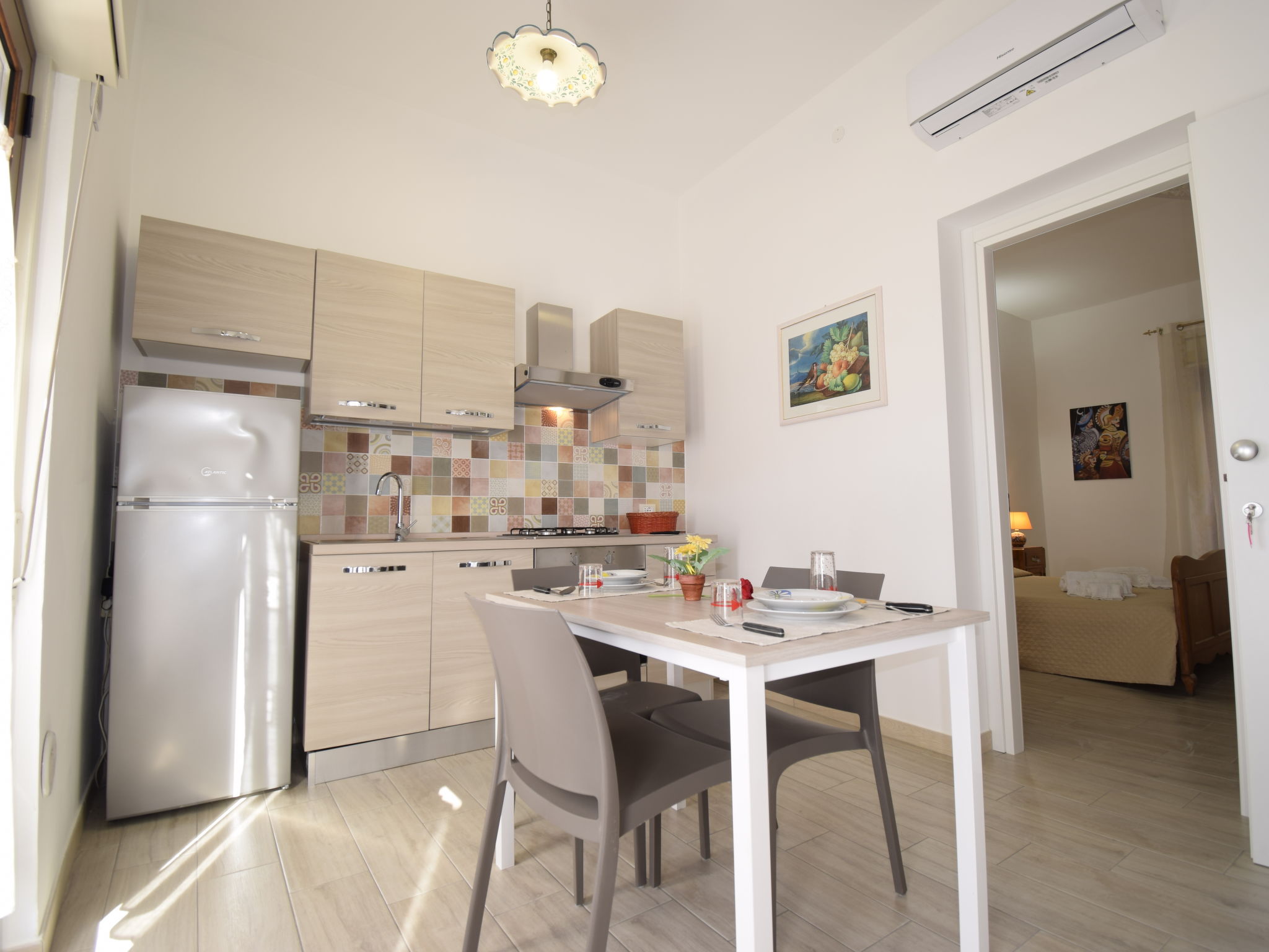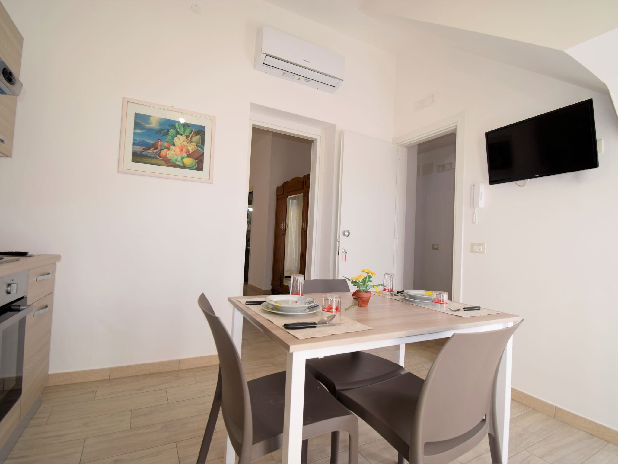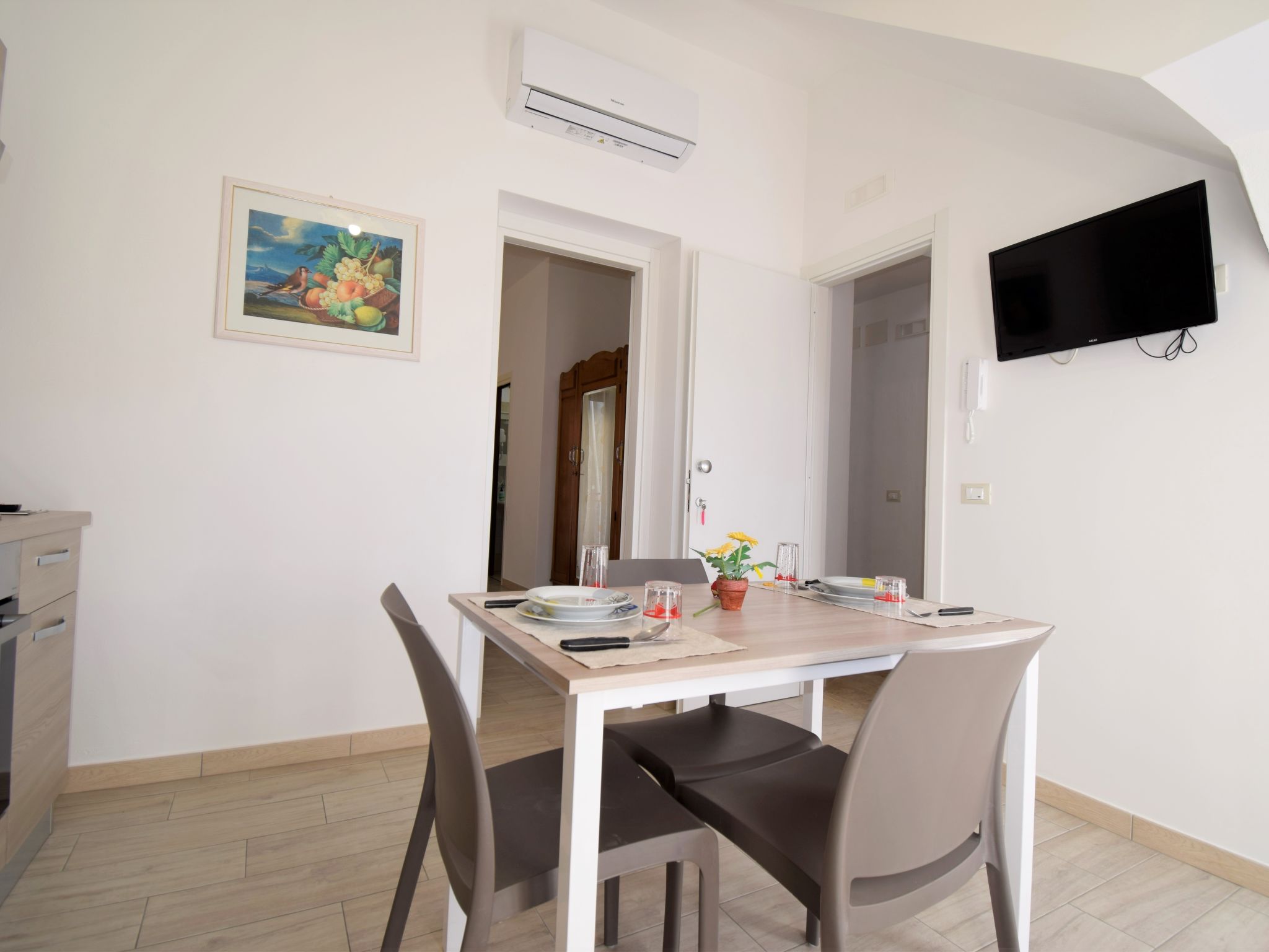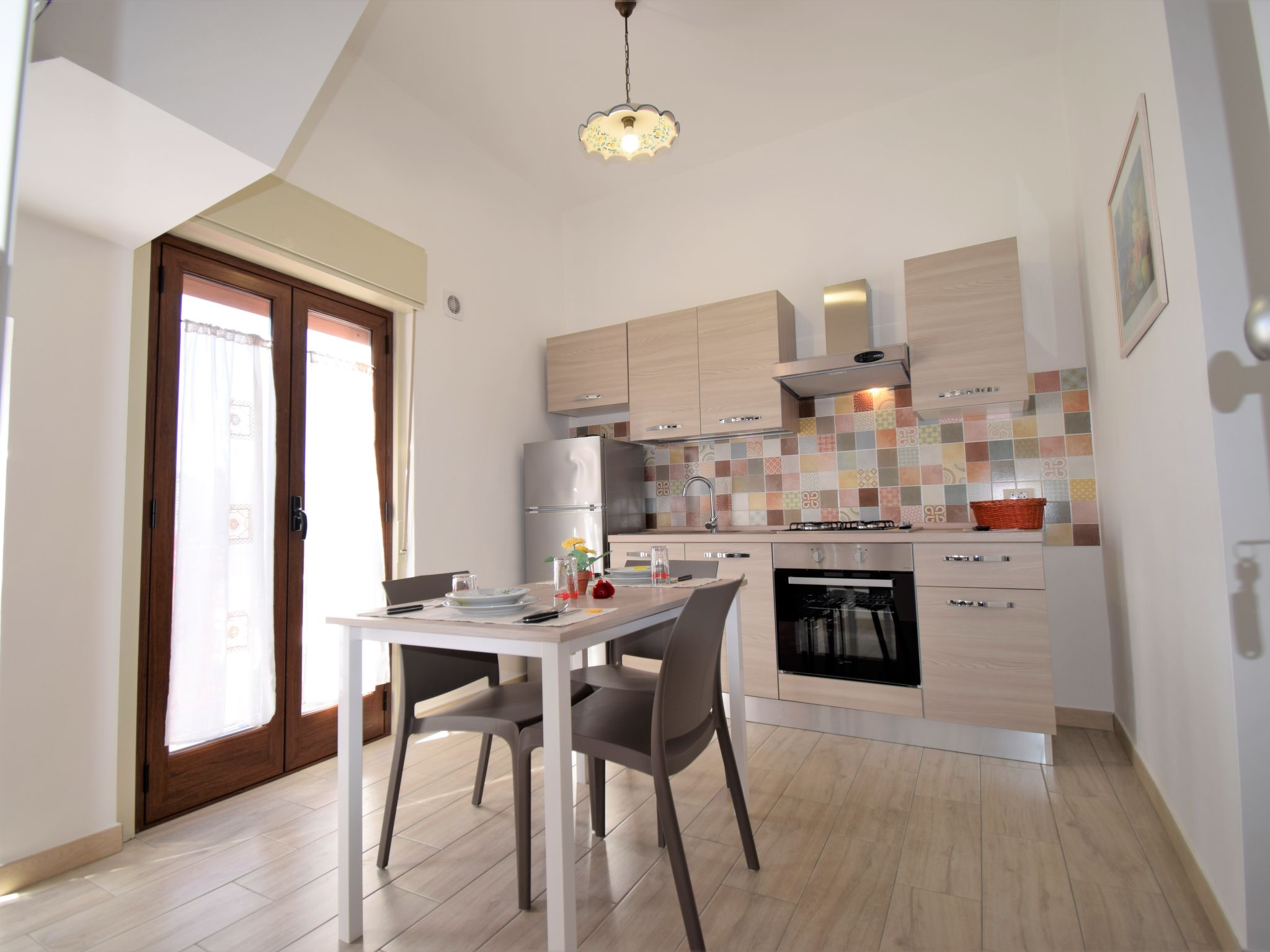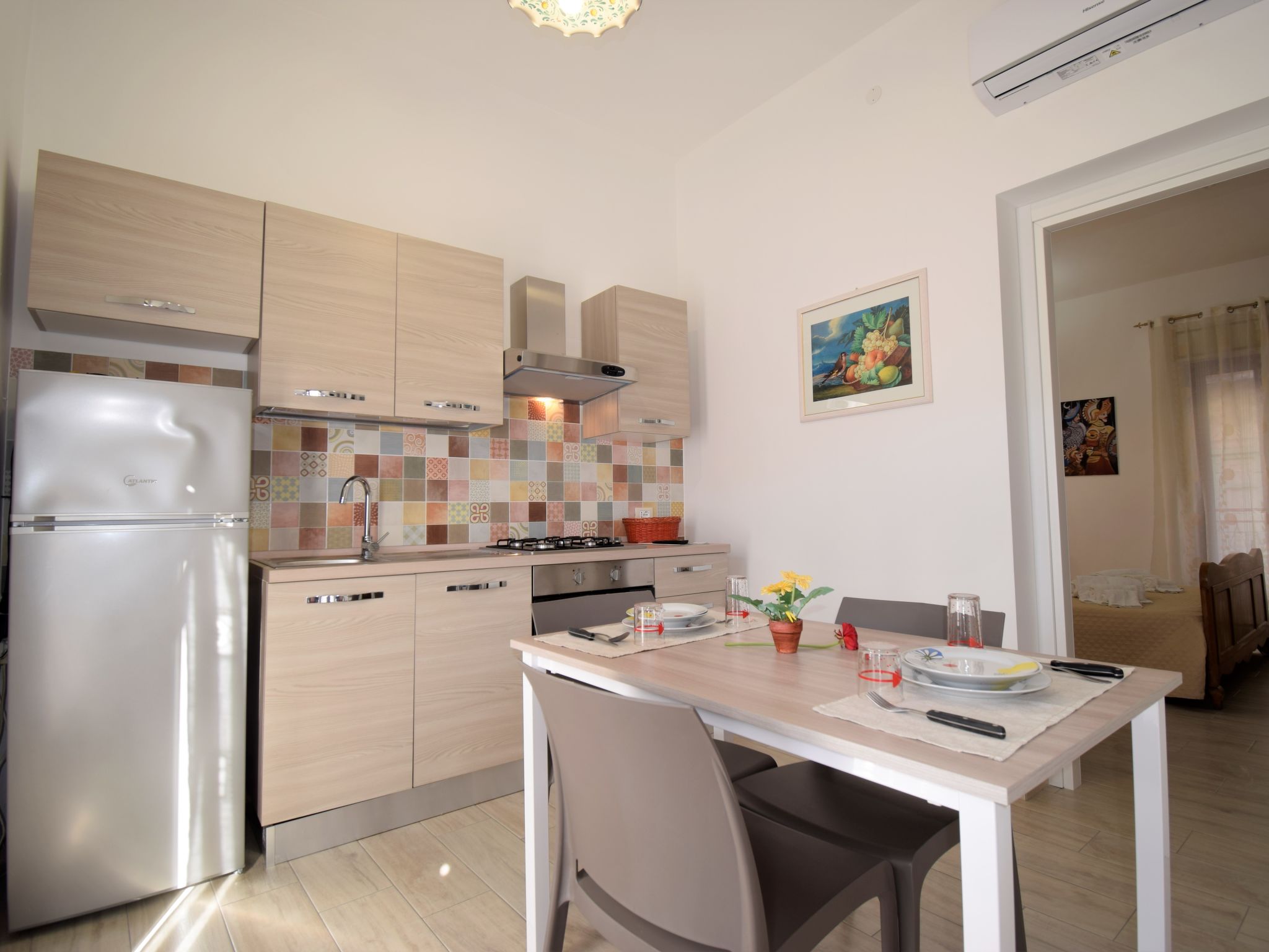 "Ginestra", 2-Zimmer-Wohnung 60 m2 auf 2 Stockwerken. Zweckmässig und komfortabel eingerichtet: 1 Doppelzimmer mit Dusche/Bidet/WC, Klimaanlage und Warmluftheizung. Küche (4 Kochplatten, Backofen, Tiefkühler) mit Esstisch, Sat-TV (Flachbildschirm), Klimaanlage und Warmluftheizung. Ausgang zum Balkon. Unteres Geschoss: 1 Doppelzimmer mit Dusche/Bidet/WC, Klimaanlage und Warmluftheizung. Ausgang zum Balkon. Küche (4 Kochplatten, Backofen, Tiefkühler) mit Esstisch, Sat-TV (Flachbildschirm), Klimaanlage und Warmluftheizung. Ausgang zum Balkon. 3 kleine Balkone 3 m2. Zur Verfügung: Waschmaschine, Bügeleisen, Haartrockner. Internet (Wireless LAN, gratis).