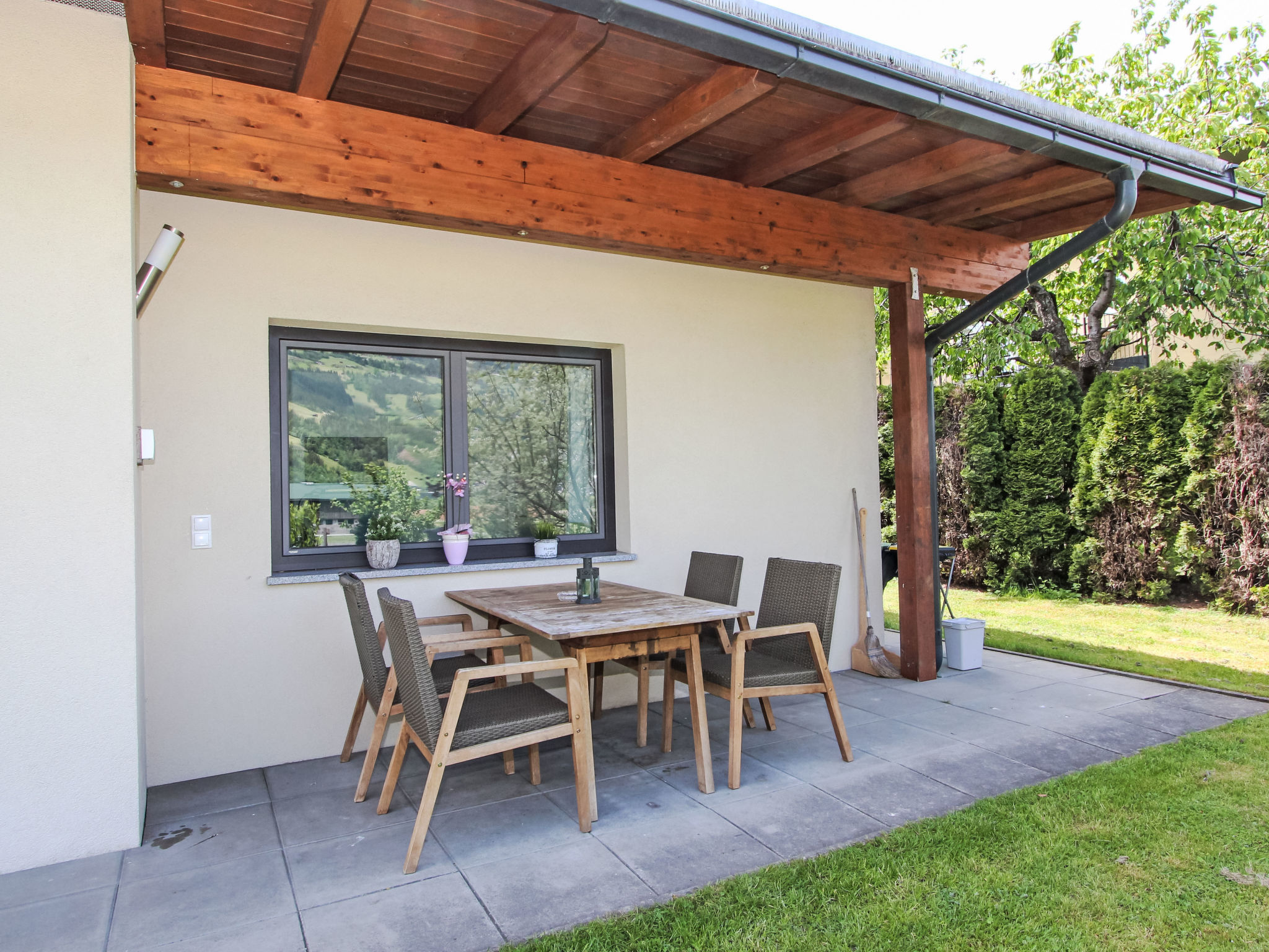 2-Zimmer-Wohnung 44 m2, im Erdgeschoss. Hell, gemütlich eingerichtet: Eingang. 1 Zimmer mit 1 Doppelbett und 1 Schlafmöglichkeit. Wohn-/Schlafzimmer mit 1 Doppeldiwanbett (180 cm, Länge 200 cm), Essecke und Sat-TV (Flachbildschirm), DVD. Offene Küche (Backofen, Geschirrspüler, 4 Glaskeramikherd Platten, Mikrowelle, elektrische Kaffeemaschine). Dusche, sep. WC. Fussbodenheizung. Terrasse, Gartensitzplatz, Garten. Terrassenmöbel, Liegestühle. Herrliche Sicht auf die Berge. Zur Verfügung: Internet (Wireless LAN, gratis). Bitte beachten: geeignet für Familien. Nichtraucher-Unterkunft. Eigener Eingang. Die Ferienwohnung ist barrierefrei und separat an das Privathaus angebaut und bietet mit den eigenen Bereichen über viel Privatsphäre. Ein schöner Garten mit freier Sicht steht Ihnen zur Alleinbenützung zur Verfügung.