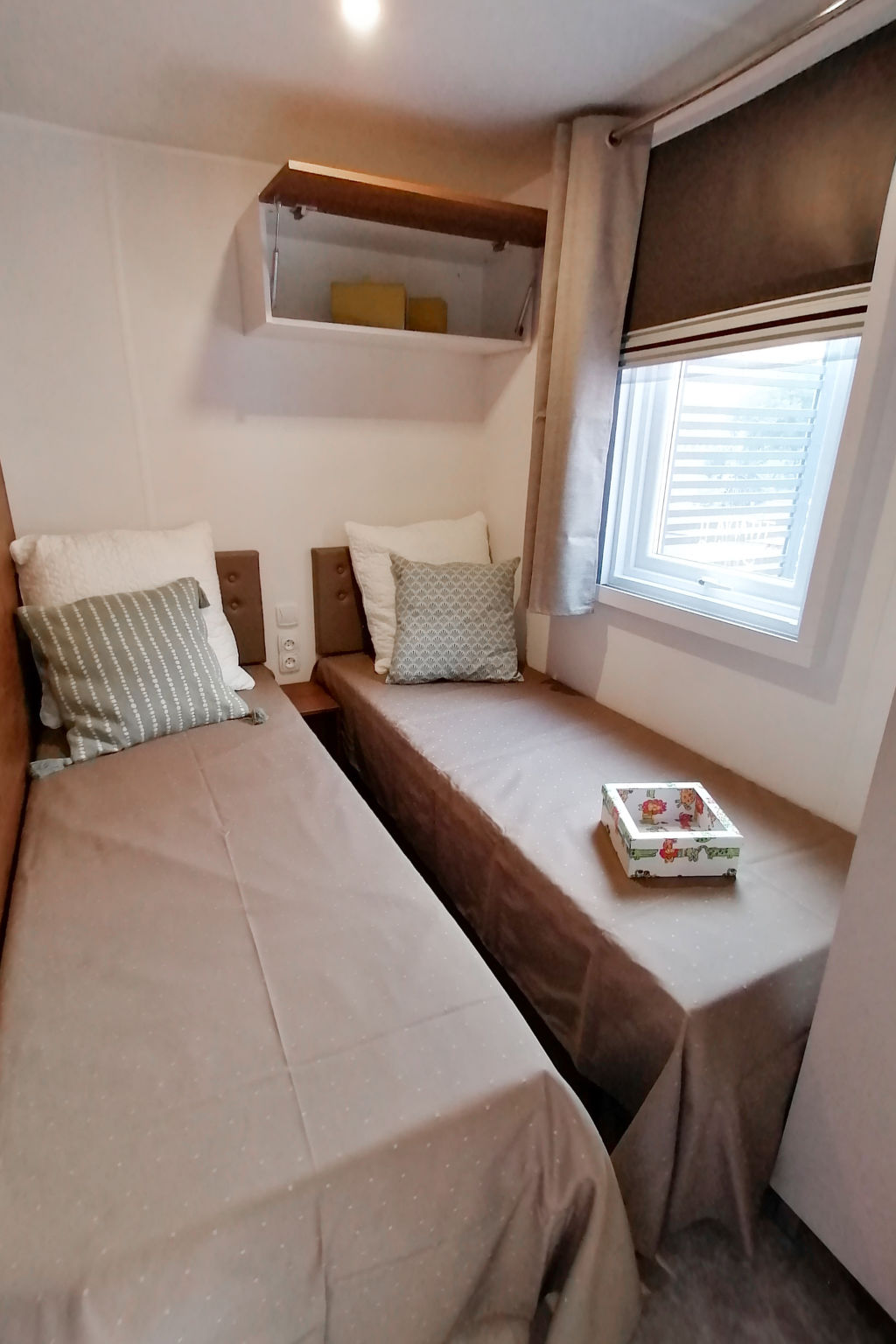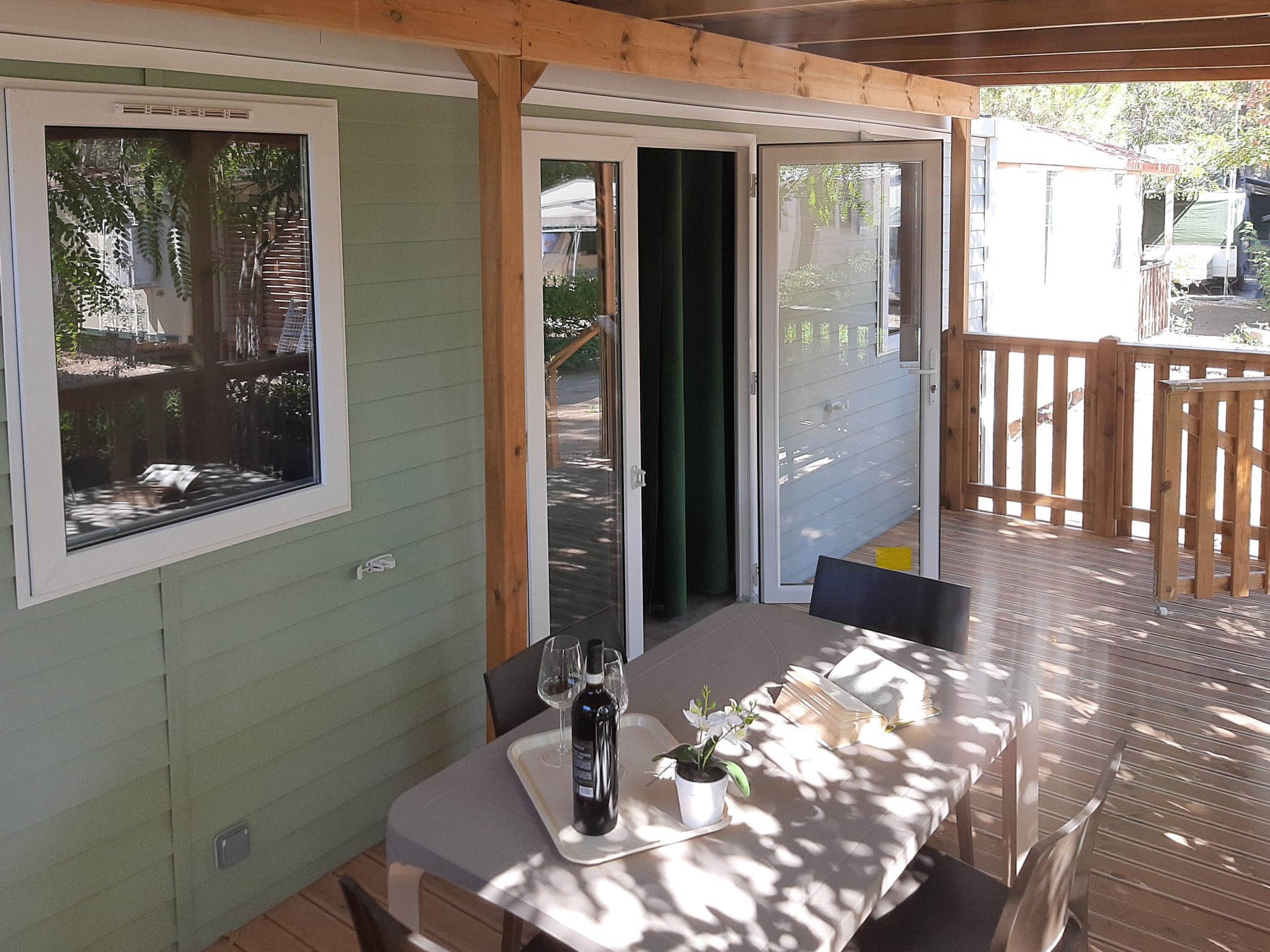 "Levante Deluxe", 3-Zimmer-Mobilheim 23 m2. Zweckmässig eingerichtet: Wohn-/Esszimmer mit 1 Diwanbett (75 cm, Länge 166 cm), Esstisch. Ausgang zur Terrasse. 1 Zimmer mit 1 franz. Bett (140 cm). 1 Zimmer mit 2 Betten (70 cm, Länge 185 cm). Offene Küche (4 Flammen, Mikrowelle, Tiefkühler). Dusche/Bidet/WC. Heizung, Klimaanlage. Terrasse 15 m2. Terrassenmöbel. Zur Verfügung: Fliegengitter, Kinderhochstuhl, Babybett. Beim Mietobjekt handelt es sich um ein Typenhaus bzw. Um eine Typenwohnung.