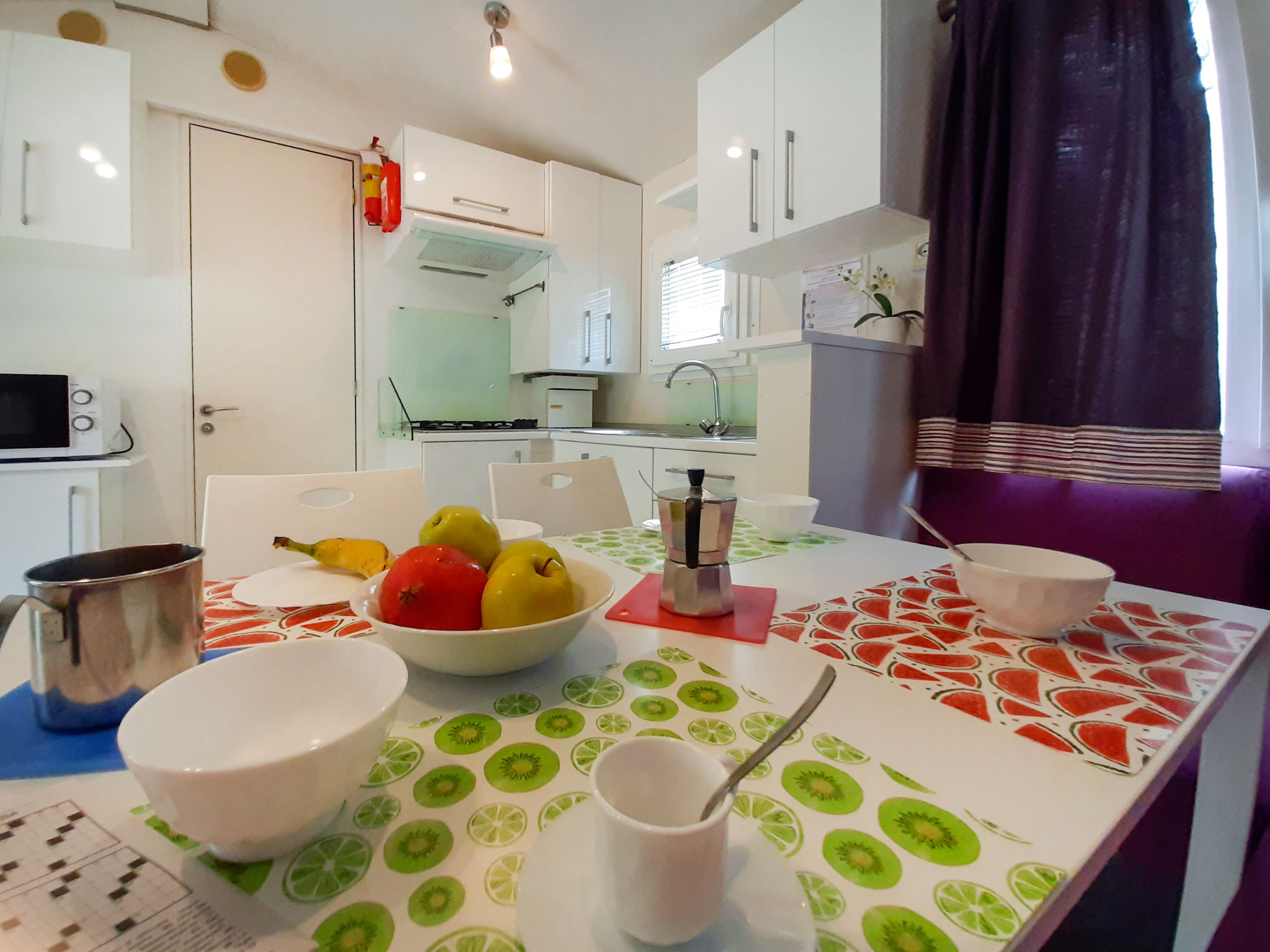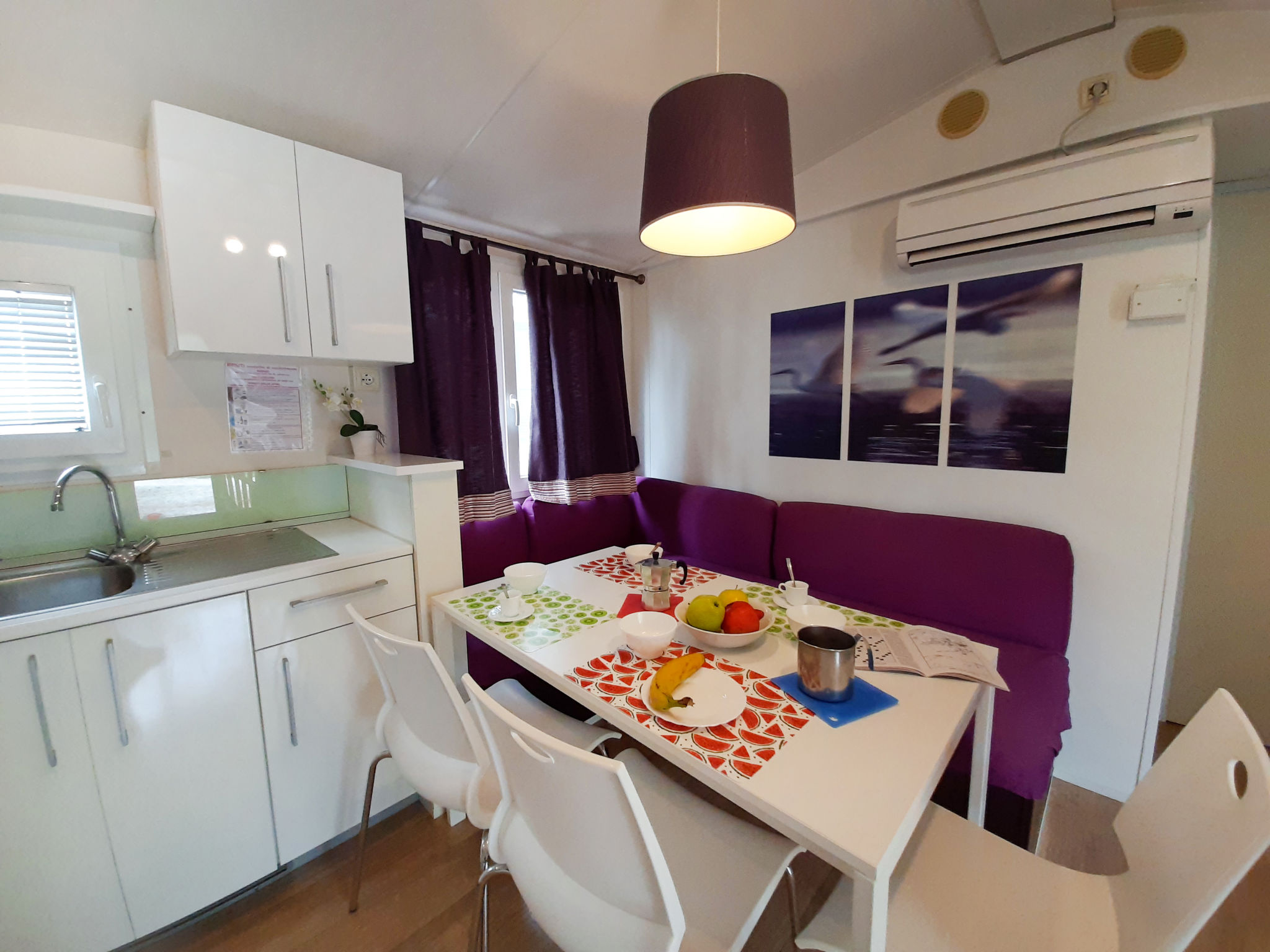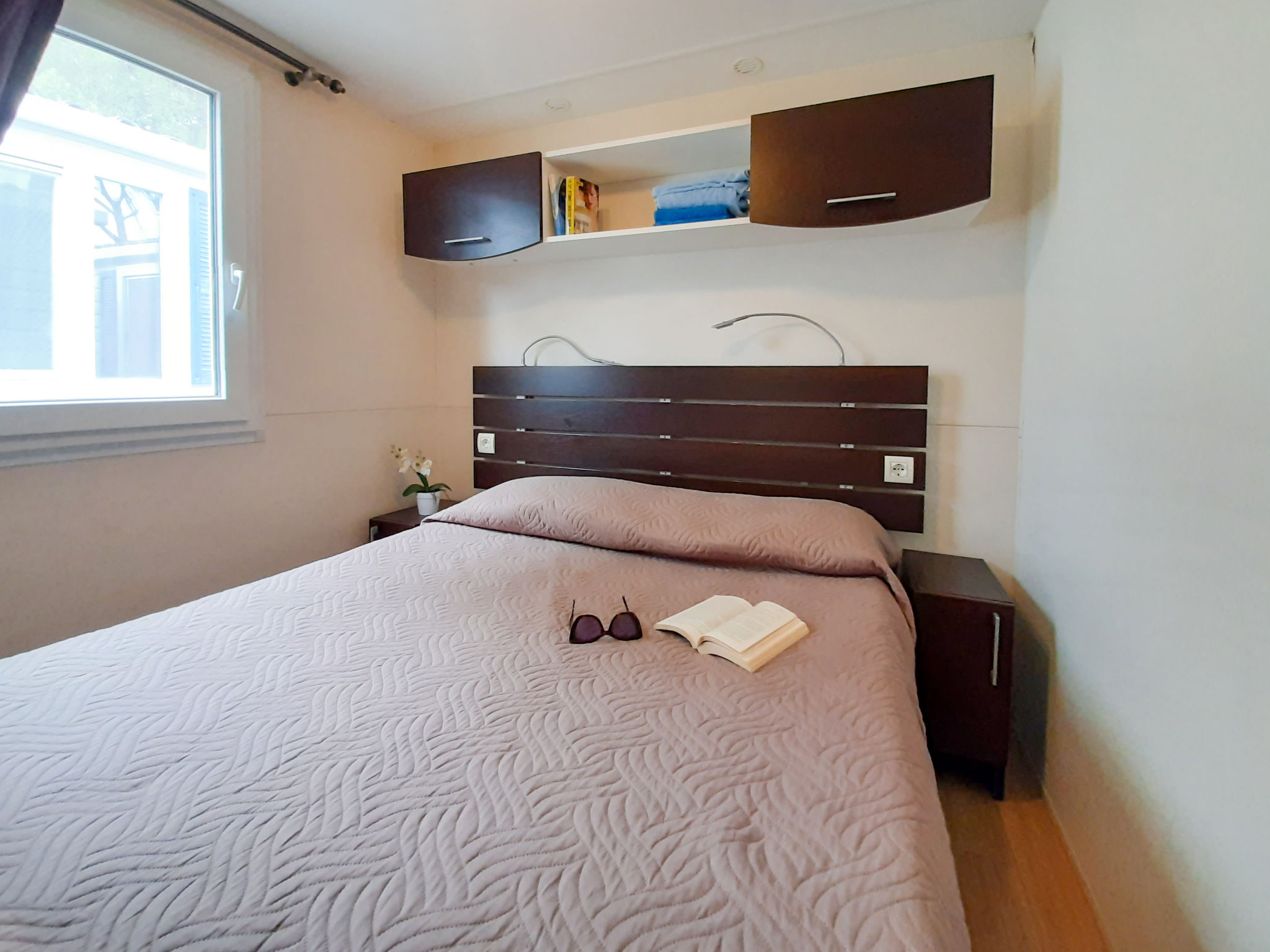 "Ostro", 4-Zimmer-Mobilheim 30 m2. Zweckmässig eingerichtet: Wohn-/Esszimmer mit Esstisch. Ausgang zur Terrasse. 1 Zimmer mit 1 franz. Bett (140 cm). 2 Zimmer, jedes Zimmer mit 2 Betten (70 cm, Länge 185 cm). Offene Küche (4 Flammen, Mikrowelle, Tiefkühler). Dusche/WC, sep. WC. Heizung, Klimaanlage. Terrasse 15 m2. Terrassenmöbel. Zur Verfügung: Fliegengitter, Kinderhochstuhl. Beim Mietobjekt handelt es sich um ein Typenhaus bzw. Um eine Typenwohnung.