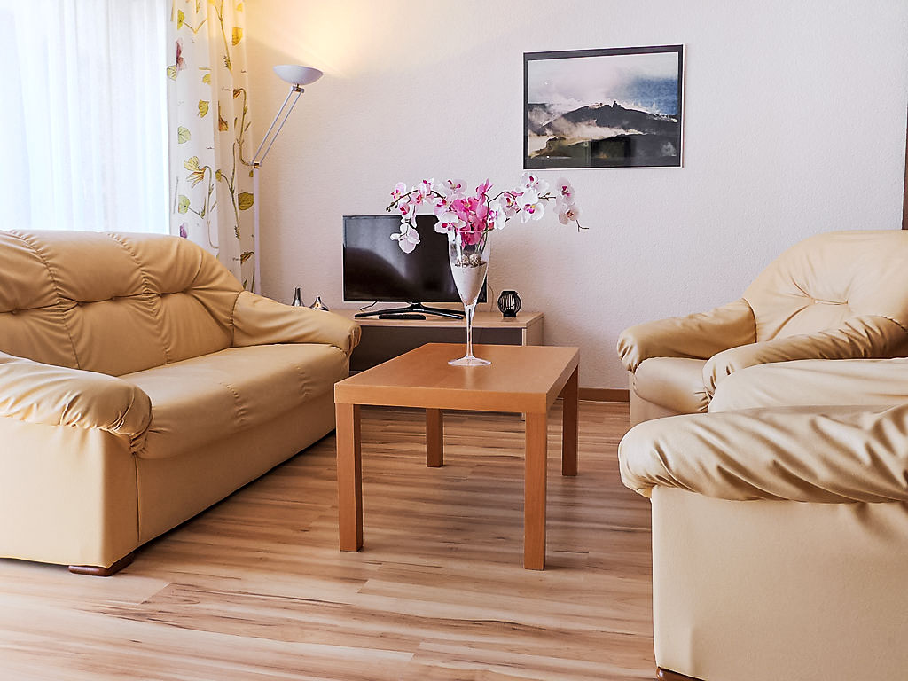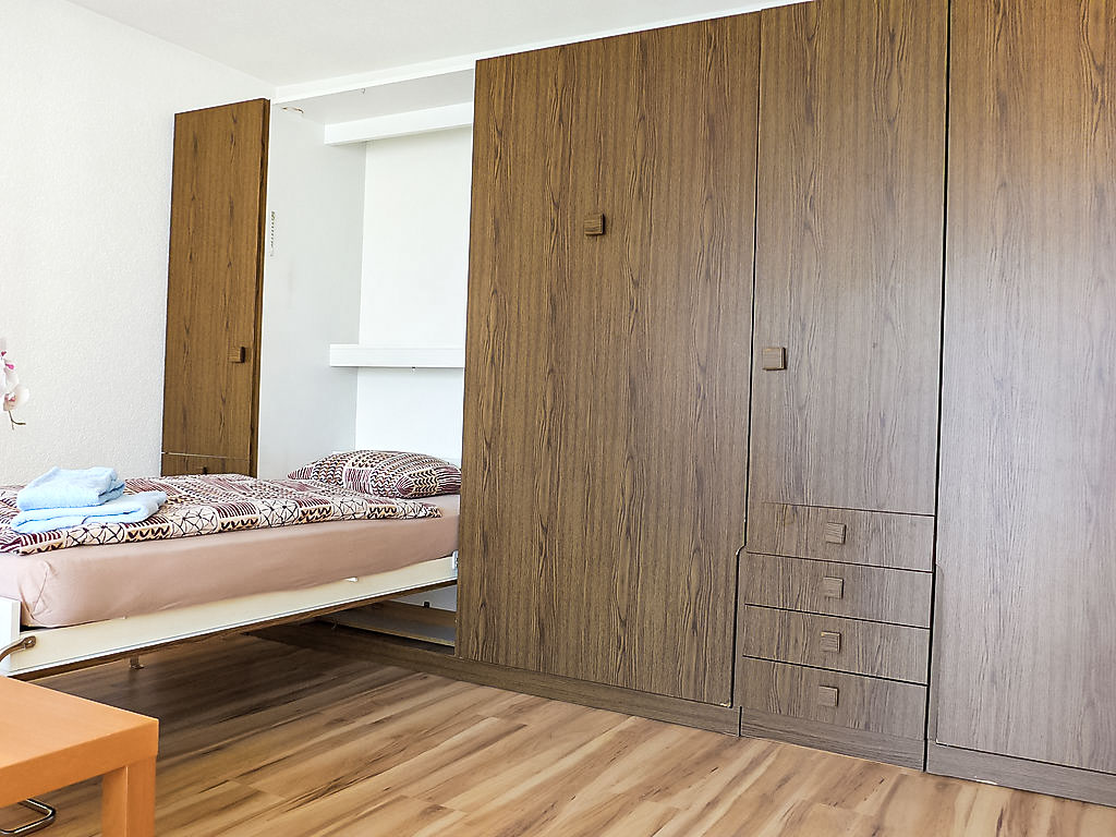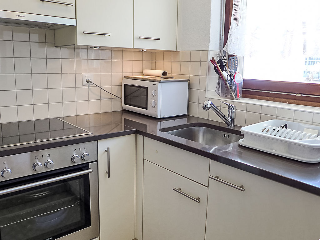 2-Zimmer-Wohnung 64 m2 im 1. Stock, Südlage. Hell, einfach und gemütlich eingerichtet: Wohn-/Schlafzimmer mit 3 Wandschrankbetten (90 cm, Länge 200 cm), TV. Ausgang zum Balkon, Richtung Süden. 1 Zimmer mit 1 Doppelbett (2 x 90 cm, Länge 200 cm). Küche (Backofen, 4 Glaskeramikherd Platten, Toaster, Wasserkocher, Mikrowelle, Tiefkühler, elektrische Kaffeemaschine, Racletteofen, Fondue Set (Käse)). Dusche/WC. Heizung. Grosser Balkon, Südlage und Westlage. Balkonmöbel. Schöne Sicht auf die Berge. Zur Verfügung: Haartrockner. Internet (Wireless LAN, gratis). Bitte beachten: Nichtraucher-Unterkunft.