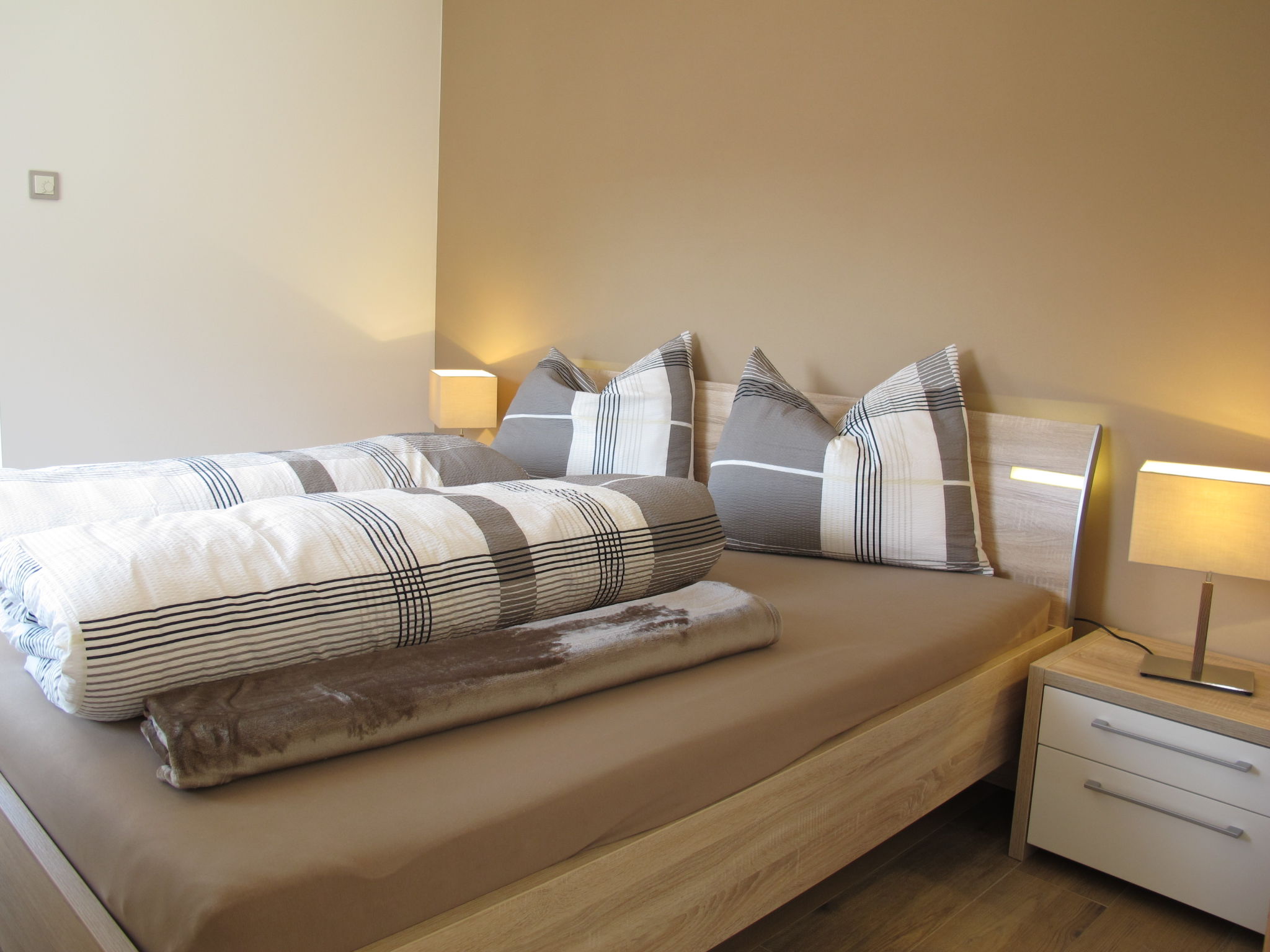 Bei Reservierung dieses Objektes mieten Sie das gesamte Haus. Die angegebenen Einrichtungen zur Mitbenutzung stehen Ihnen damit zur alleinigen Nutzung zur Verfügung. 3-Zimmer-Wohnung, Erdgeschoss, ca. 53 m². Wohn-/Schlafraum mit Bettcouch, Essplatz (Eckbank), Küchenzeile (4 Ceranfelder, Backofen, Mikrowelle, Geschirrspüler, Kühlschrank, kleiner Gefrierschrank, Kaffeemaschine, Wasserkocher, Toaster), Terrassenausgang. Doppelzimmer mit Terrassenausgang. Einzelzimmer (Bett 1,20 m breit). Dusche/WC. 3-Zimmer-Wohnung, Erdgeschoss, ca. 53 m². Wohn-/Schlafraum mit Bettcouch, Essplatz (Eckbank), offene Küche (4 Ceranfelder, Backofen, Mikrowelle, Geschirrspüler, Kühlschrank, kleiner Gefrierschrank, Kaffeemaschine, Wasserkocher, Toaster), Terrassenausgang. Doppelzimmer mit Terrassenausgang. Einzelzimmer (Bett 1,20 m breit). Dusche/WC. Externe, überdachte Treppe in 3-Zimmer-Wohnung, 1. Etage (offener Holzdachstuhl), ca. 63 m². Wohnraum mit Sitzcouch und Balkonausgang. Offene Küche (4 Ceranfelder, Backofen, Mikrowelle, Holzherd, Geschirrspüler, Kühlschrank, kleiner Gefrierschrank, Kaffeemaschine, Wasserkocher, Toaster) mit Theke (kleine Bank und 1 Barhocker) und Essecke. Schlafzimmer mit Doppelbett und Bettcouch, Balkonausgang. Schlafzimmer mit franz. Bett, Einzelbett und Balkonausgang. Dusche/WC. Es werden keine zusätzlichen Gebühren vor Ort fällig, ausgenommen der örtlichen Kurtaxe. Bettwäsche, Handtücher, Endreinigung und Stromkosten sind inkludiert.