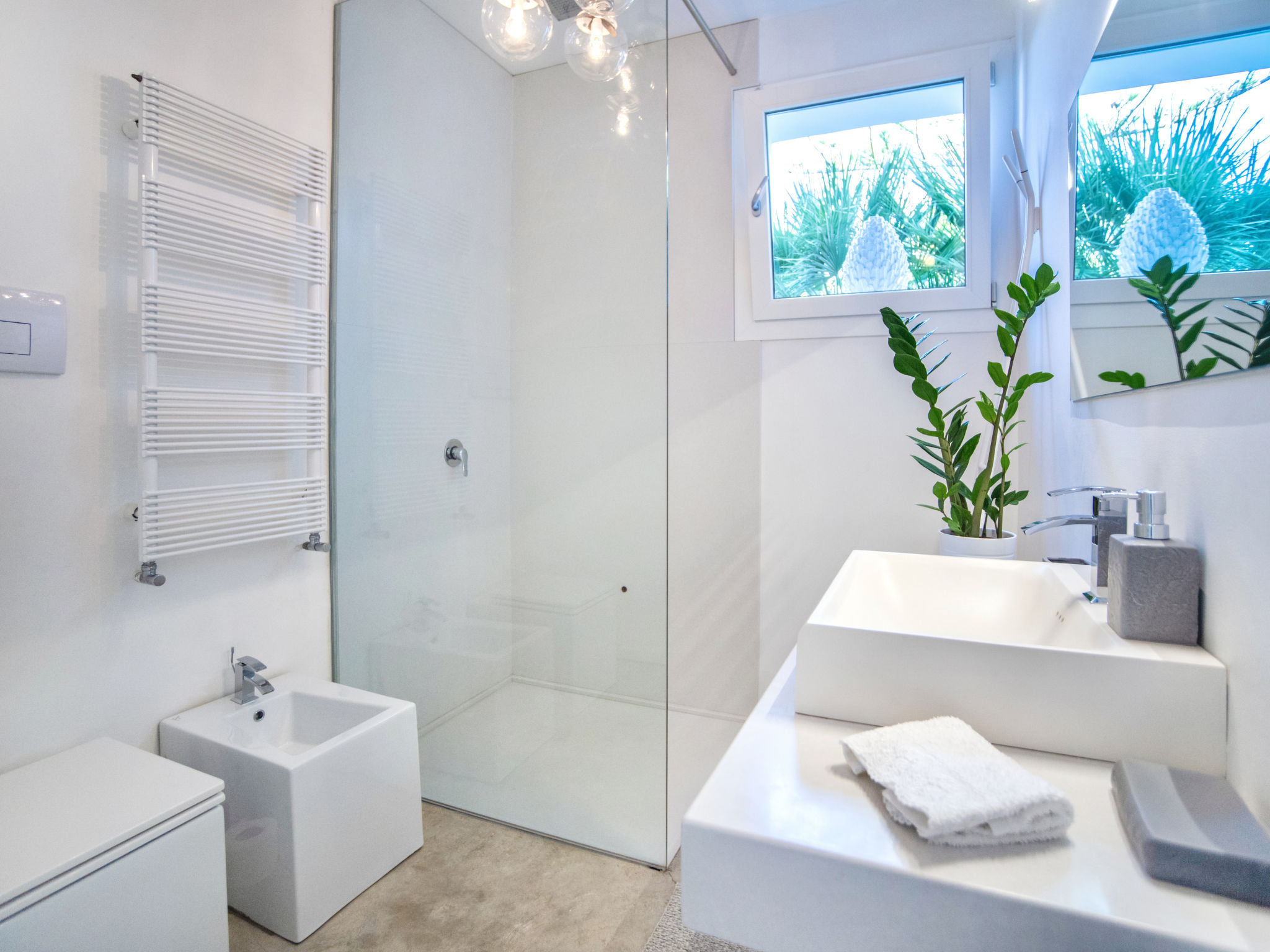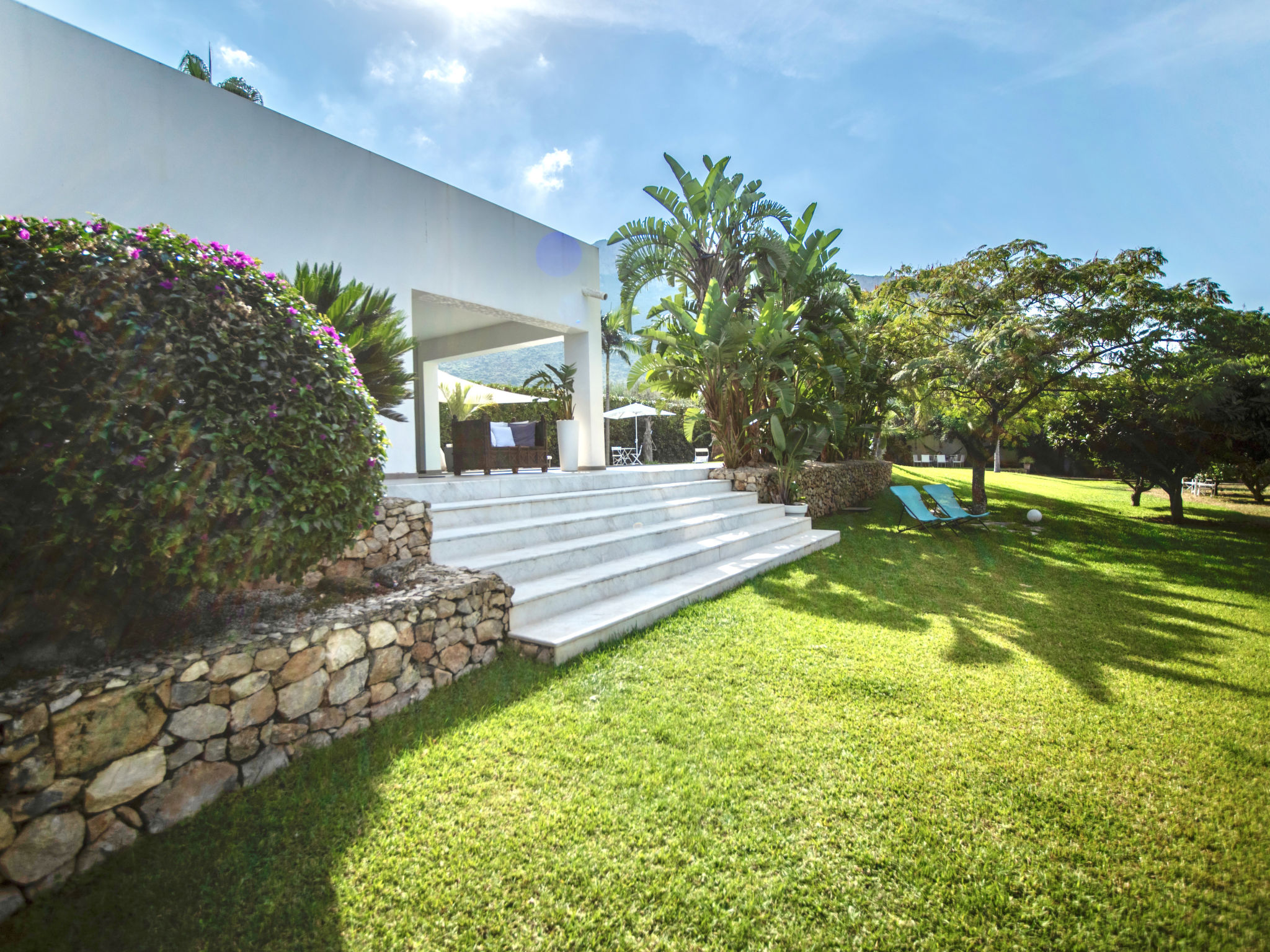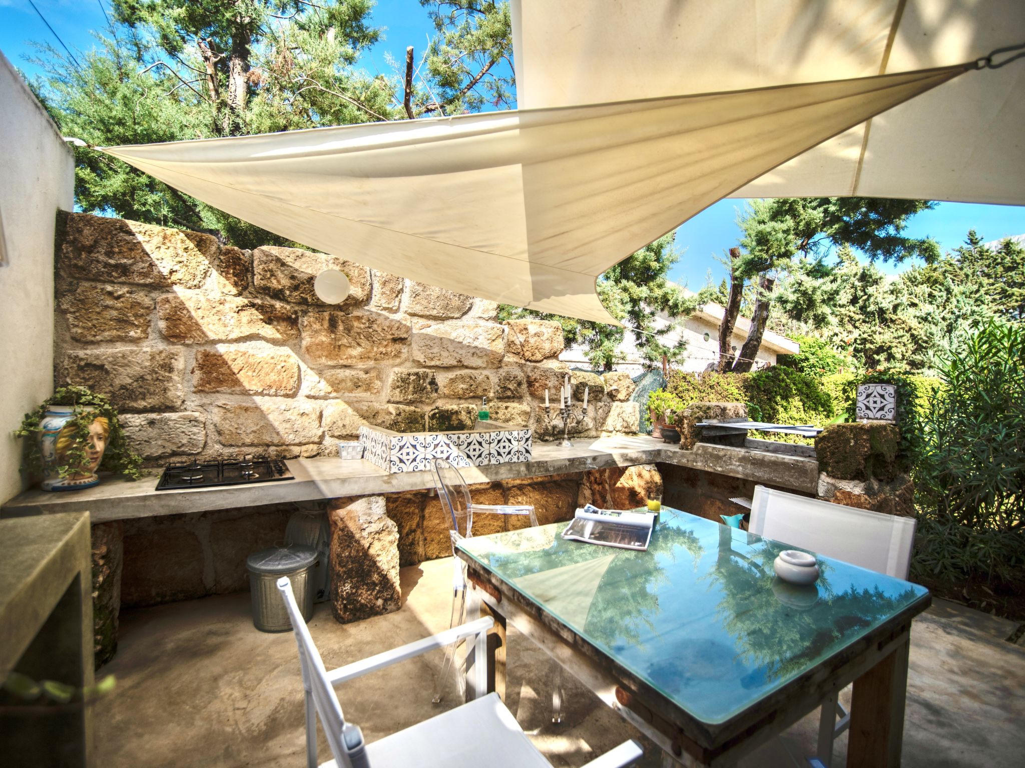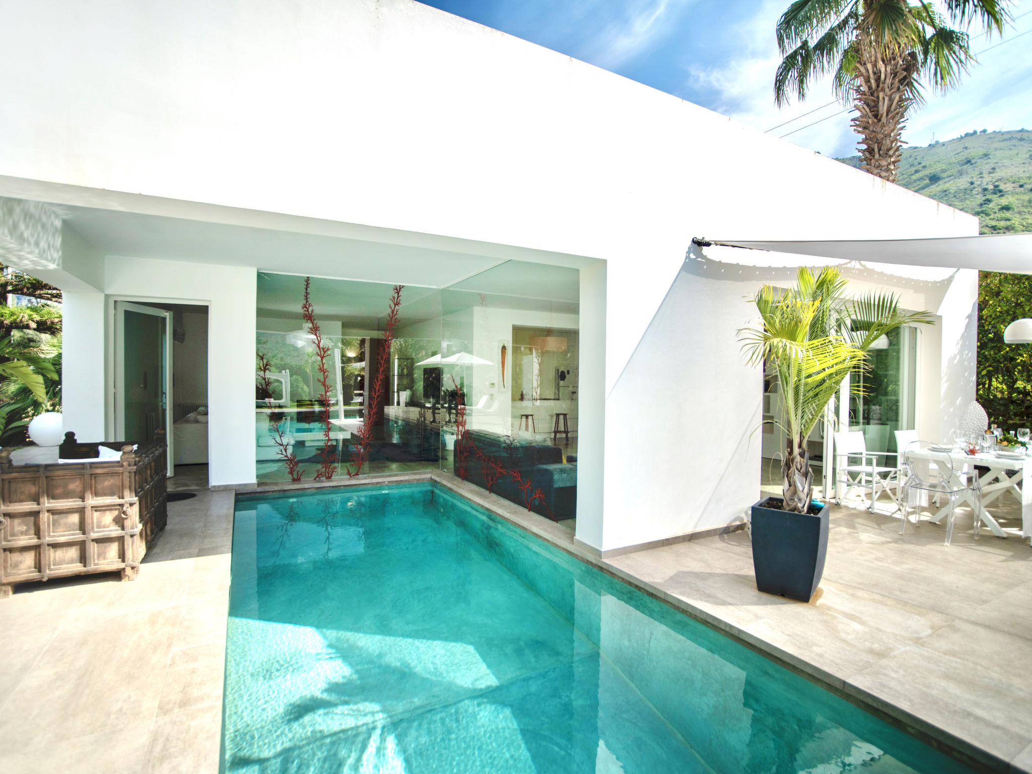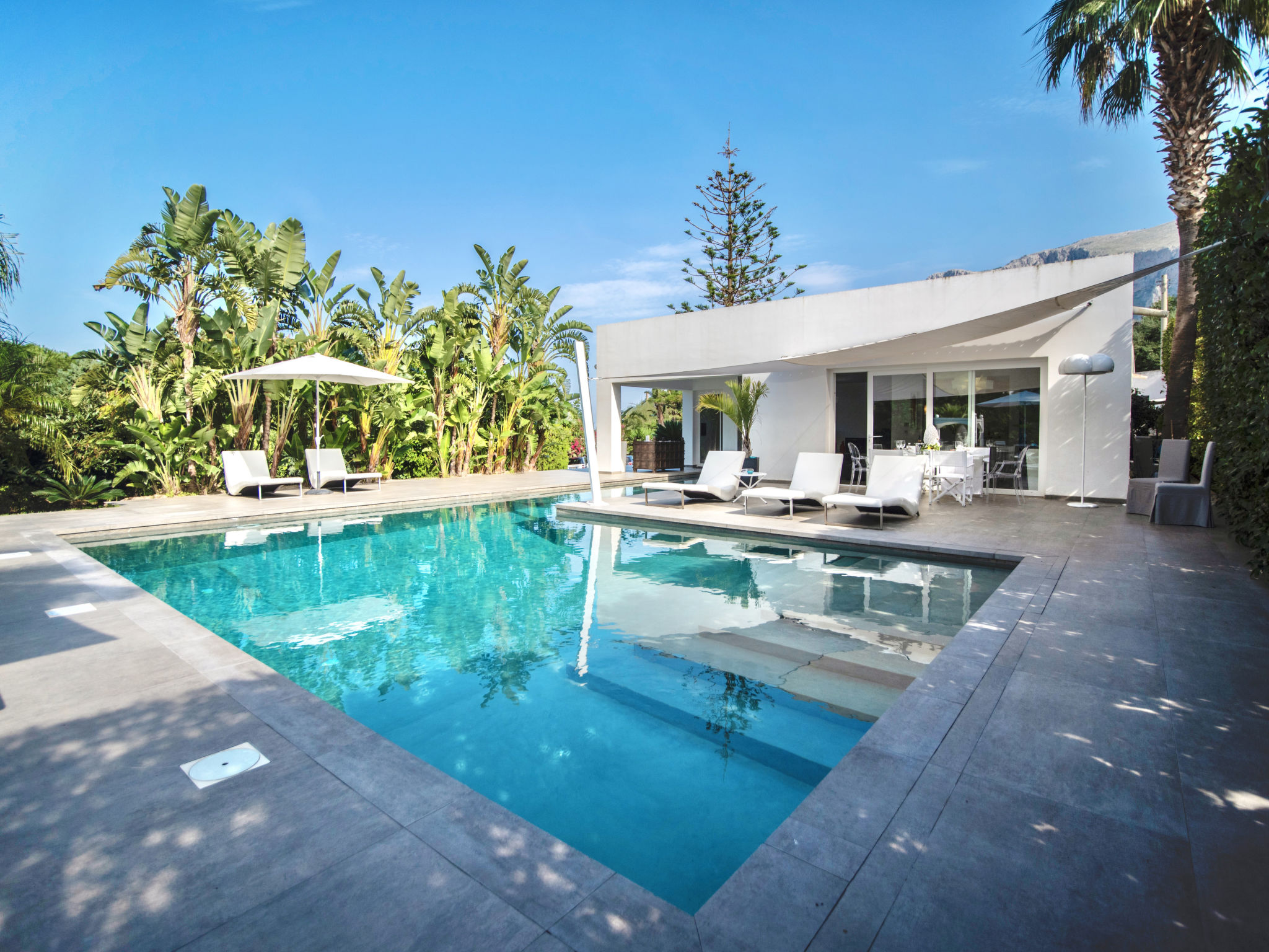 3-Zimmer-Villa 180 m2. Modern und stilvoll eingerichtet: grosses Wohnzimmer mit Panoramafenster mit Sat-TV (Flachbildschirm), Klimaanlage und Warmluftheizung. Ausgang zum Garten, zum Gartensitzplatz, zum Schwimmbad. 1 Doppelzimmer mit Dusche/Bidet/WC, Doppelwaschbecken, Klimaanlage und Warmluftheizung. Ausgang zum Garten. 1 Doppelzimmer mit Klimaanlage und Warmluftheizung. Ausgang zum Garten. Kochnische (5 Kochplatten, Backofen, Geschirrspüler, Toaster, Wasserkocher, Mikrowelle, Tiefkühler, elektrische Kaffeemaschine, Kochinsel). Dusche/Bidet/WC. Gartensitzplatz 10 m2, teilweise überdacht. Terrassenmöbel, Gartengrill, Liegestühle. Sicht auf das Schwimmbad und den Garten. Zur Verfügung: Waschmaschine, Bügeleisen, Kinderhochstuhl, Babybett bis 2 Jahre, Haartrockner. Internet (Wireless LAN, gratis). Parkplatz. Maximal 1 Haustier/Hund erlaubt. Die Villa wird auch von einer Außenküche (4 Brenner) serviert.
