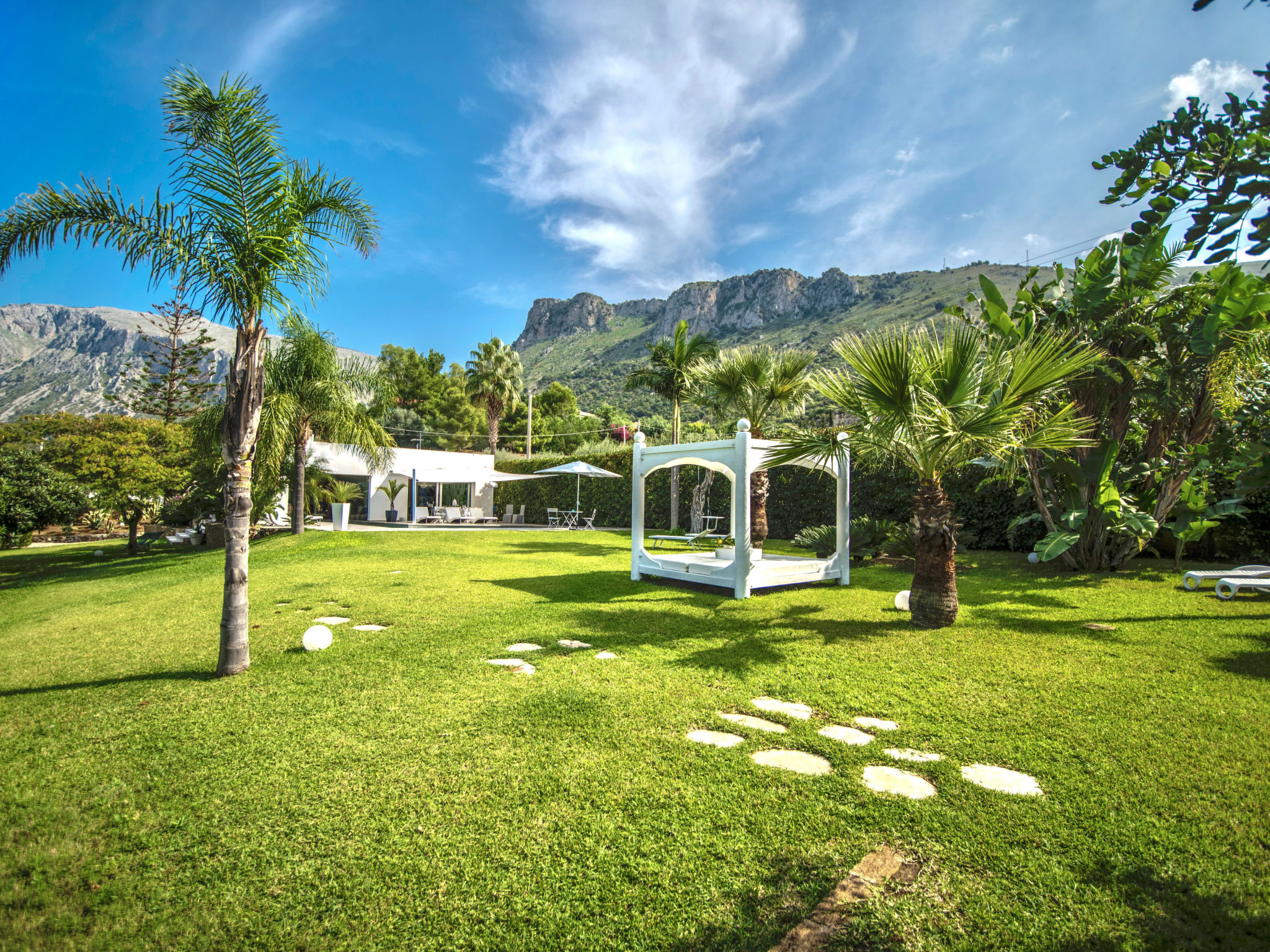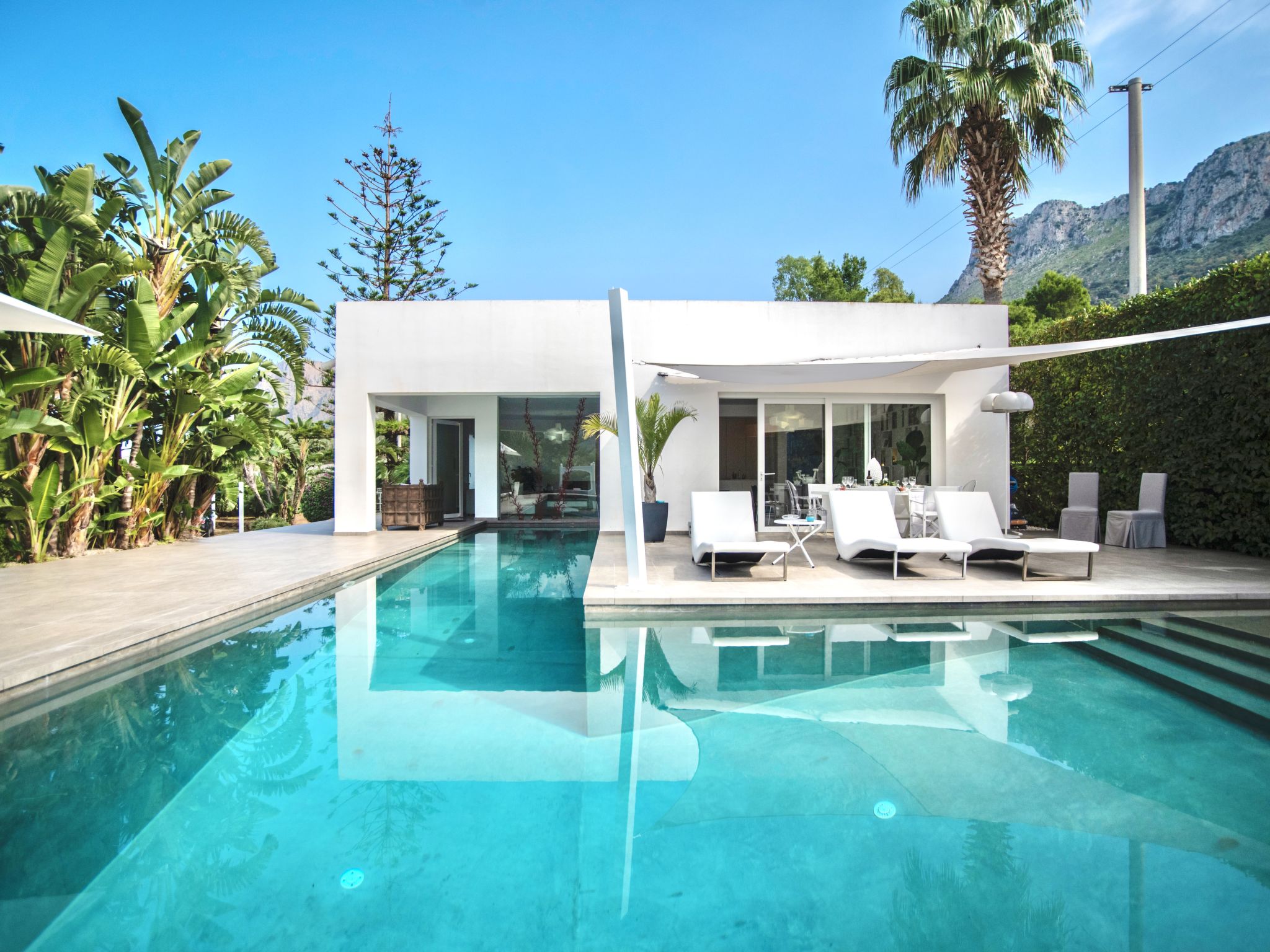 Villa "Re di Denari". 3 km vom Zentrum von Terrasini, sonnige Lage im Villenviertel, 3 km vom Meer. Zur Alleinbenutzung: Grundstück 1'000 m2 (eingezäunt), Garten, Schwimmbad (16 x 8 m, 120 - 350 cm tief, 01.04.-31.10.). Gartenmöbel, Grill, Poolpflege durch den Besitzer/Gärtner. Zur Verfügung: Fahrräder (2) (extra). Parkplatz auf dem Grundstück. Lebensmittelgeschäft 3 km, Supermarkt 1.5 km, Restaurant 2 km, Bar 2 km, Sandstrand "La Priola" 3 km, Steinstrand "Cala Rossa" 4 km. Nahe gelegene Sehenswürdigkeiten: Palermo 40 km, Segesta Parco Archeologico 43 km, Erice 70 km, Trapani/Aliscafi per Isole Egadi 73 km, San Vito lo Capo 75 km, Saline di Marsala 85 km. Bitte beachten: Fahrzeug empfohlen.