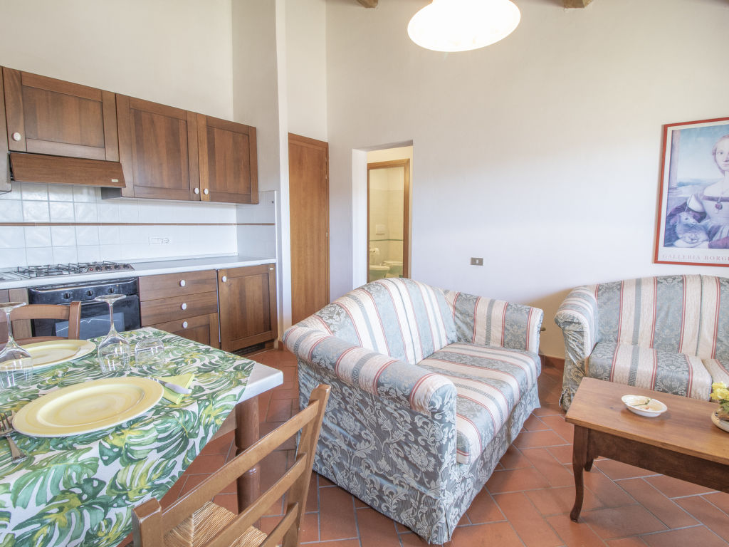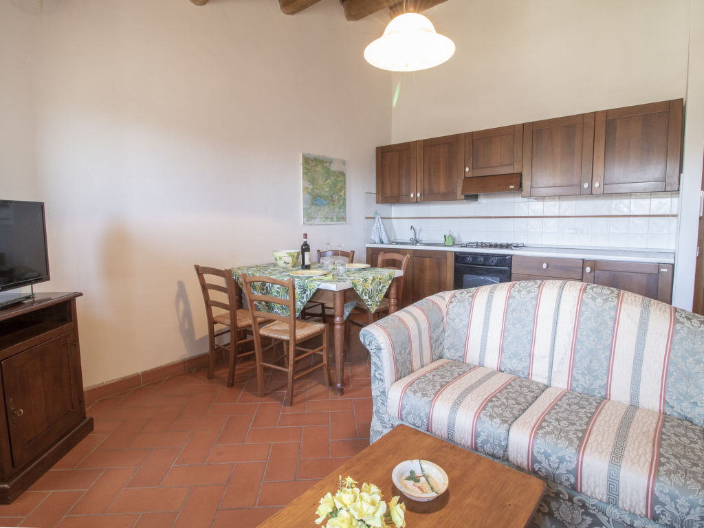 2-Zimmer-Wohnung 47 m2 im 1. Stock. Zweckmässig und rustikal eingerichtet: Wohn-/Esszimmer mit Küchenblock und TV (Flachbildschirm). 1 Doppelzimmer. Kochnische (4 Kochplatten, Backofen). Dusche/Bidet/WC. Garten. Panoramasicht auf die Landschaft.