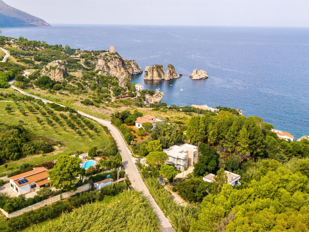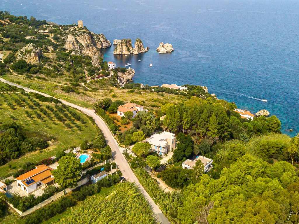 Villa "La Vela". Mietobjekt bestehend aus Haupt- und Nebengebäude, im Weiler Scopello, 10 km vom Zentrum von Castellammare del Golfo, ruhige, sonnige Lage im Villenviertel, 150 m vom Meer. Zur Alleinbenutzung: Grundstück 1'000 m2 (eingezäunt), Schwimmbad (8 x 4 m, 150 cm tief, 01.04.-31.10.). Ungleichmässige Schwimmbadform, Terrasse, Gartenmöbel, Grill, Poolpflege durch den Besitzer/Gärtner Parkplatz auf dem Grundstück. Lebensmittelgeschäft 1 km, Supermarkt 1 km, Restaurant 1 km, Bar 1 km, Sandstrand "Castellammare del Golfo" 10 km, Felsstrand "Scopello" 150 m. Nahe gelegene Sehenswürdigkeiten: Segesta Parco Archeologico 29 km, Trapani/Aliscafi per Isole Egadi 35 km, Erice 35 km, San Vito lo Capo 42 km, Marsala /Saline 58 km, Palermo 70 km. Bitte beachten: Fahrzeug empfohlen.
