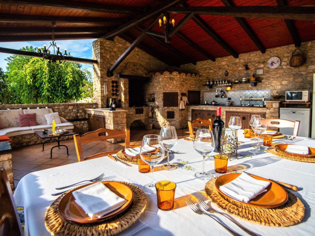 8-Zimmer-Villa 320 m2 auf 2 Stockwerken. Komfortabel und geschmackvoll eingerichtet: grosses Wohnzimmer mit offenem Kamin und Sat-TV (Flachbildschirm), DVD. Ausgang zum Gartensitzplatz. Esszimmer. Ausgang zum Gartensitzplatz. 1 Doppelzimmer mit Dusche/Bidet/WC. 1 Doppelzimmer. Küche (4 Kochplatten, Backofen, Geschirrspüler, Toaster, Wasserkocher, Mikrowelle, Tiefkühler) mit Esstisch, TV. Bad/Bidet/WC. Obergeschoss: (Leiter) offenes Wohnzimmer. 1 Doppelzimmer mit Klimaanlage und Warmluftheizung. 2 Zimmer, jedes Zimmer mit 2 Betten, Klimaanlage und Warmluftheizung. Dusche/Bidet/WC. Grosser Gartensitzplatz 60 m2, überdacht. Terrassenmöbel, Gartengrill, Liegestühle. Sicht auf das Schwimmbad und den Garten. Zur Verfügung: Waschmaschine, Safe, Bügeleisen, Kinderhochstuhl, Babybett bis 2 Jahre (extra), Haartrockner. Internet (Wireless LAN, gratis). Parkplatz (2 Autos). Die Villa ist mit einer überdachten Außenküche ausgestattet: 4 Brenner, Holzofen, Kühlschrank, Esstisch.