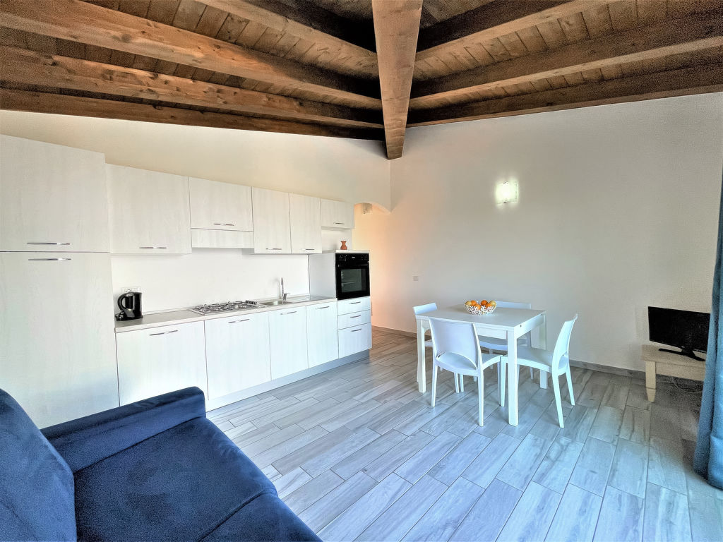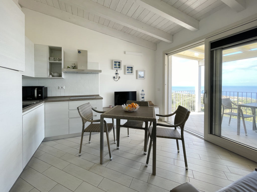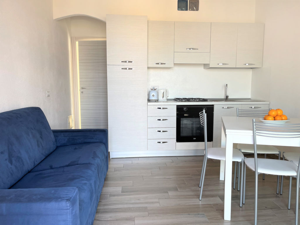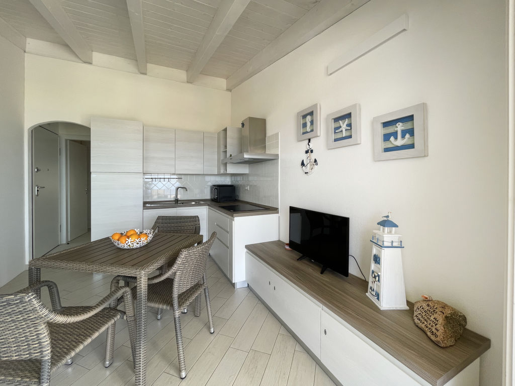 2-Zimmer-Wohnung 35 m2. Sehr schön und modern eingerichtet: Wohn-/Schlafzimmer mit Panoramafenster mit 1 Doppeldiwanbett und TV. Ausgang zur Terrasse. 1 Doppelzimmer. Kochnische (4 Kochplatten, Tiefkühler). Dusche/Bidet/WC. Terrassenmöbel. Schöne Sicht auf das Meer. Zur Verfügung: Waschmaschine. Geeignet für Familien. 1 Haustier/Hund erlaubt.